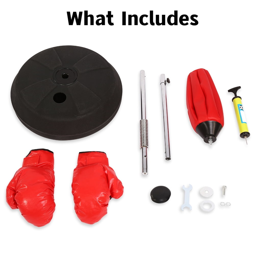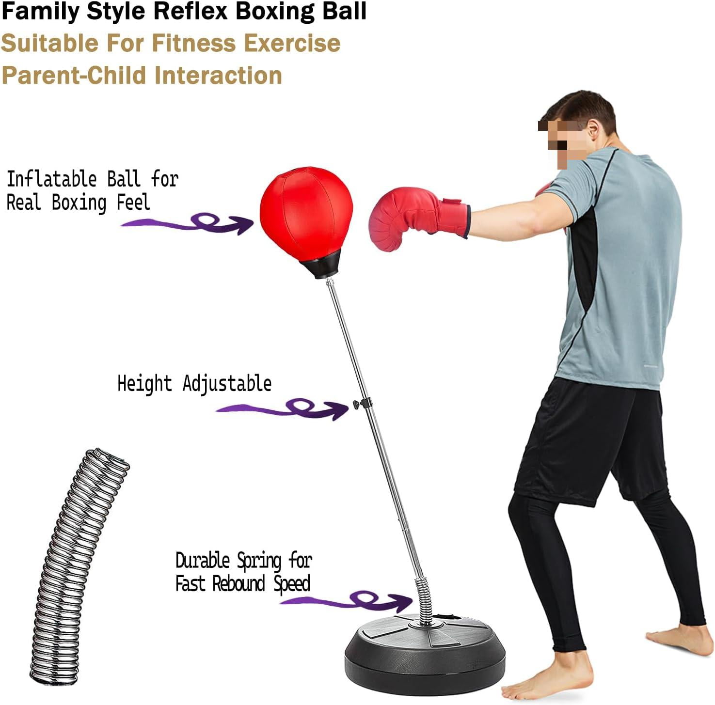 Punch All Your Pressure Out: Boxing is a great sport for pressure release; it helps the body’s blood circulation, speeding up the flow of body function, which will make the body healthier. And boxing will be a great improvement in your responsiveness and physical sensitivity. Height Adjustable: This punching bag can be adjusted between 49” to 55″ to meet people at different heights. So it will be perfect for family use and gym use. This freestanding punching ball speed bag is suitable for adults. Solid Base & Handle for Your Safety: The strong base ensures its durability and your safety at the same time. The handle on the bottom enables you to place this punching bag anywhere you want and then simply fill the freestanding heavy-duty base with water or sand for stability. Quick & Easy Setup: Ball surface is made of PE and PVC leather that is soft and elastic. Durable spring has the feature of a high rebound, providing more comfortable use. Included a hand pump, which is easier to inflate, and boxing gloves will avoid injury to your hand. Portable Design& Great Holiday Gift: This punching bag can disassemble into compact size that is convenient for you to store after finishing boxing. Apart from that, this standing punching bag is a great gift for adults. Punch All Your Pressure Out: Boxing is a great sport for pressure release; it helps the body’s blood circulation, speeding up the flow of body function, which will make the body healthier. And boxing will be a great improvement in your responsiveness and physical sensitivity. Height Adjustable: This punching bag can be adjusted between 49” to 55″ to meet people at different heights. So it will be perfect for family use and gym use. This freestanding punching ball speed bag is suitable for adults. Solid Base & Handle for Your Safety: The strong base ensures its durability and your safety at the same time. The handle on the bottom enables you to place this punching bag anywhere you want and then simply fill the freestanding heavy-duty base with water or sand for stability. Quick & Easy Setup: Ball surface is made of PE and PVC leather that is soft and elastic. Durable spring has the feature of a high rebound, providing more comfortable use. Included a hand pump, which is easier to inflate, and boxing gloves will avoid injury to your hand. Portable Design& Great Holiday Gift: This punching bag can disassemble into compact size that is convenient for you to store after finishing boxing. Apart from that, this standing punching bag is a great gift for adults.