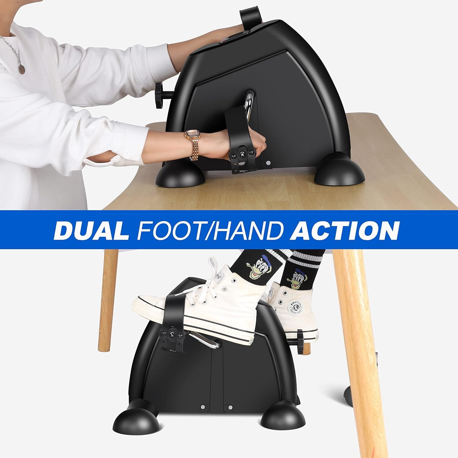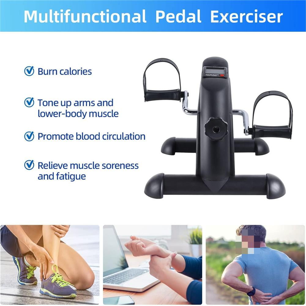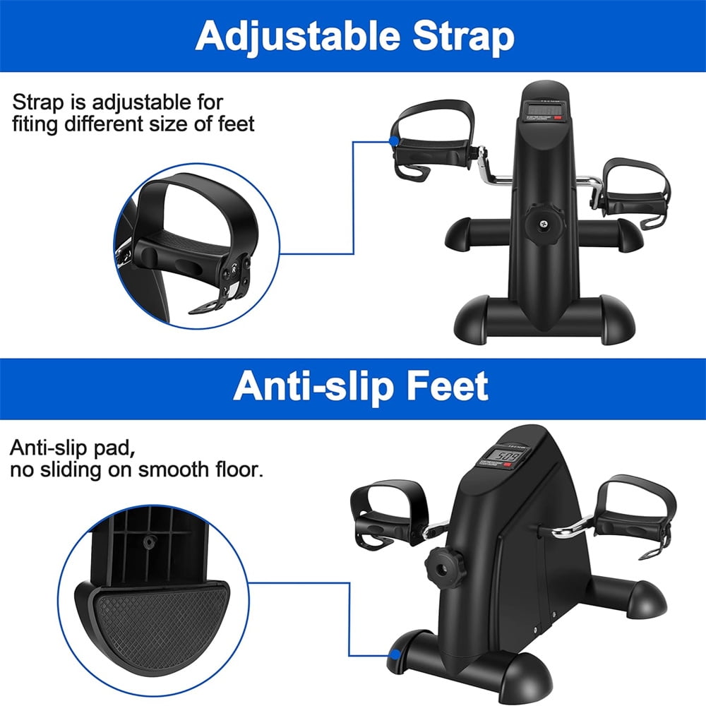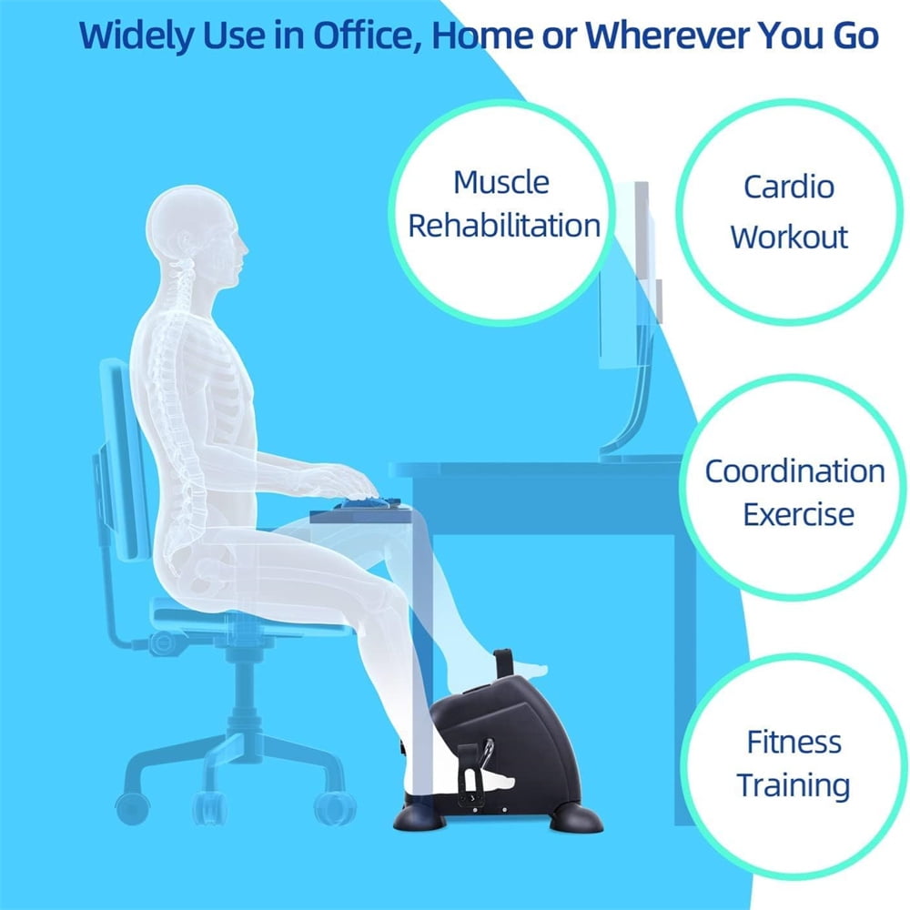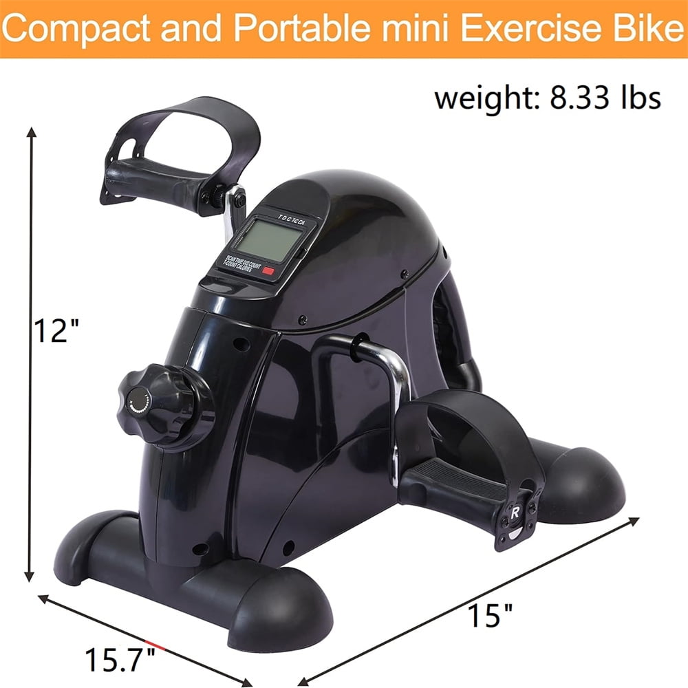 STATIONARY BIKES FOR HOME This under desk cycle combining arm and leg exercises, not only allows you to exercise to the muscles and joints of the knees, ankles, feet, but also can be served on the table to exercise the arms, wrists, shoulders and other joints. It is served for office workers, elderly people, people with sports injuries, and rehabilitators to do physical therapy to relieve pain, restore and maintain motor function. MULTIPLE STABILITY DESIGN Weighing only 8.33 pounds, This under desk bike pedal exerciser supports one-handed hold and release with non-slip pedals as well as non-slip feet for stability during exercise, and adjustable four-hole straps serve to protect both feet and hands for added comfort and safety, making it ideal for home use. NON-SLIP PEDALS This desk exercise equipment features non-slip rubber feet pads for added stability and to stop the mini bike from sliding when in use. Non-slip grips on the exercise bike pedals prevent hands and feet from slipping. ADJUSTABLE RESISTANCE The adjustable resistance knob of the exercise mini bike can meet different physical conditions and bring a personalized experience. No noise is made during exercise, which is great for beginners with this low impact exercise, ideal for rehabilitation after surgery or injury. Specially designed for the elderly and rehabilitators. MULTI-FUNCTIONAL DISPLAY The multi-function digital display can display time, distance, total count and calories through the buttons in use. Helps increase strength, improve coordination and circulation. Large and easy-to-read display can keep track of your workout progress easily and allow you to read all data clearly. PORTABLE AND EASY TO STORE Lightweight design, portable and easy to assemble. The portable handle function makes the fitness exercise bike always ready. Product size: 15″ x 15.7″ x 12″(LxWxH). You can put it under the desk, beside the sofa or in the locker. Small size and space saving – can be served at home or office. Specification: Material: Stainless Steel + Plastic Main Color: Black/White Size: 15″ x 15.7″ x 12″(LxWxH) Weight: 8.33 lbs Power supply for electronic watch: 1 x AAA battery(not included battery) Package List: 1 x Main body 2 x Pedal 2 x Front and rear pads 1 x Instruction 5 x Screw 5 x Gasket 2 x Tools