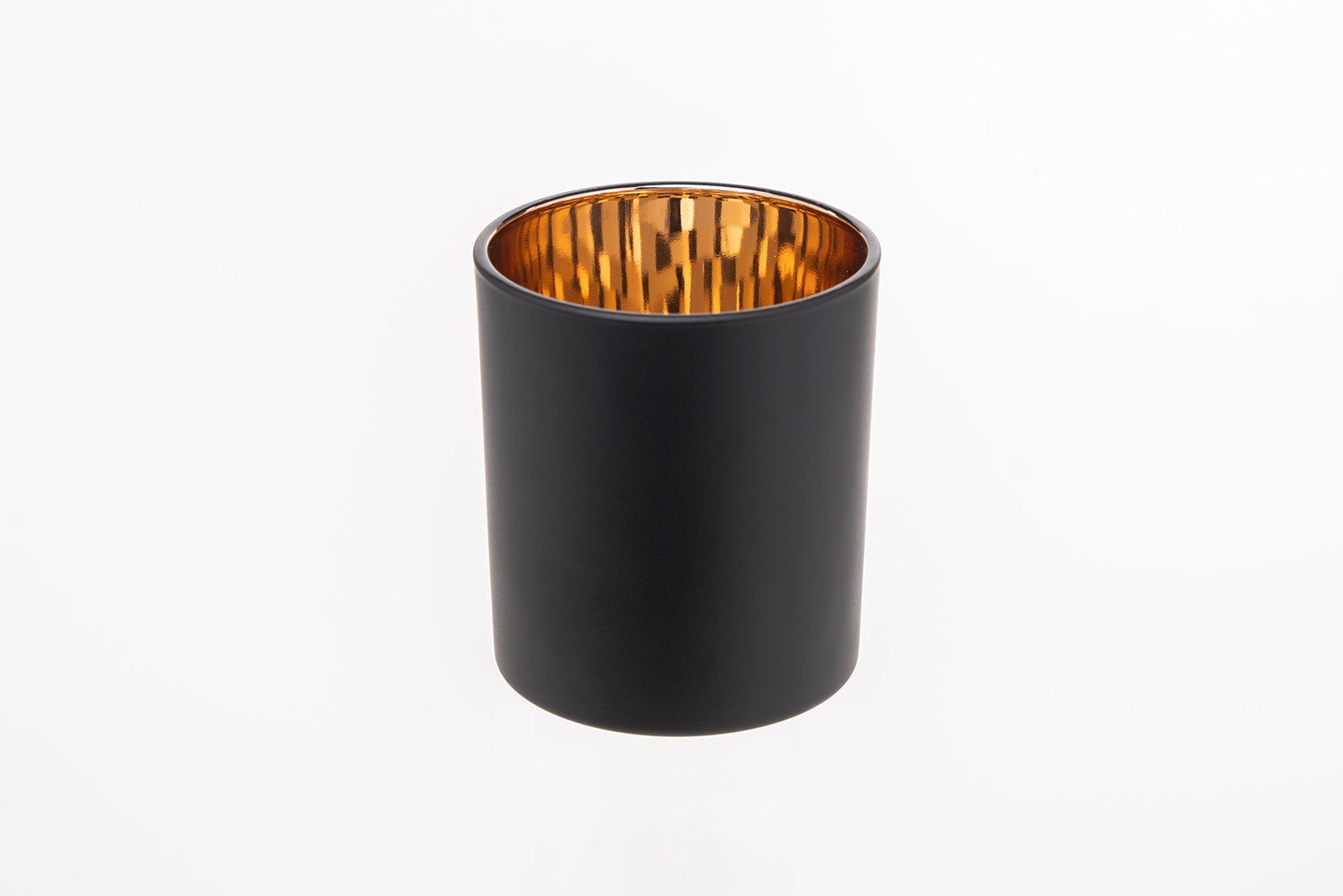 Specs& Features: 10 oz candle jars 12 pack Electroplated Copper Gold inside and Matte Black outside Dimensions: 3.55”H/3.15”Dia Made of Premium Glass Perfect Vessel For Candle Making Reflective Empty Containers For Candle Manufacturing or Storage. Very durable Anti-scratch Rub-resistant Food grade product Passes thermal shocking and annealing tests
