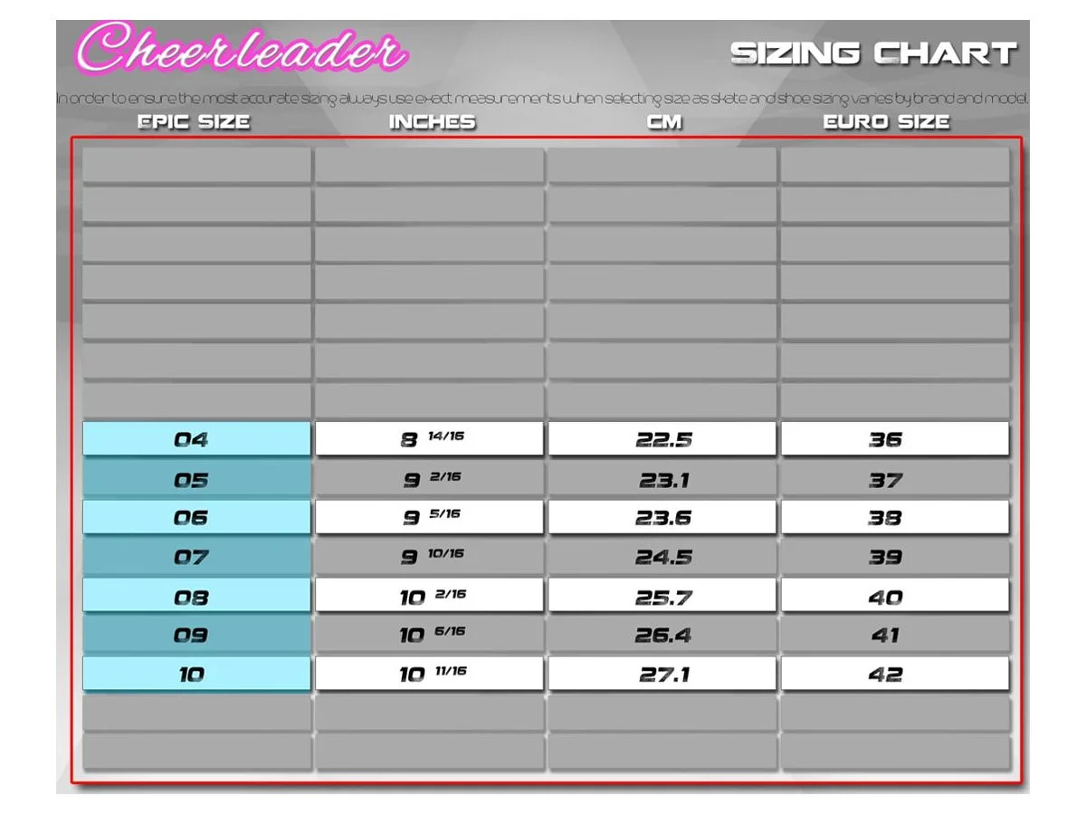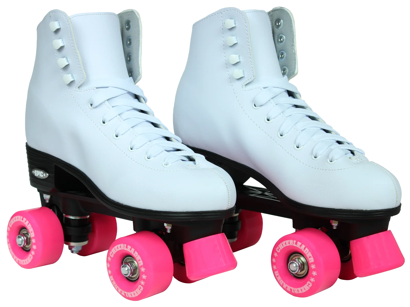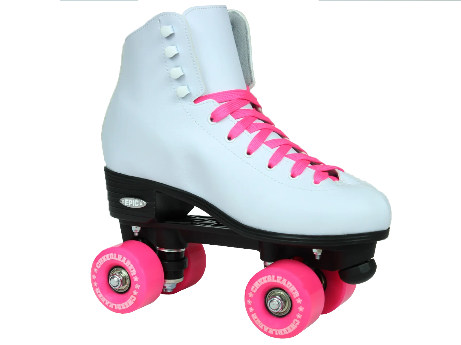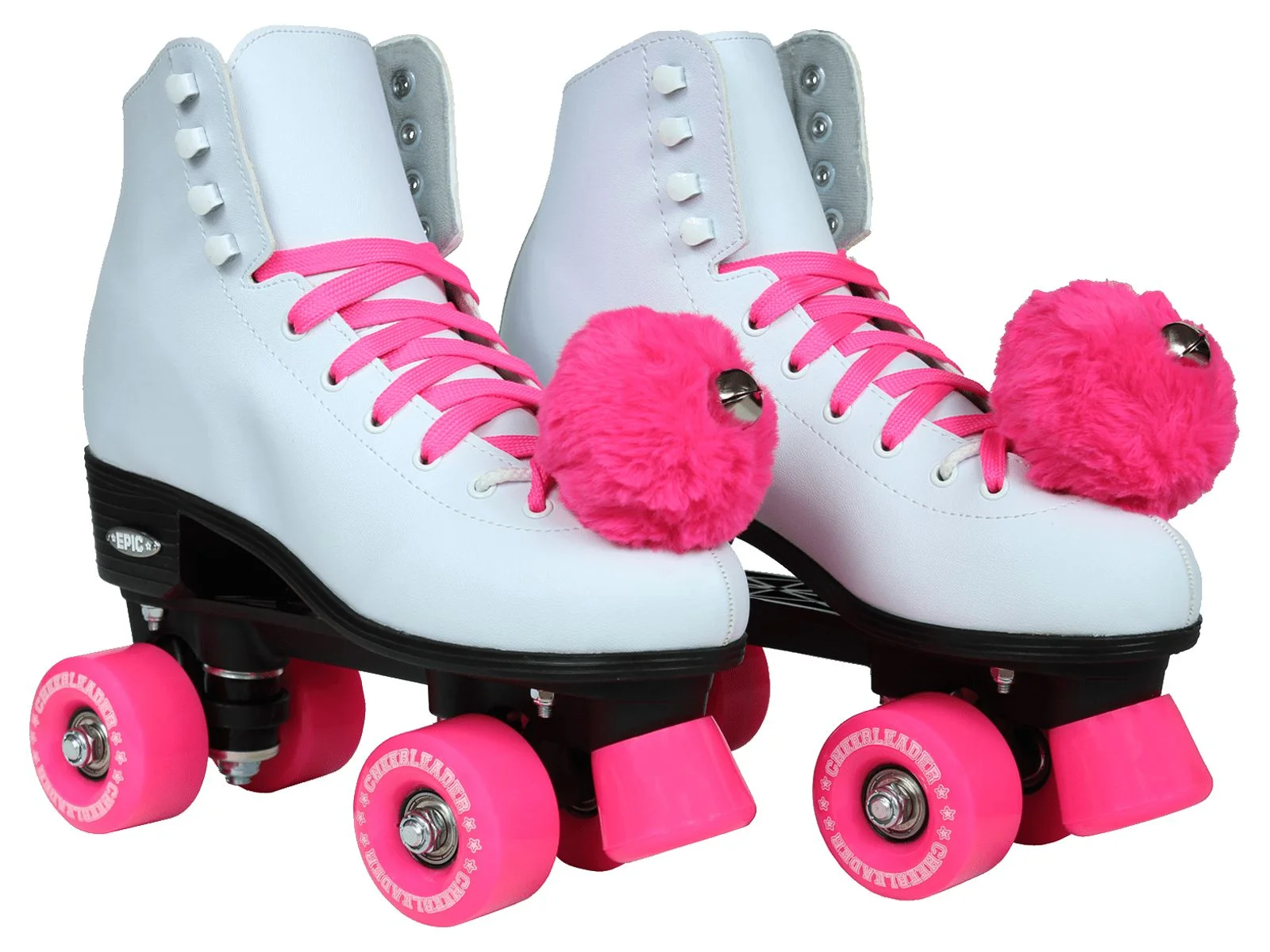These classic style Epic Cheerleader Quad Roller Skates feature both toe stops and toe plugs. The comfort fit 3/4 cut boot sits atop the Epic nylon plate featuring oversides PU cushions for better control. The 58mm Epic Cheerleader wheels come standard with ABEC 5 bearings and are ready to roll either indoors or outdoors. Epic Cheerleader Pink Quad Roller Skates are a great choice if you are looking for quality, affordability, & a classic quad roller skate design for women. The Epic Cheerleader roller skates come standard with two sets of laces in addition to the pink pom poms, Pink 58mm Indoor/Outdoor Polyurethane wheels, ABEC 5 bearings and Epic nylon plates. Epic Cheerleader Boots – White w/ Black Sole – Classic High Top Design for extra ankle protection – Comfortable Man Made Uppers Epic Nylon Plates with both Fixed Toe Stops & Toe Plugs Epic Pink Cheerleader Wheels – 58mm – For indoor or outdoor use Epic ABEC-5 8mm Precision Bearings Set includes: White Quad Skates with Pink Wheels & Toe Stop, 2 Pair of Laces (Pink & White), Set of Pink Pom Pom with Jingle Bell & a Set of Black Epic Toe Plugs Brand: Epic Model: Cheerleader Material: Nylon Color: White, Pink Dimensions: 16 inches long x 16 inches wide x 16 inches high Weight: 7 pounds
