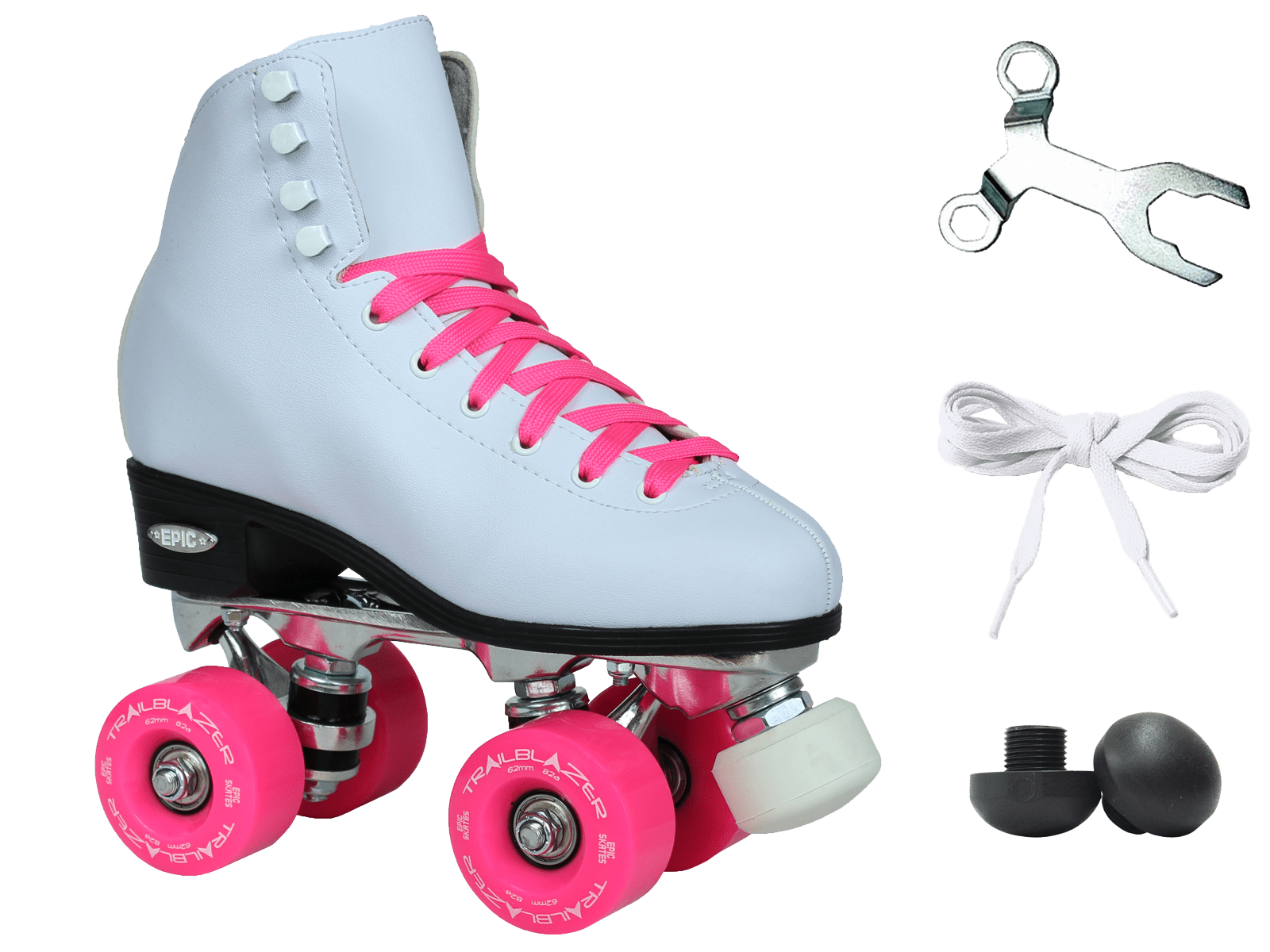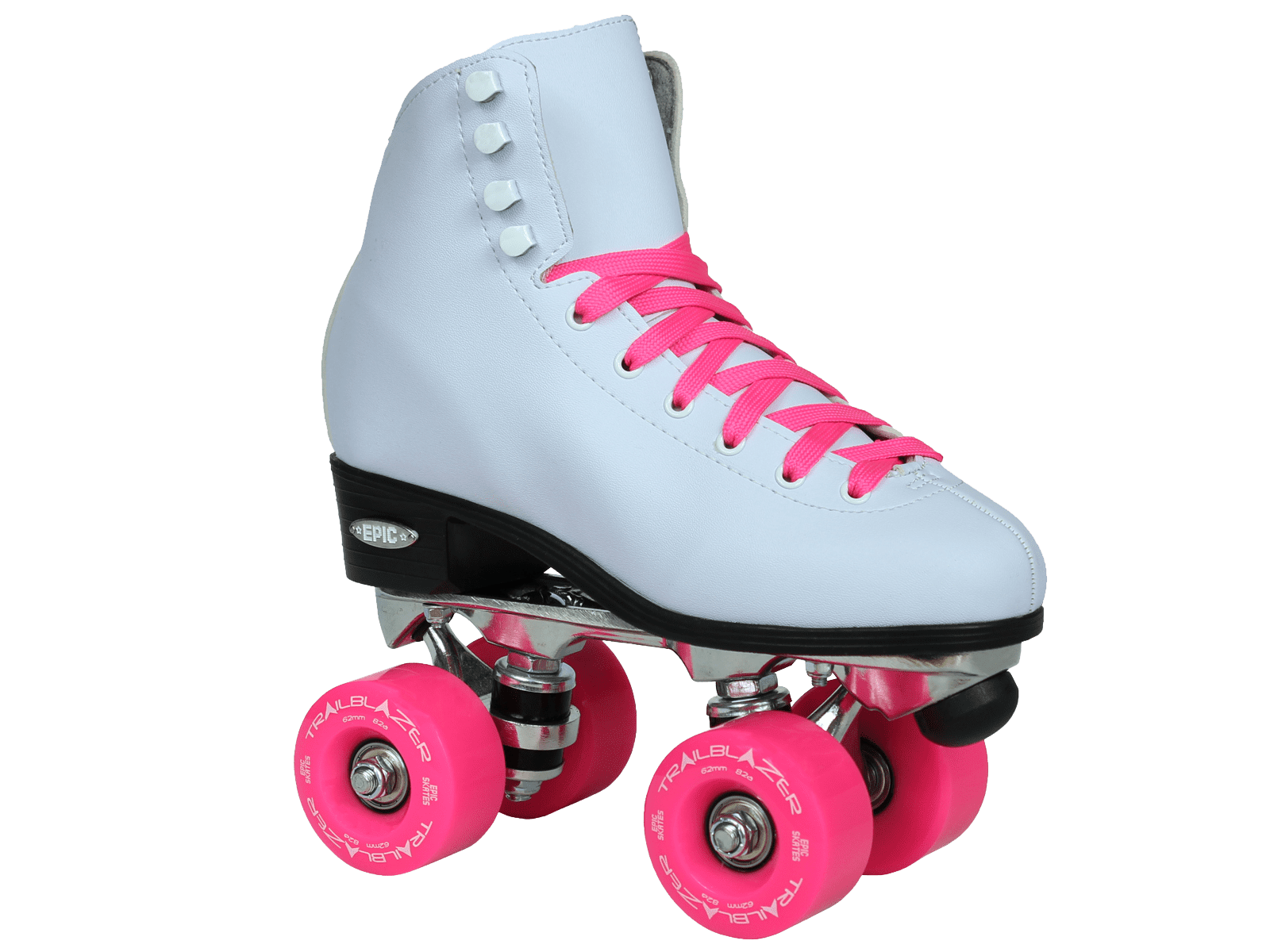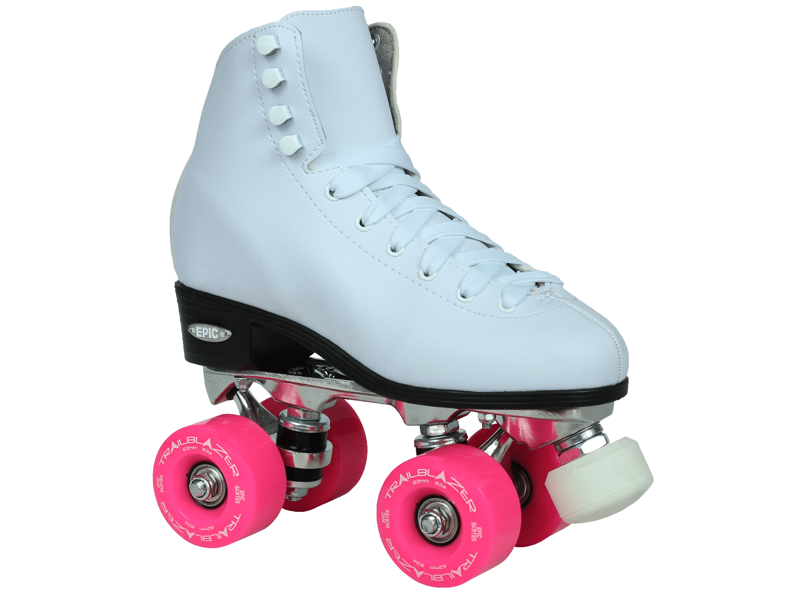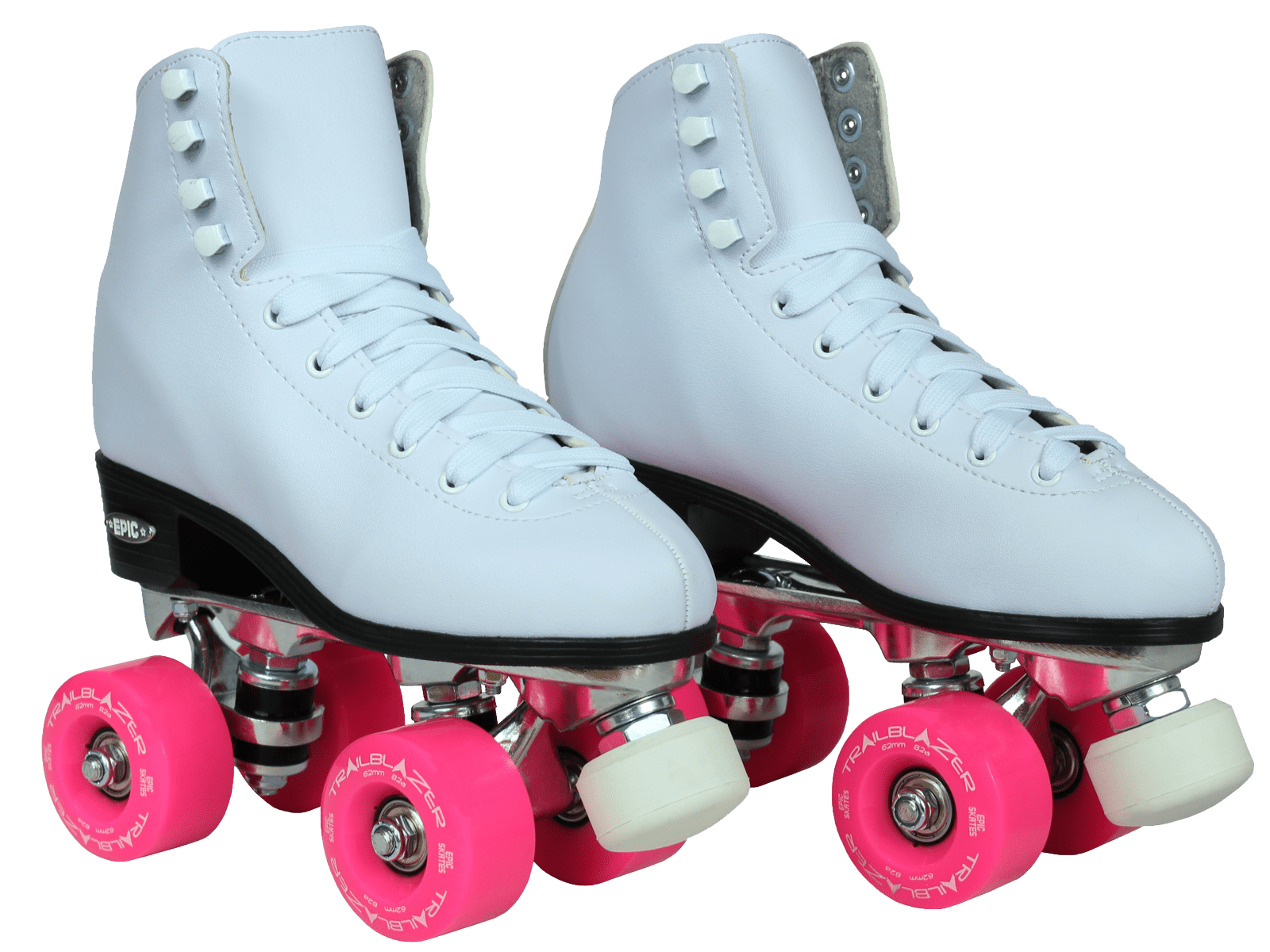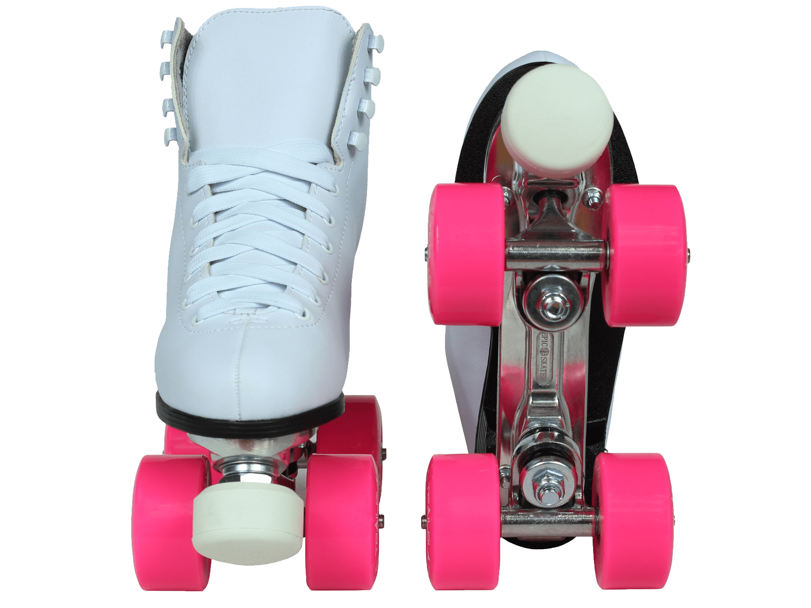 Epic Classic White and Pink Quad Roller Skates: Classic roller skate design Comfortable man-made uppers All white boot with black sole Plates: Epic aluminum Lightweight aluminum Double action trucks Pink cushions Wheels: Epic trailblazer Outdoor quad roller skate wheels Polyurethane compound Pink For use on outdoor surfaces Bearings: Epic ABEC-5 8mm axle size Precision speed bearings Toe stops: Epic fixed toe stops Non-adjustable toe stops Non-marking compound Pink Epic skates run true to size For more information regarding sizing please visit our website at or contact us directly