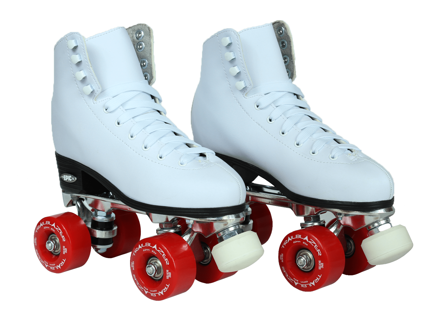 Epic Classic White and Red Quad Roller Skates: Classic roller skate design Comfortable man-made uppers All white boot with black sole Plates: Epic aluminum Lightweight aluminum Double action trucks Red cushions Wheels: Epic trailblazer Outdoor quad roller skate wheels Polyurethane compound Red For use on outdoor surfaces Bearings: Epic ABEC-5 8mm axle size Precision speed bearings Toe stops: Epic fixed toe stops Non-adjustable toe stops Non-marking compound Red Epic skates run true to size For more information regarding sizing please visit our website at or contact us directly