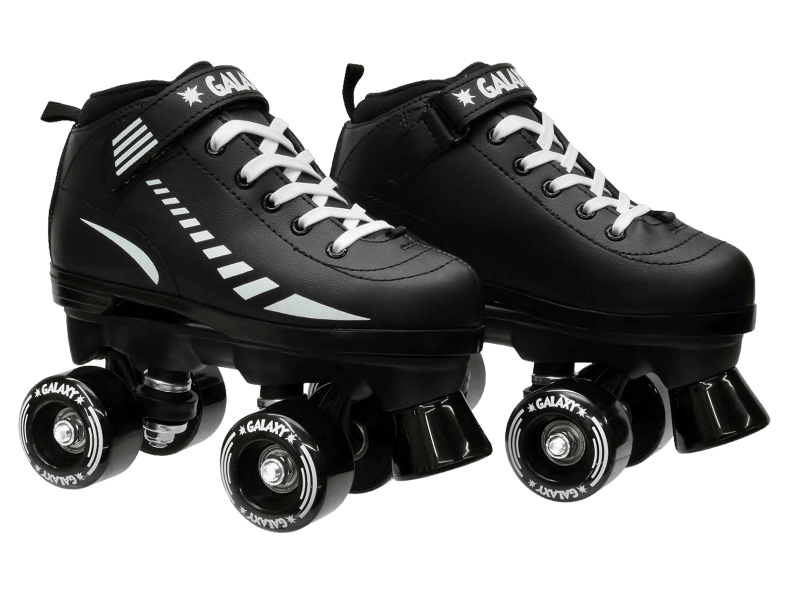 Epic Galaxy Elite Black Quad Roller Skates: Comfortable padded boot Mid-top boot design Colorful man-made uppers Black with white highlights Plates: Epic nylon: Lightweight nylon Double action trucks Black with black cushions Wheels: Epic Galaxy Quad Roller Skate Wheels Polyurethane compound Black with white For use on indoor and outdoor surfaces Bearings: Epic ABEC-3: 8mm axle size Precision speed bearings Toe stops: Epic Fixed Toe Stops: Non-adjustable toe stops Non-marking compound Black Sizing: kids’ sizes: Epic Skates run true to size For more information regarding sizing please visit our website at or contact us directly