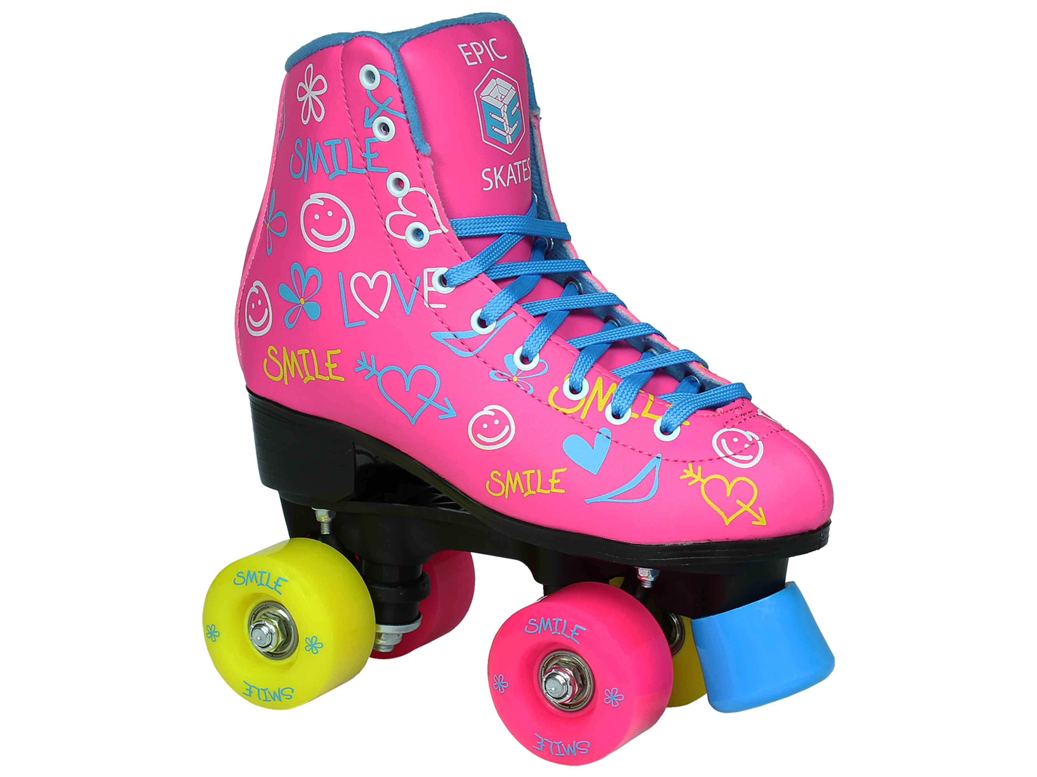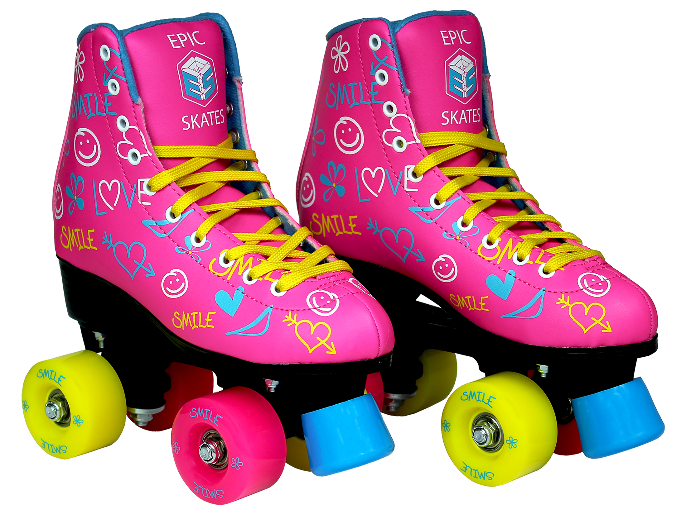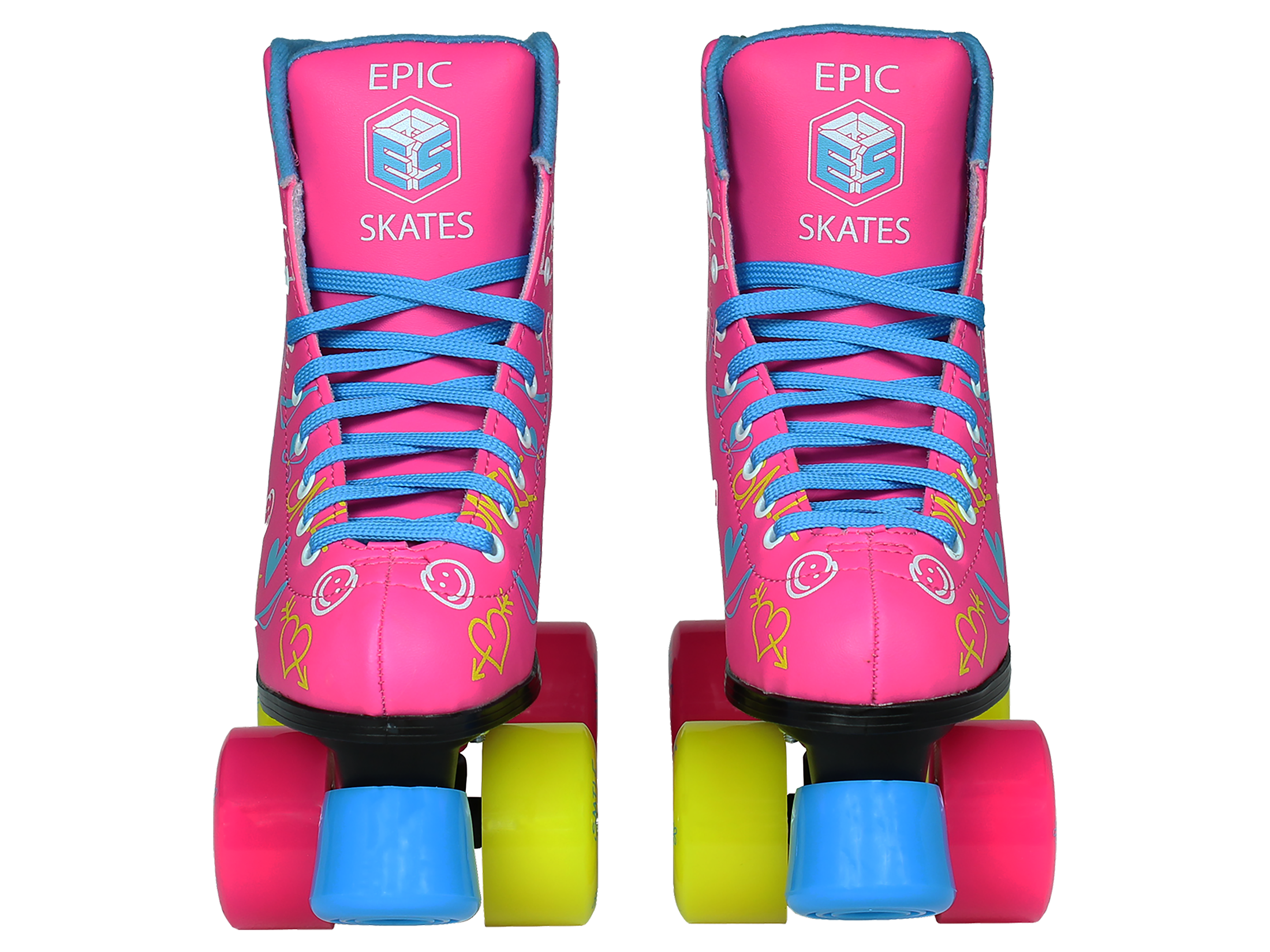 Epic Skates Blush Quad Roller Skates: Fashionable, high-top roller skate design Comfortable padded vinyl uppers 58mm PU Cast indoor/outdoor wheels Pink and yellow combination wheels Abec-5 precision speed bearings Toe Stops xe2x80x94 Epic Fixed Toe Stops