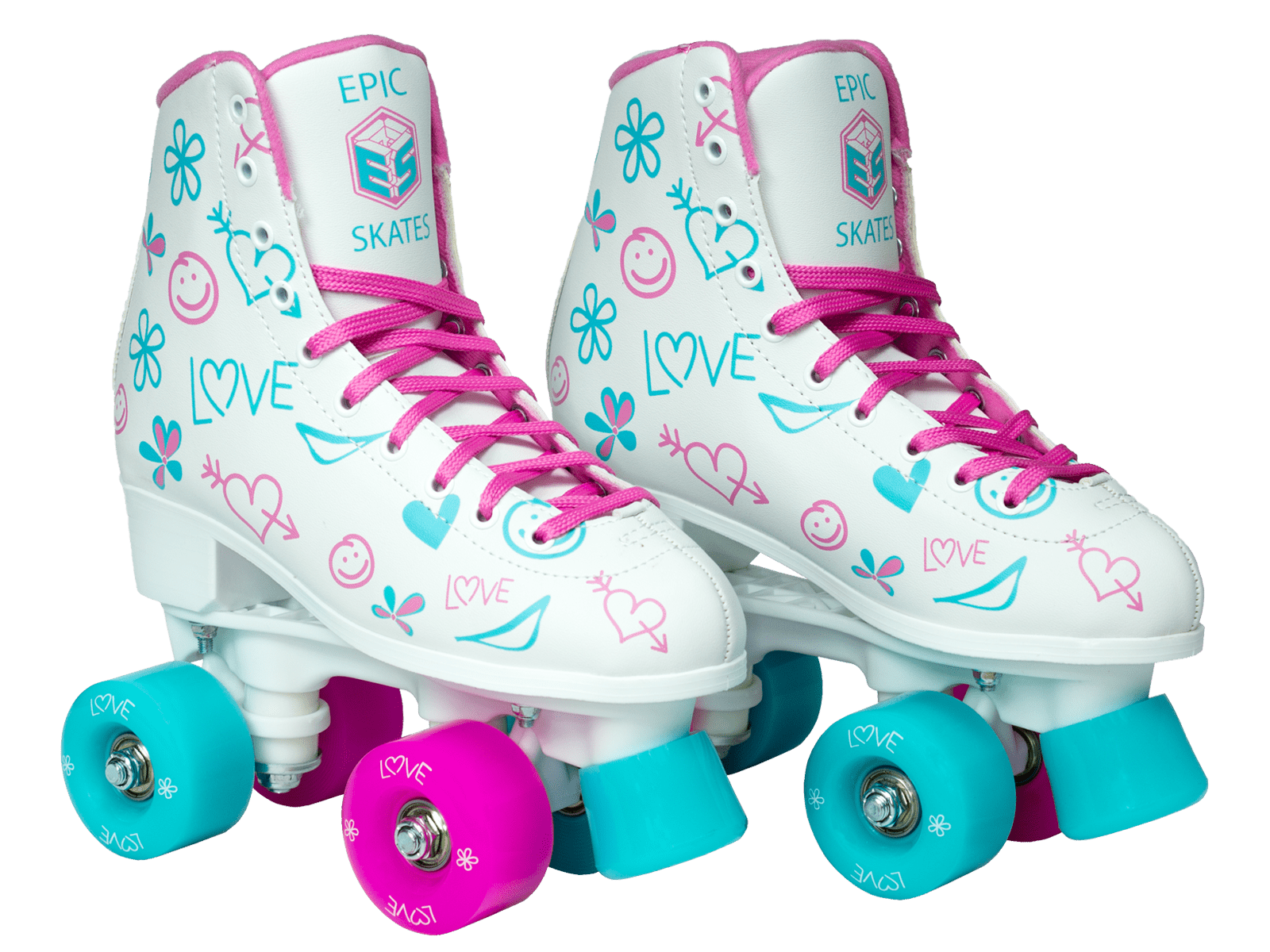Epic Skates Frost Quad Roller Skates: Fashionable, high-top roller skate design Comfortable padded vinyl uppers 58mm PU Cast indoor/outdoor wheels Pink and blue combination wheels Abec-5 precision speed bearings Toe Stops xe2x80x94 Epic Fixed Toe Stops