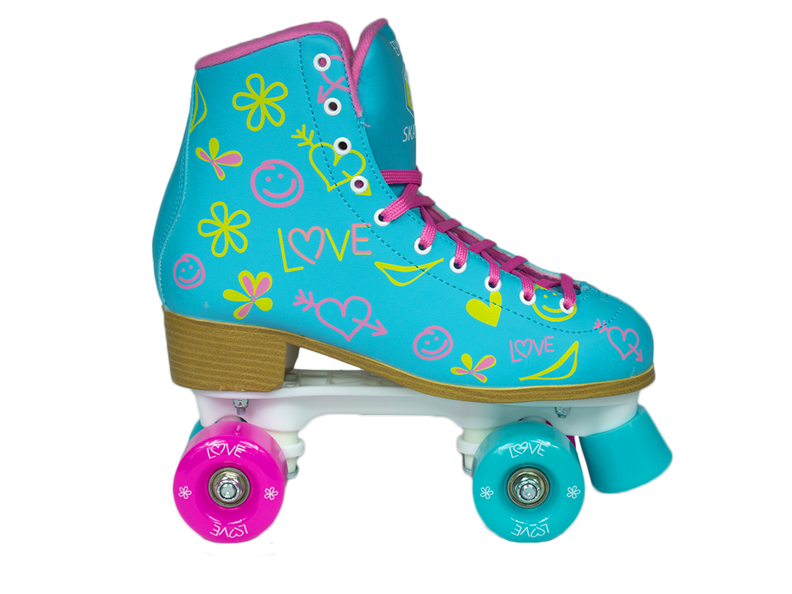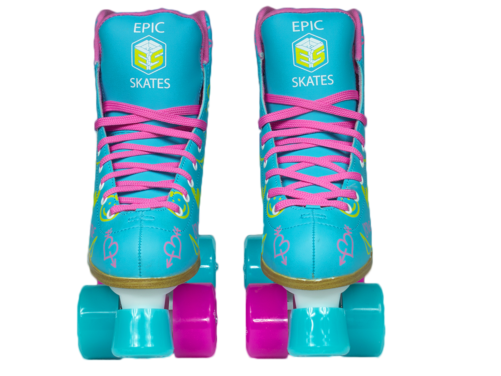Epic Skates Splash Quad Roller Skates: Fashionable, high-top roller skate design Comfortable padded vinyl uppers 58mm PU Cast indoor/outdoor wheels Pink and blue combination wheels Abec-5 precision speed bearings Toe Stops ? Epic Fixed Toe Stops