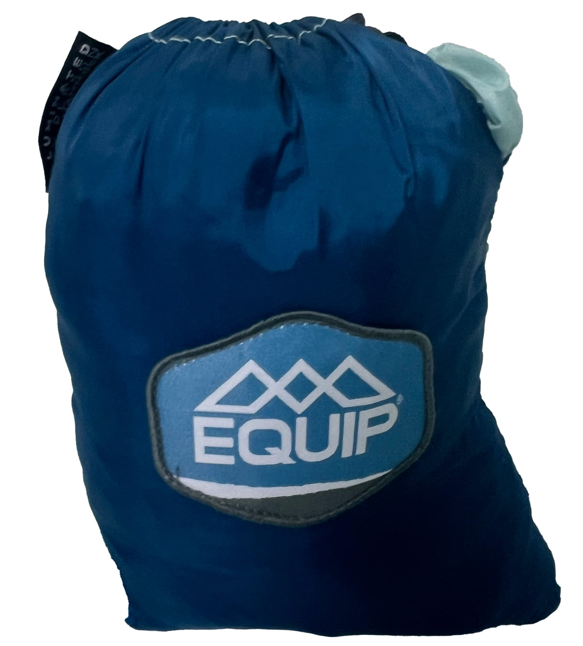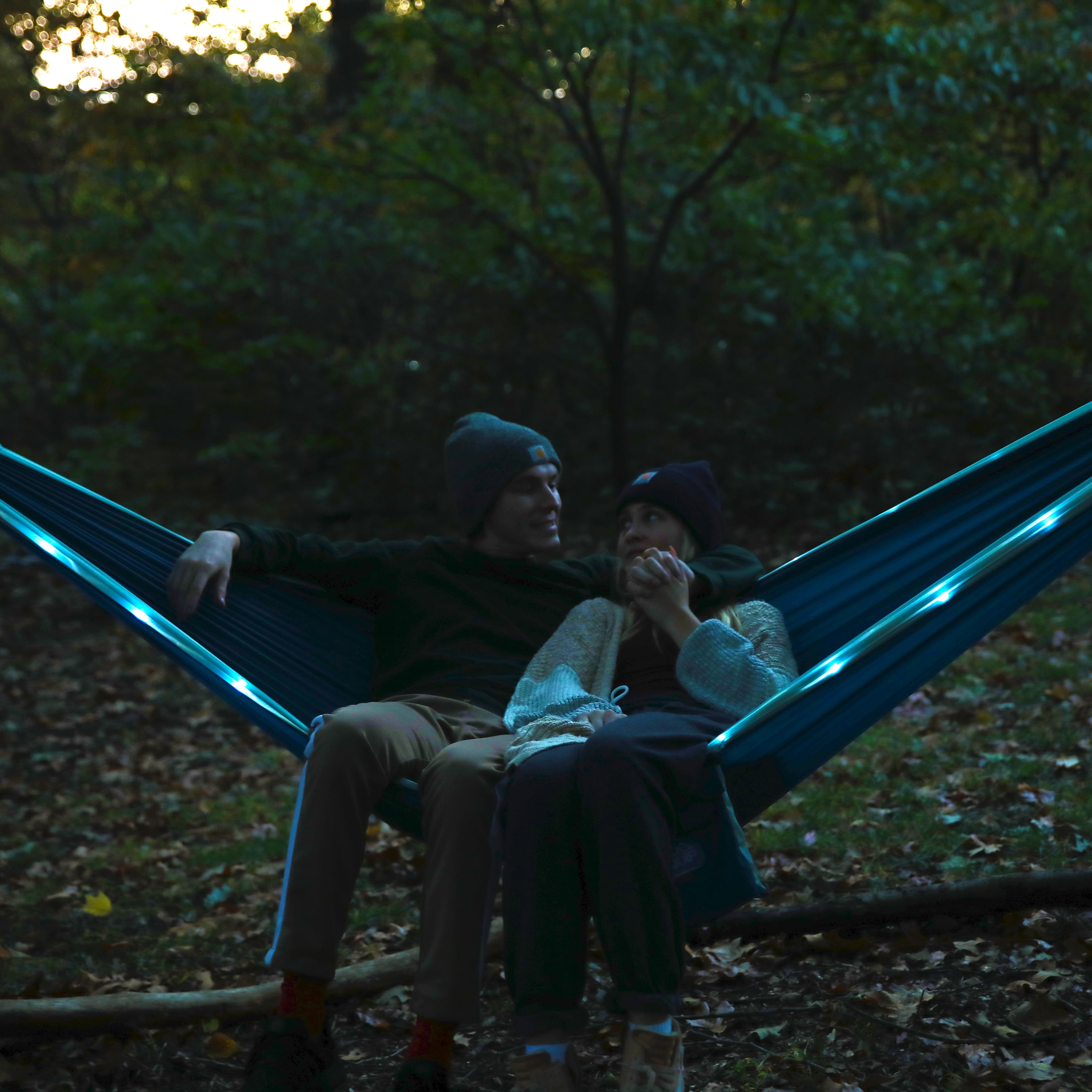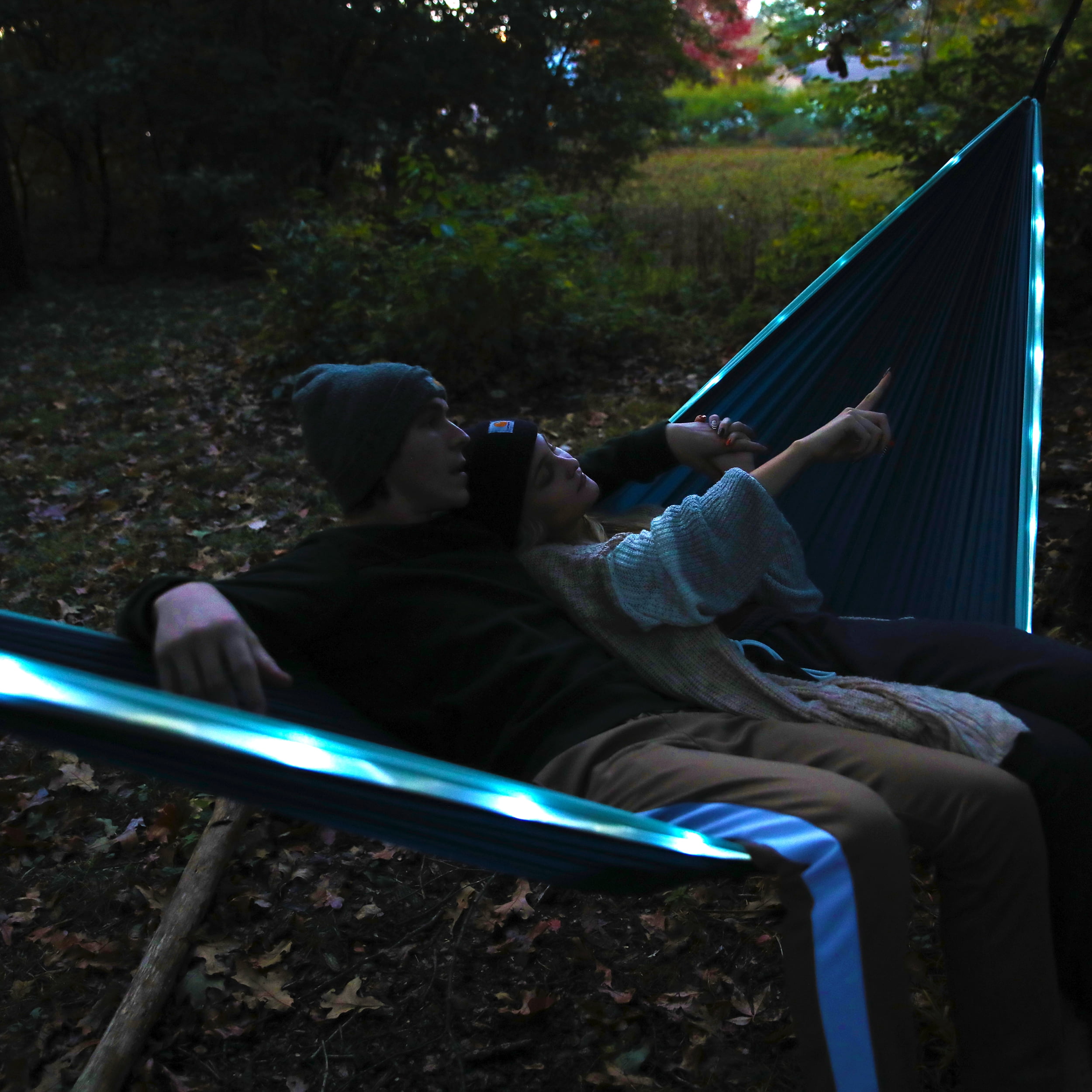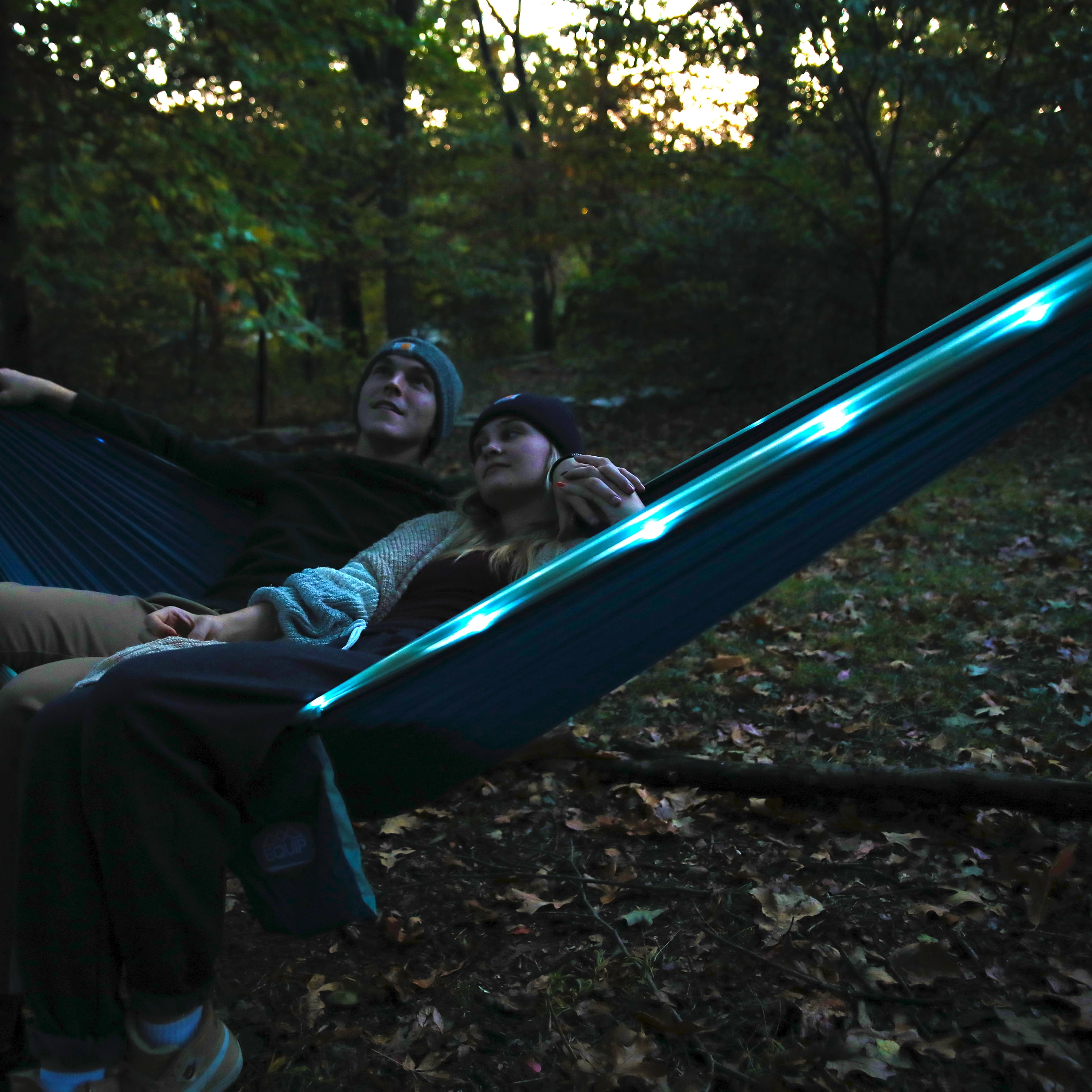 This Illuminated Equip Two Person Travel Hammock has plenty of room for two or keep it all to yourself and relax in ultimate comfort. This Illuminated hammock includes integrated LED lights with 4 lighting modes including: bright, dim, fast flash, and slow flash. It has a small pack downsize and will fit easily in the attached carry bag for easy portability. With a weight capacity of 500lb you can feel safe and secure. The small pack down size makes it easy to just throw into your backpack for a hiking trip or take with you on your bike ride. This double hammock includes hammock straps and carabiners. This allows you to set up your hammock in just minutes, with no need to go buy anything extra. The integrated loop ends add strength to the hammock and make it easier to set up. The light blue and dark blue 100% nylon hammock fabric is water-resistant to keep you safe and dry. Equip hammocks feature bright colors and patterns to help you express your personality and style. The larger size of this hammock allows for more room for you to relax with your favorite person or furry friend. Equip yourself, Equip life! *Batteries Not Included