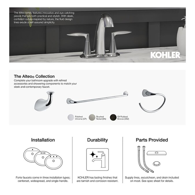 With sleek, confident curves inspired by nature, the Alteo faucet collection exudes a self-assured simplicity. Designed to deliver exceptional quality at an approachable price, the Alteo collection features fluid design lines that complement a wide range of décor.