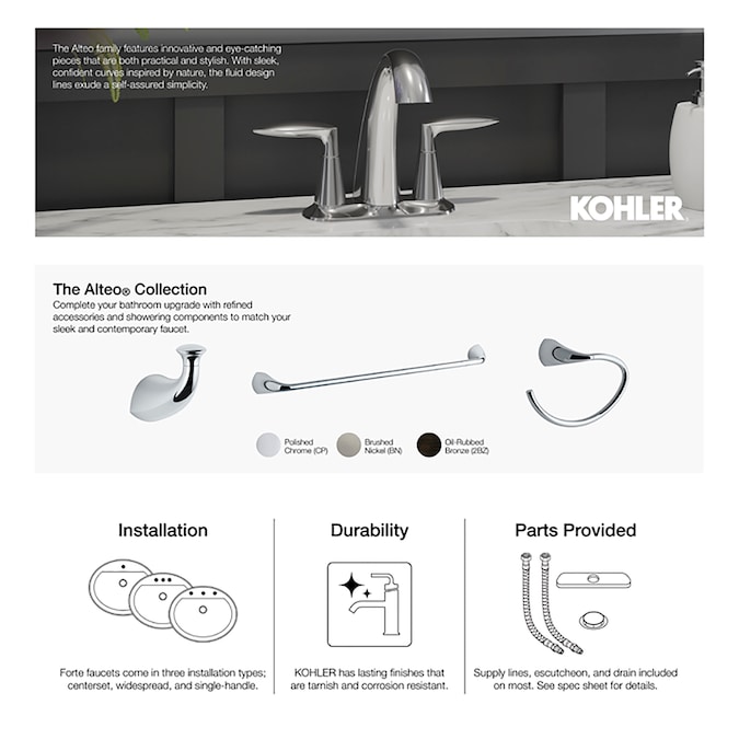 With sleek, confident curves inspired by nature, the Alteo faucet collection exudes a self-assured simplicity designed to deliver exceptional quality at an approachable price, the Alteo collection features fluid design lines that complement a wide range of decor.