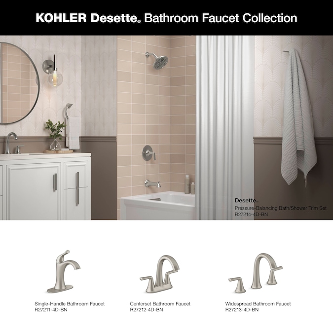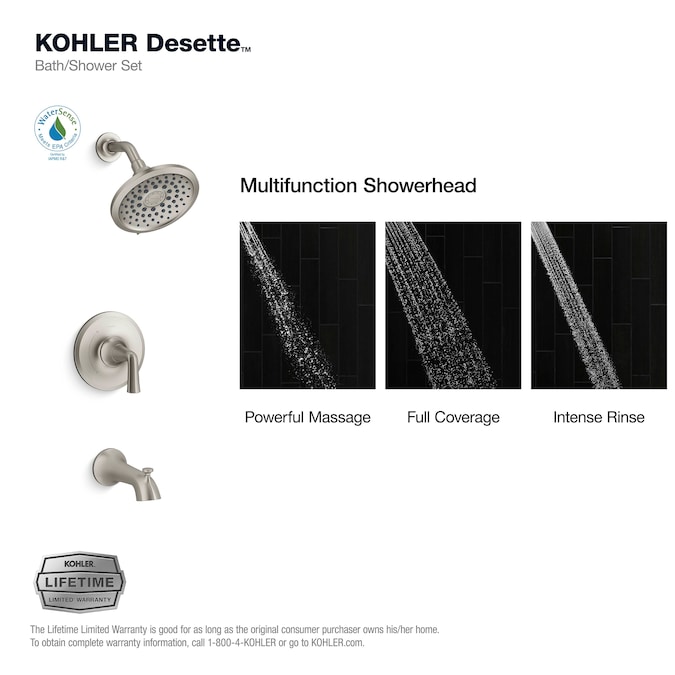 Bring elegance, versatility, and precision to your bath and shower with the Desette Rite-Temp pressure-balancing bath and shower set by er. The advanced spray engine of the showerhead can switch between powerful massage, intense drenching, and wide coverage sprays, while the MasterClean™ sprayface remains easy to clean and resists mineral buildup. The Rite-Temp valve maintains water temperature and pressure so your bath and shower experience will be just right.