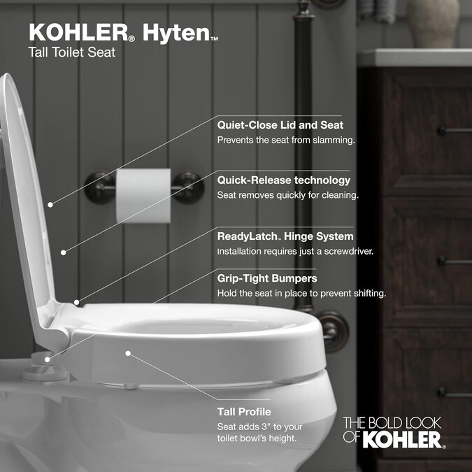 Now you can enjoy the added comfort of a higher toilet seat without having to replace your existing toilet with the Hyten Elevated Quiet-Close toilet seat. Hyten is a high-rise toilet seat that adds three inches of height to your toilet bowl and looks just like a normal toilet seat – only taller – so it blends virtually undetected into your current bathroom décor. Hyten gives peace of mind to those with limited mobility in an attractive package.
