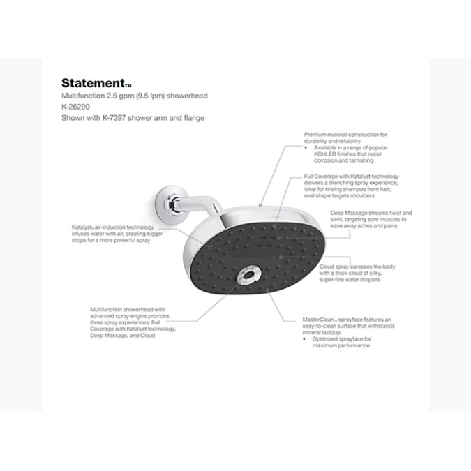 - Multifunction showerhead with advanced spray engine provides three spray experiences: Full Coverage with Katalyst technology, Deep Massage, and Cloud