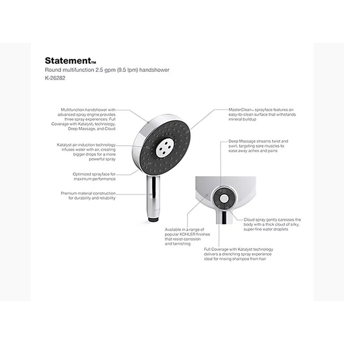 - Multifunction handshower with advanced spray engine provides three spray experiences: Full Coverage with Katalyst technology, Deep Massage, and Cloud