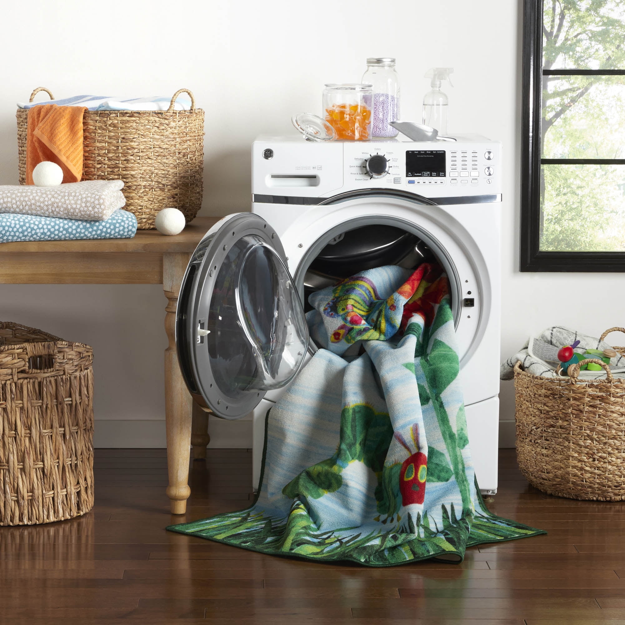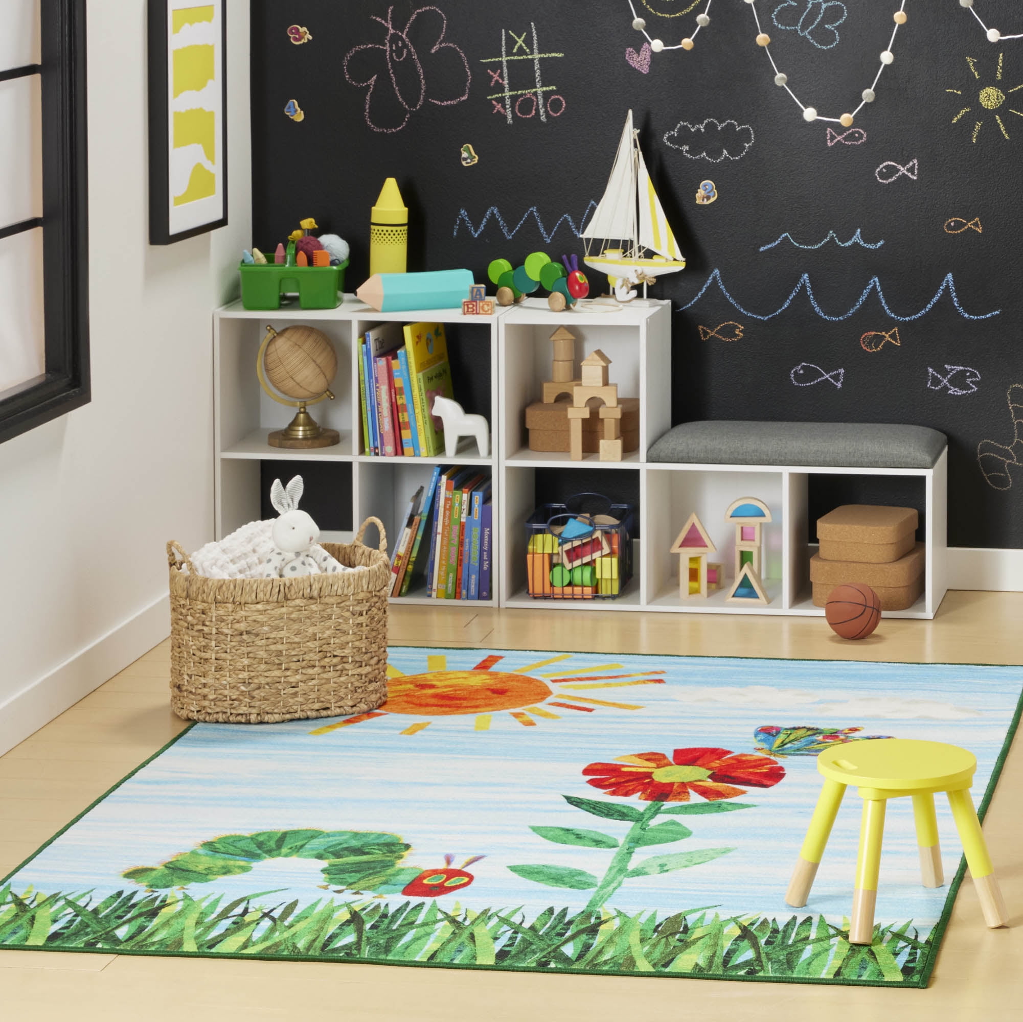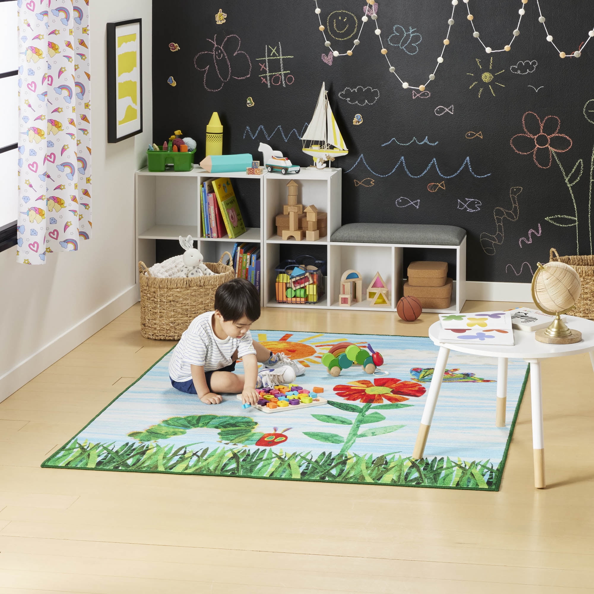 CHEERFUL & COLORFUL DESIGN: The Eric Carle Elementary Sun kids area rug showcases a colorful garden scene featuring the title character from Carle’s bestselling book, “The Very Hungry Caterpillar” and adds a cheerful touch and soft surface for playtime. MACHINE WASHABLE RUG: This easy-care rug is machine washable, so there’s no need to worry about stains and spills! WELL-CRAFTED WITH NON-SKID BACKING: Made with 100% polyester yarns in a power-loomed construction, this durable, decorative area rug is designed to last. A non-skid latex backing prevents slipping and sliding so children can play safely. IDEAL FOR CHILDREN’S ROOMS: This colorful design is stain resistant, making it ideal for children’s bedrooms, playrooms, and classrooms. CARE INSTRUCTIONS: Machine wash on gentle cycle separately in cold water. Do not bleach. Do not iron. Hang to dry or air dry flat.
