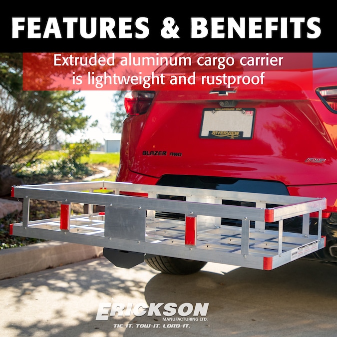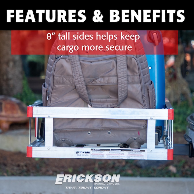 The Erickson extruded aluminum, basket-style cargo carrier is lightweight and rustproof. Raised side rails help keep cargo in place while also providing limitless tie-down options.