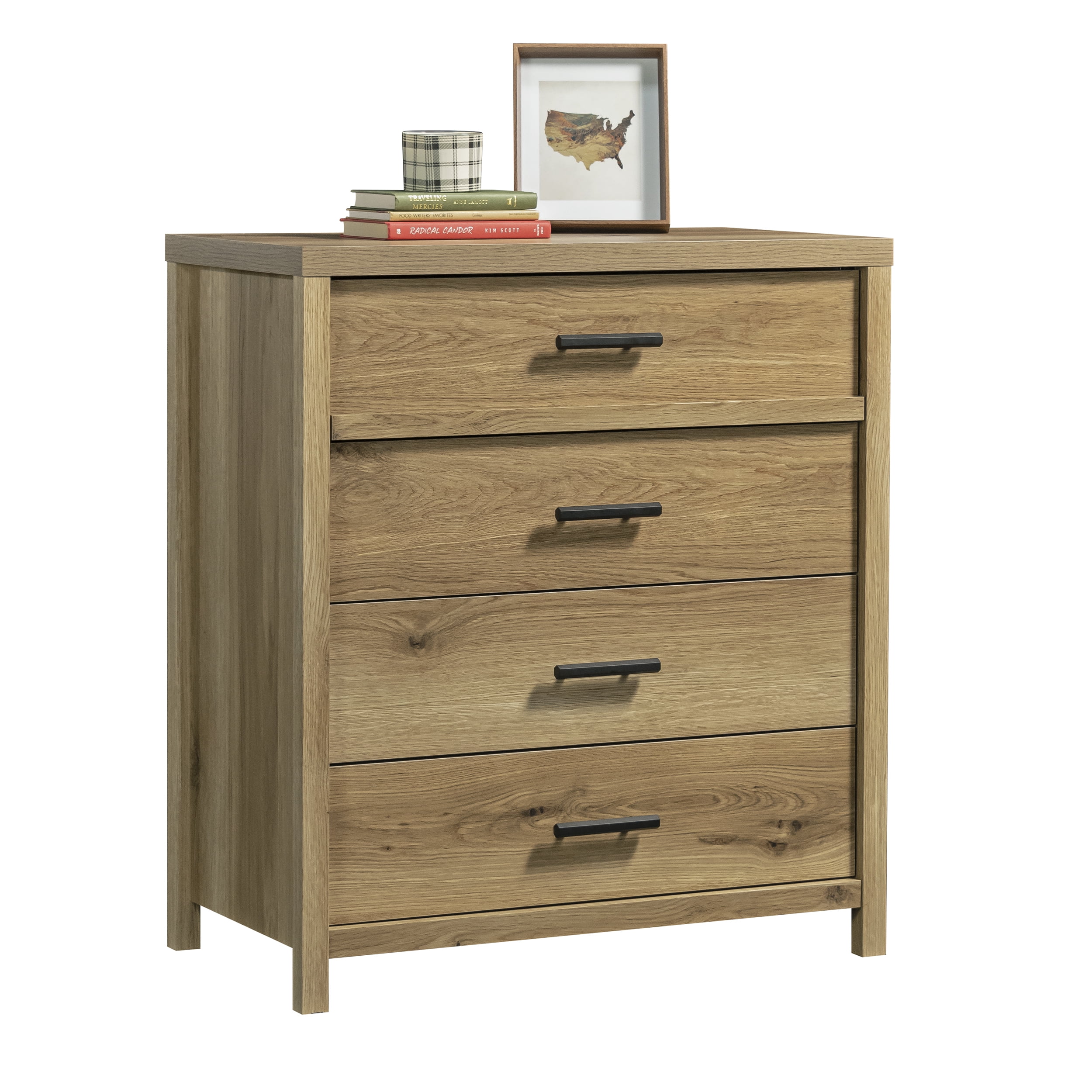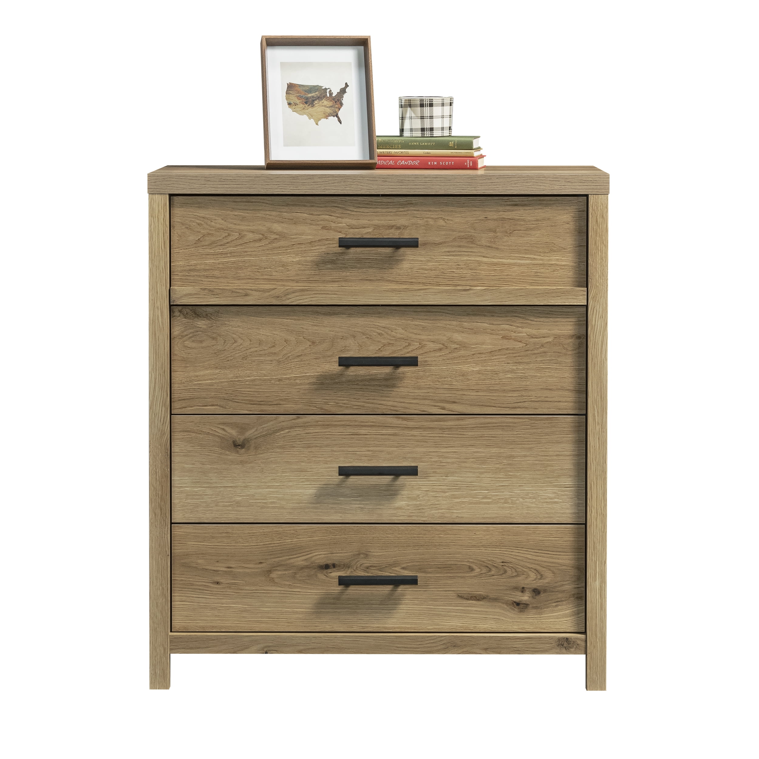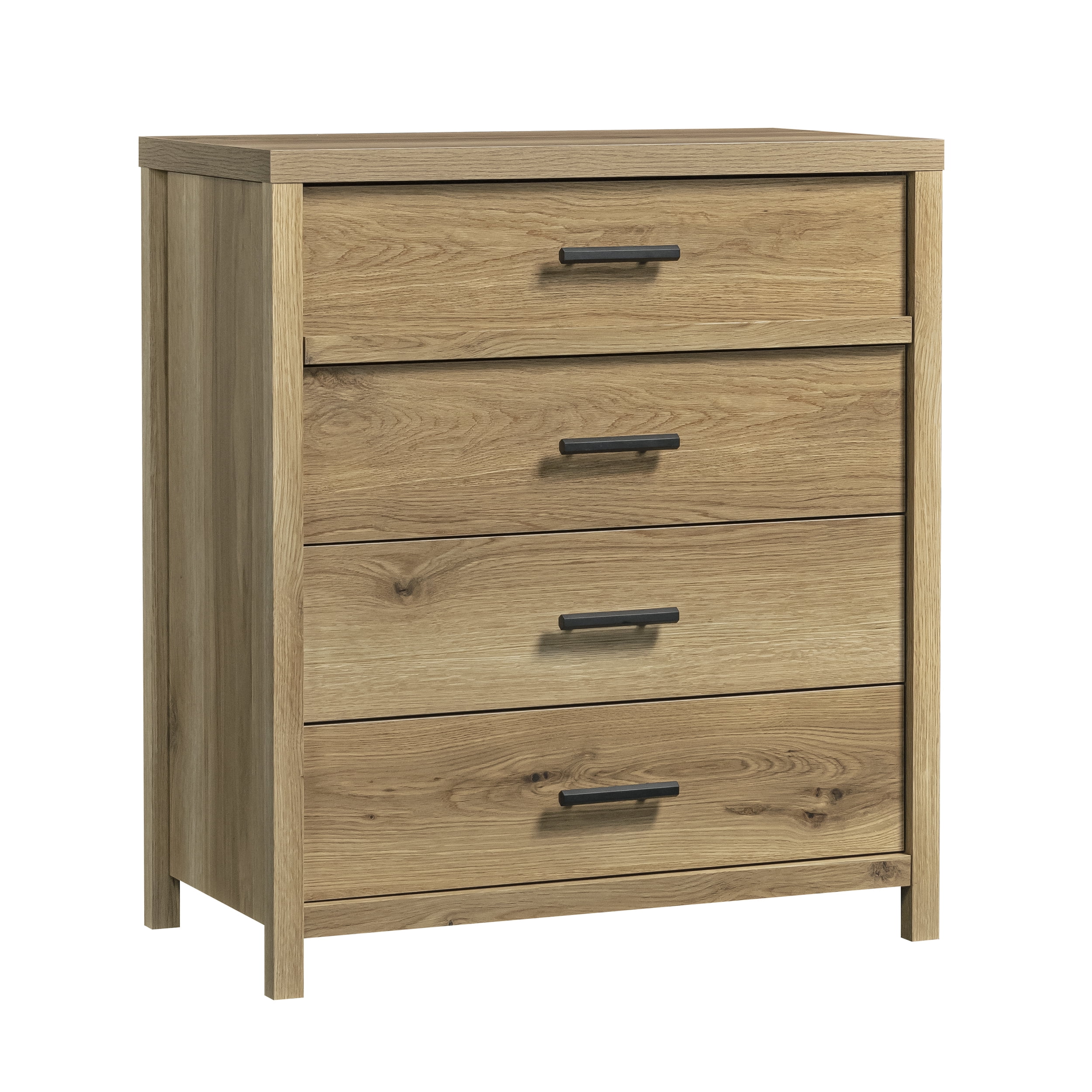 Introducing the Erie collection by Sauder, a classic American line of furniture honoring Sauder’s company founder and furniture Hall of Fame inductee, Erie Sauder. Built with exacting details and showcases a modern interpretation of timeless Shaker and Arts & Crafts design principles, dependability, and the inviting allure of refined wood grain. Finished in the warm, natural Timber Oak with bold hexagonal drawer pulls, this 4-drawer chest is an ideal selection for those seeking both practicality and classic style in their bedroom. This bedroom chest of drawers has a strong and lightweight top that is a durable 1 ½ inches in thickness. The four spacious drawers of this bedroom dresser feature metal runners and safety stops for smooth access to your fashion within. For added safety this 4-drawer dresser has an interlocking safety mechanism that allows only one drawer open at a time, a tip restraint safety strap, plus quick and easy assembly, including slide-on moldings and T-lock drawer system. This dresser with drawers is an iconic piece that equally exudes charm and functionality, adding a touch of modern Americana grandeur to your bedroom or any room.