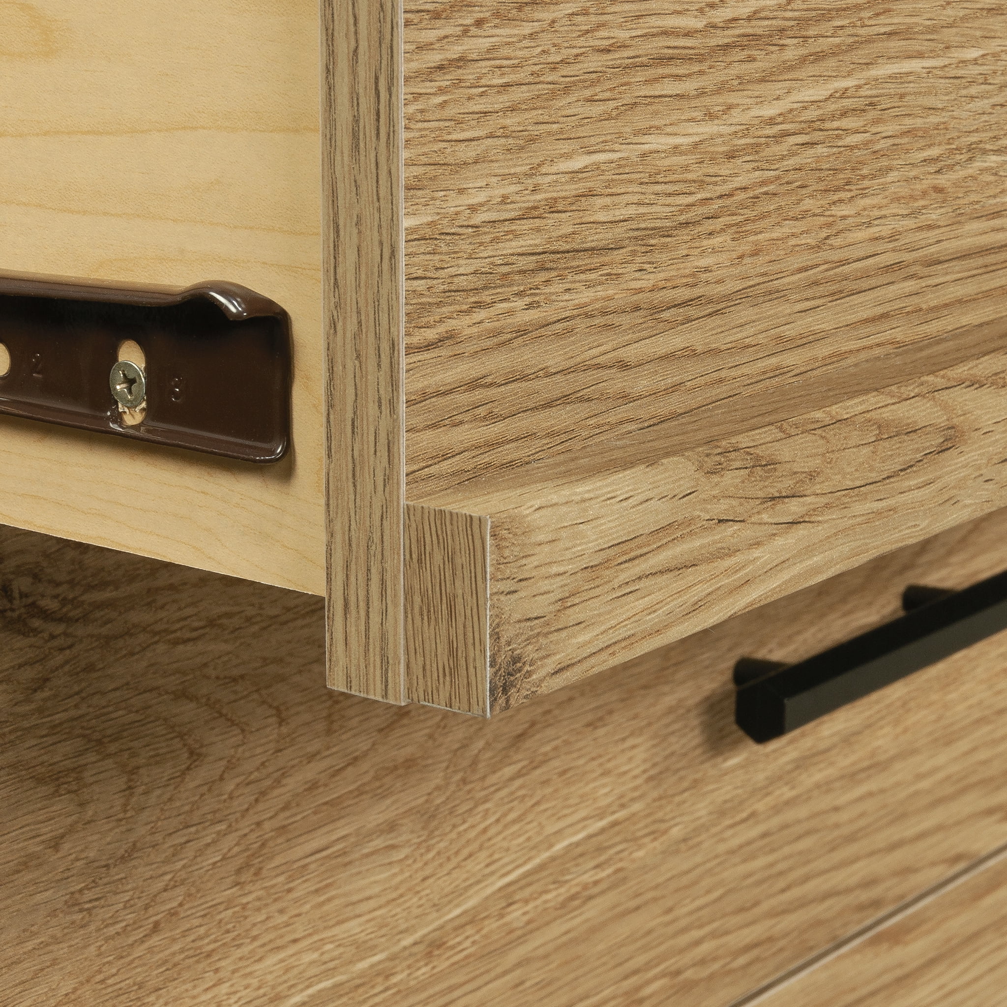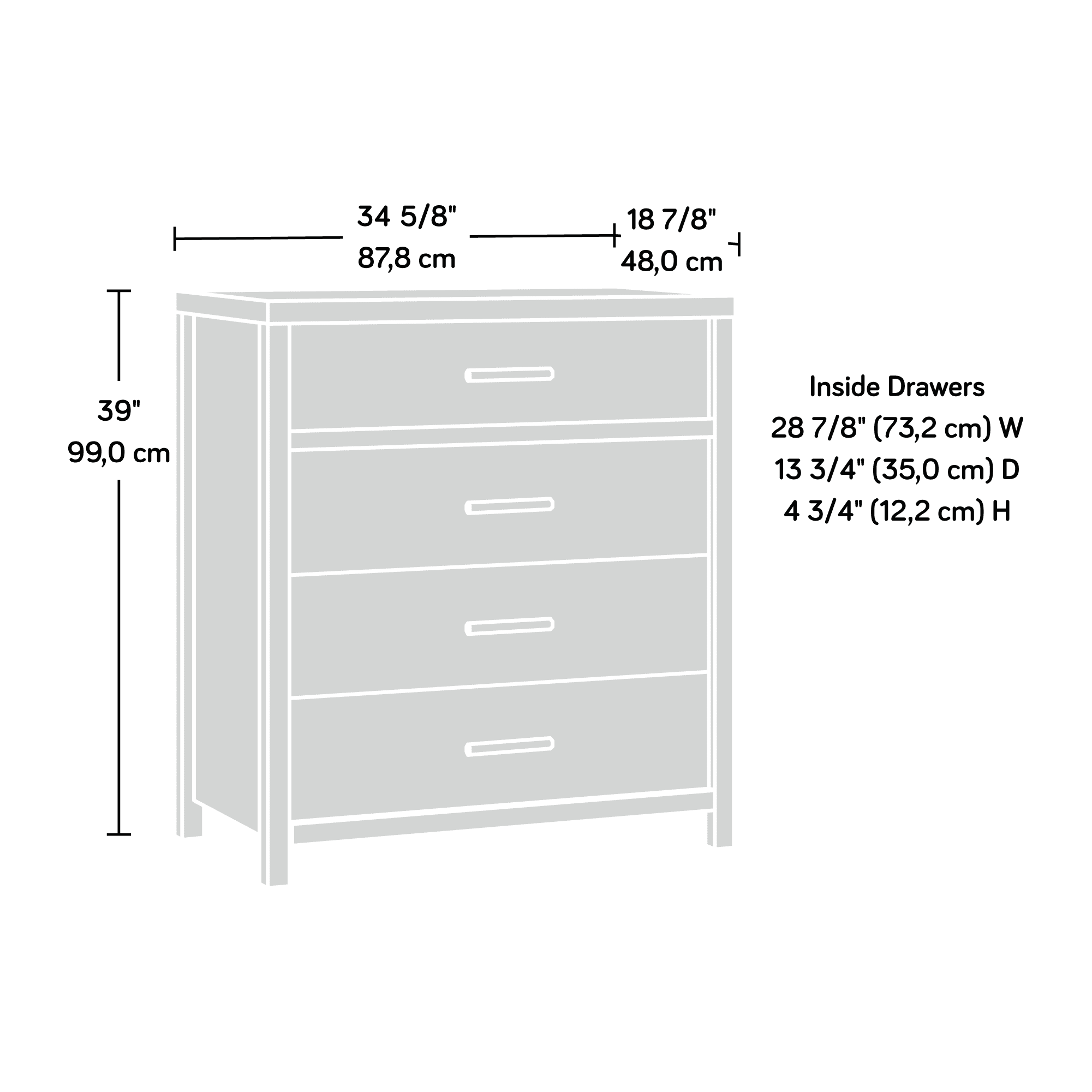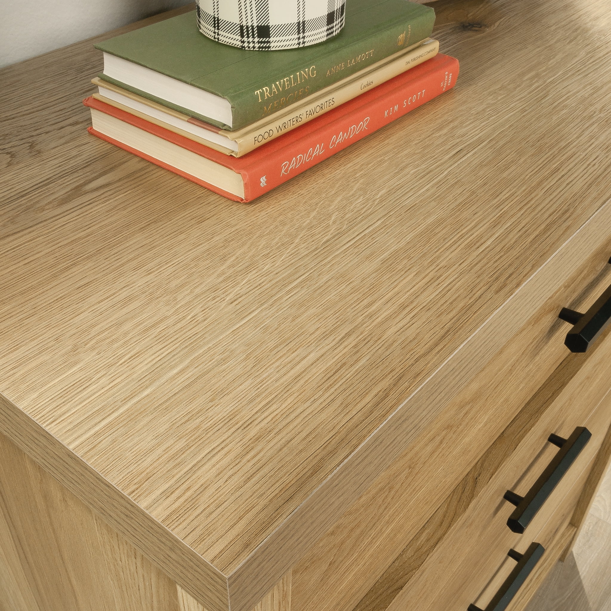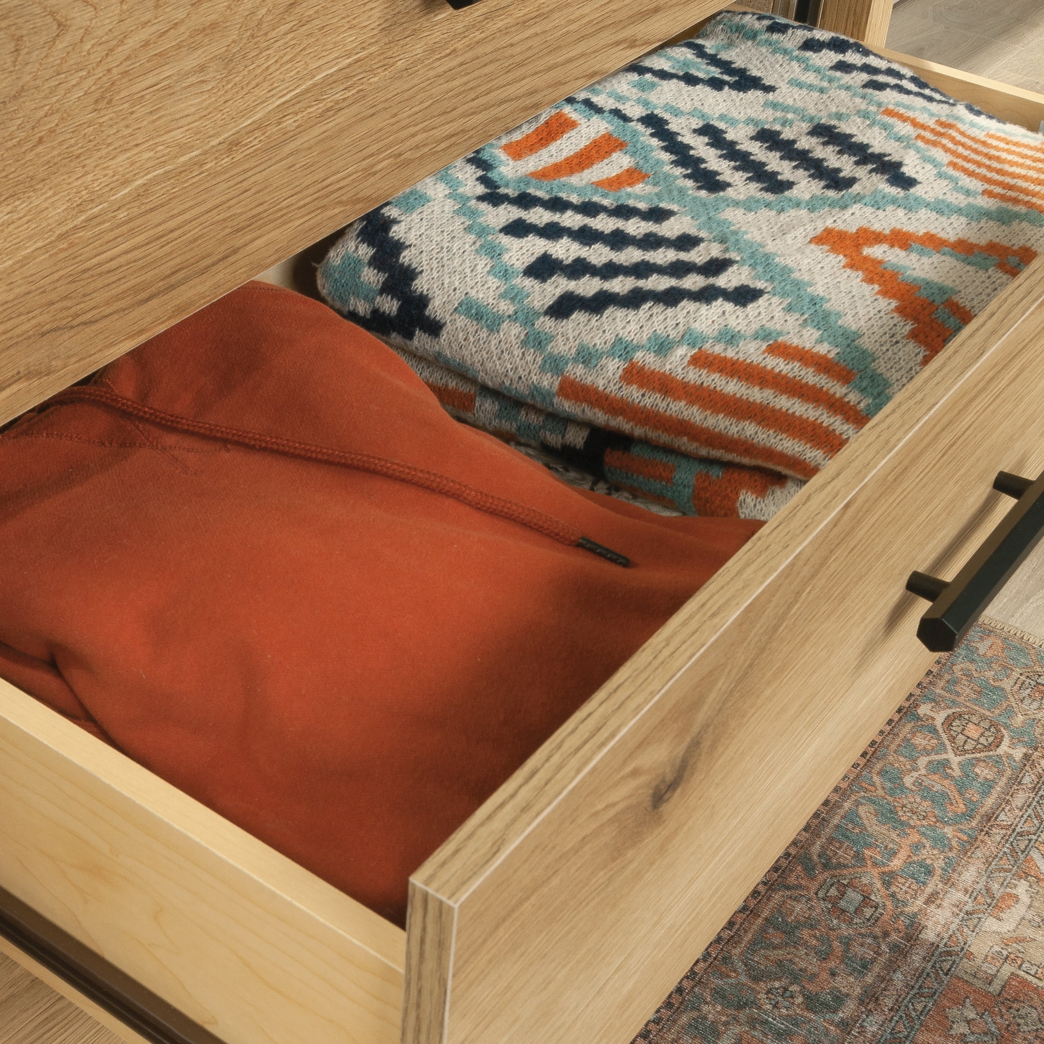 Introducing the Erie collection by Sauder, a classic American line of furniture honoring Sauder’s company founder and furniture Hall of Fame inductee, Erie Sauder. Built with exacting details and showcases a modern interpretation of timeless Shaker and Arts & Crafts design principles, dependability, and the inviting allure of refined wood grain. Finished in the warm, natural Timber Oak with bold hexagonal drawer pulls, this 4-drawer chest is an ideal selection for those seeking both practicality and classic style in their bedroom. This bedroom chest of drawers has a strong and lightweight top that is a durable 1 ½ inches in thickness. The four spacious drawers of this bedroom dresser feature metal runners and safety stops for smooth access to your fashion within. For added safety this 4-drawer dresser has an interlocking safety mechanism that allows only one drawer open at a time, a tip restraint safety strap, plus quick and easy assembly, including slide-on moldings and T-lock drawer system. This dresser with drawers is an iconic piece that equally exudes charm and functionality, adding a touch of modern Americana grandeur to your bedroom or any room.