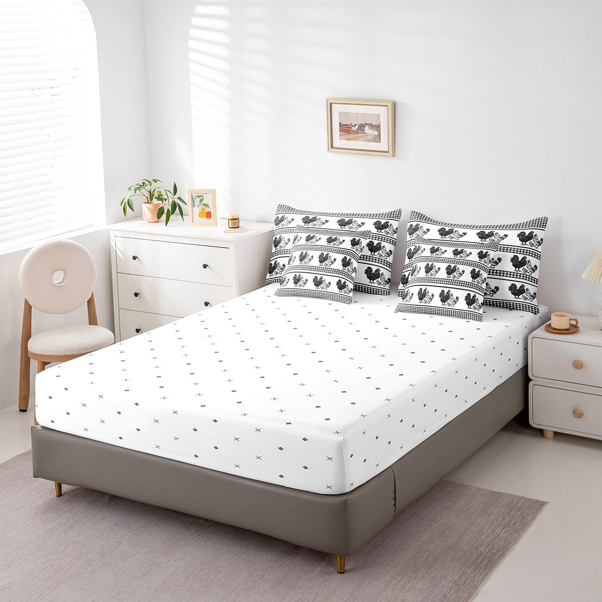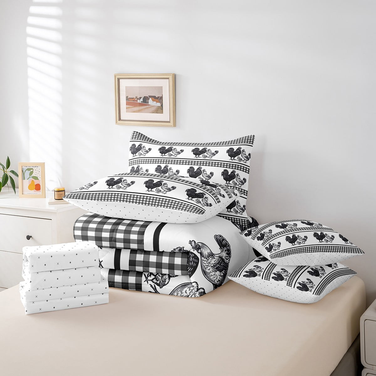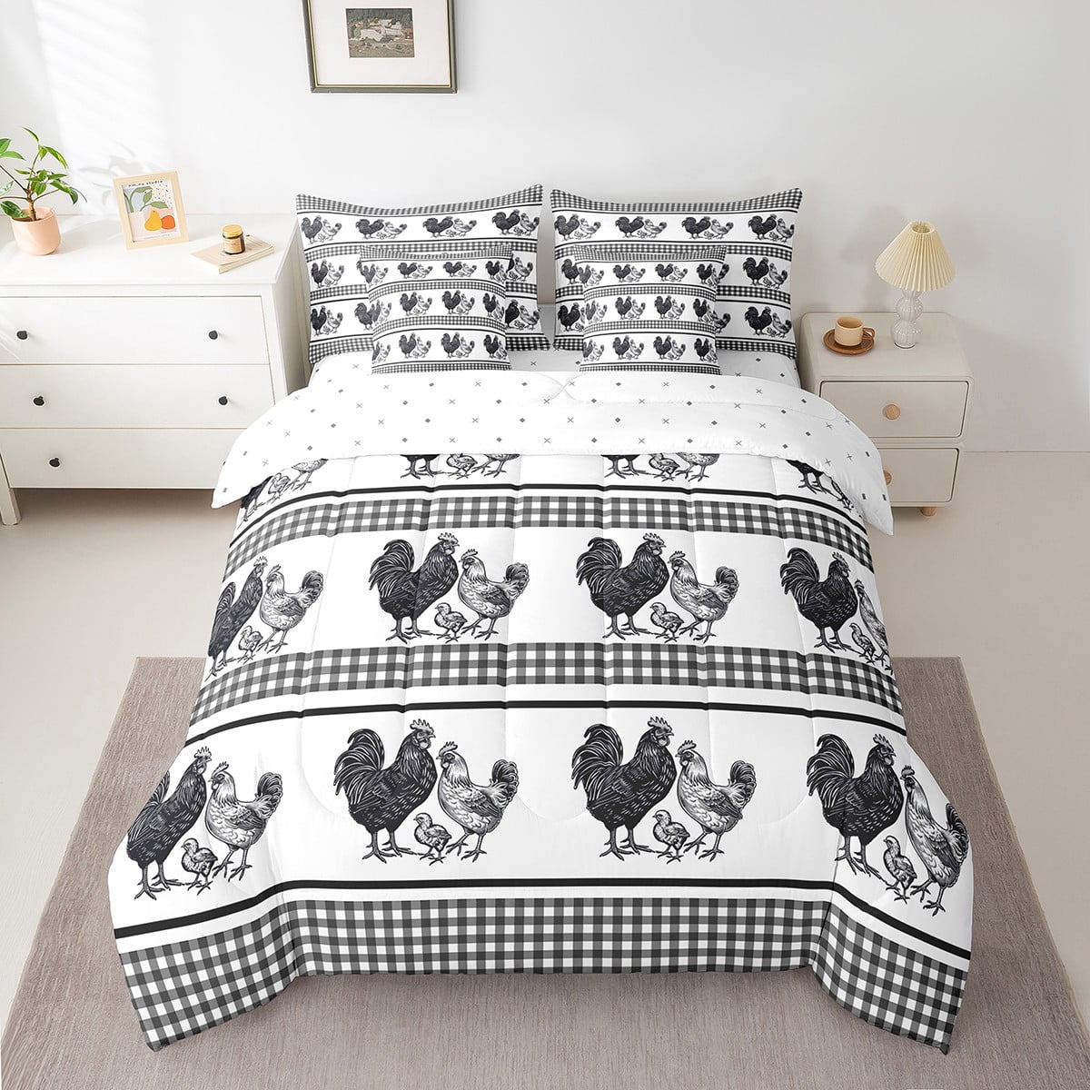Erosebridal 7 Pcs Rooster Comforter Set Queen Size,Farmhouse Animal Bed in a Bag with Flat Sheet and Fitted Sheet and Adults,Rustic Chick Family Bedding Set with Pillowcase and Sham