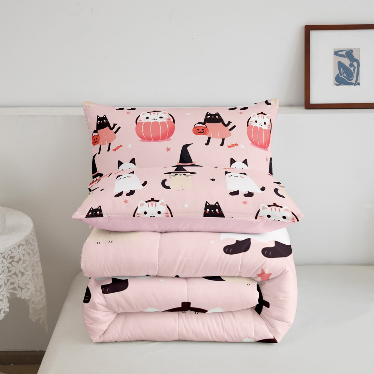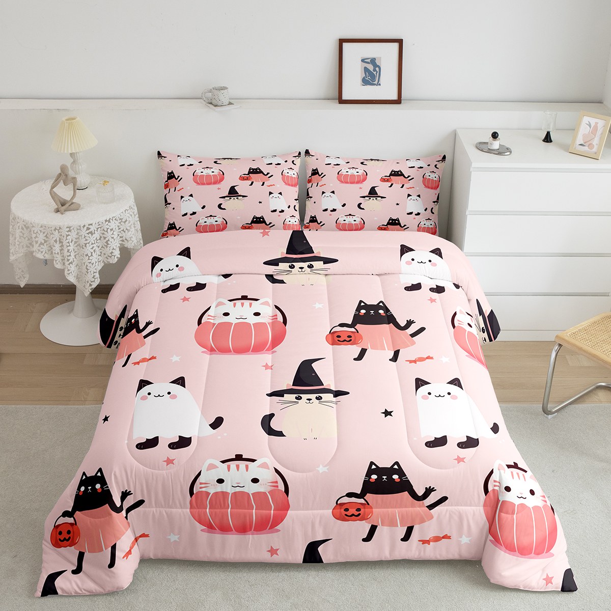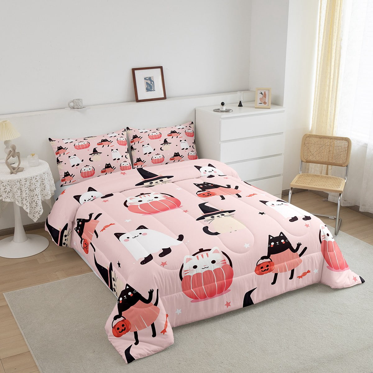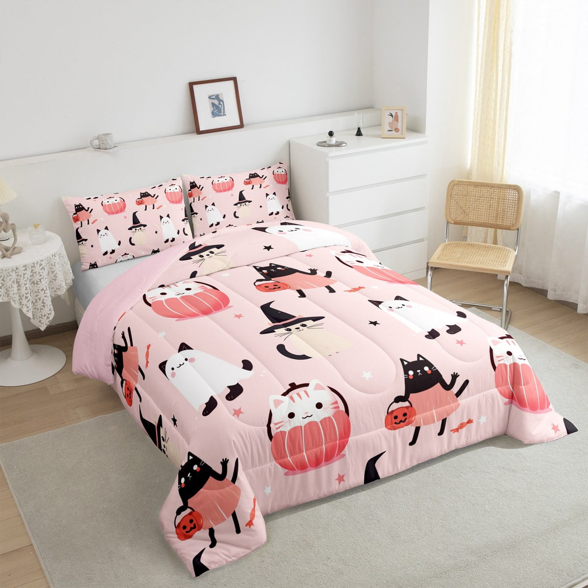 Erosebridal Cute Ghost Cat Comforter Set Twin Happy Halloween Pumpkin Bedding Set Gifts Teen,Black White Halloween Kitten Bed Comforter Set Pink Halloween Quilt Set 1 Pillow Case