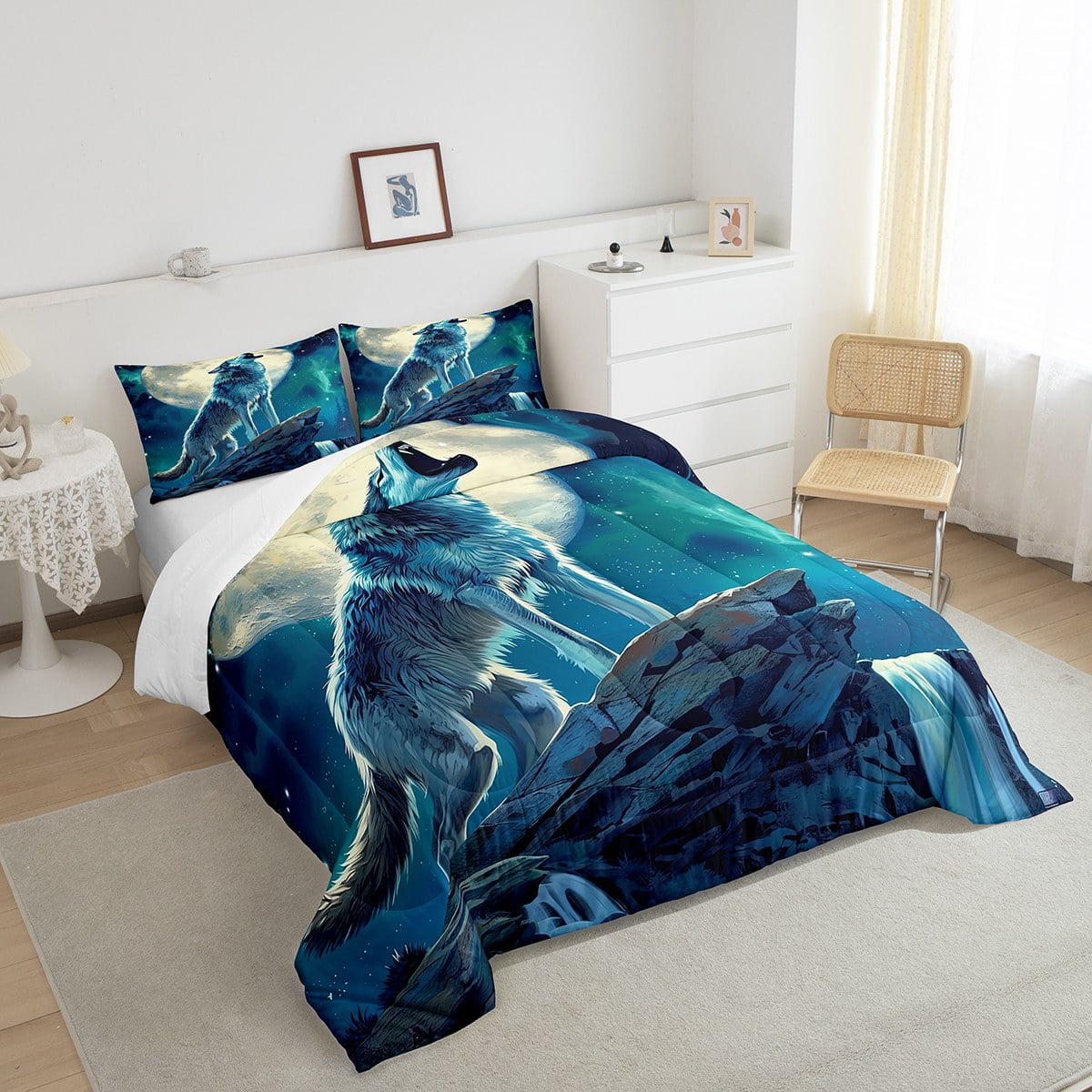Erosebridal Galaxy Wolf Comforter Set Twin Adults,Moon Starry Sky Bedding Set Trippy Room Decor,Animal Bedding Comforter Sets Safari Hunting Wolf Quilt Bed Set 2Pcs