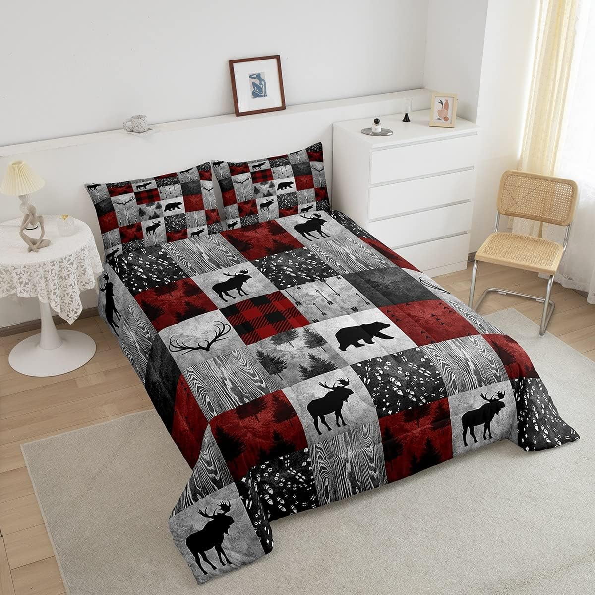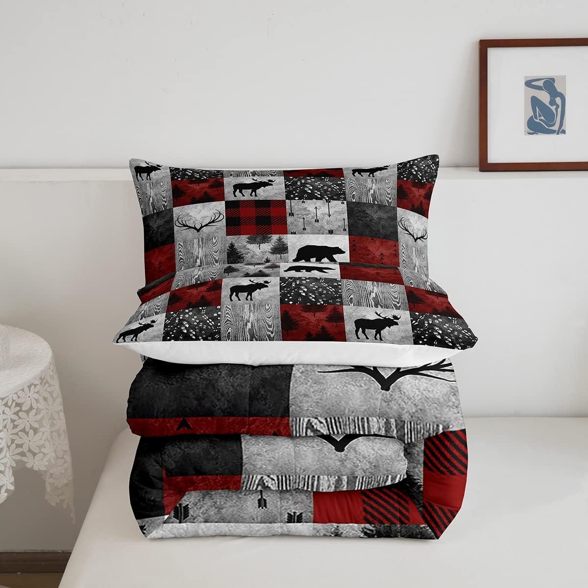 Erosebridal Lodge Deer Comforter Twin,Burgundy Buffalo Plaid Check Bedding Set ,Bear Elk Antler Wild Hunting Animal Duvet Insert,Merry Christmas Down Comforter with 1 Pillowcase