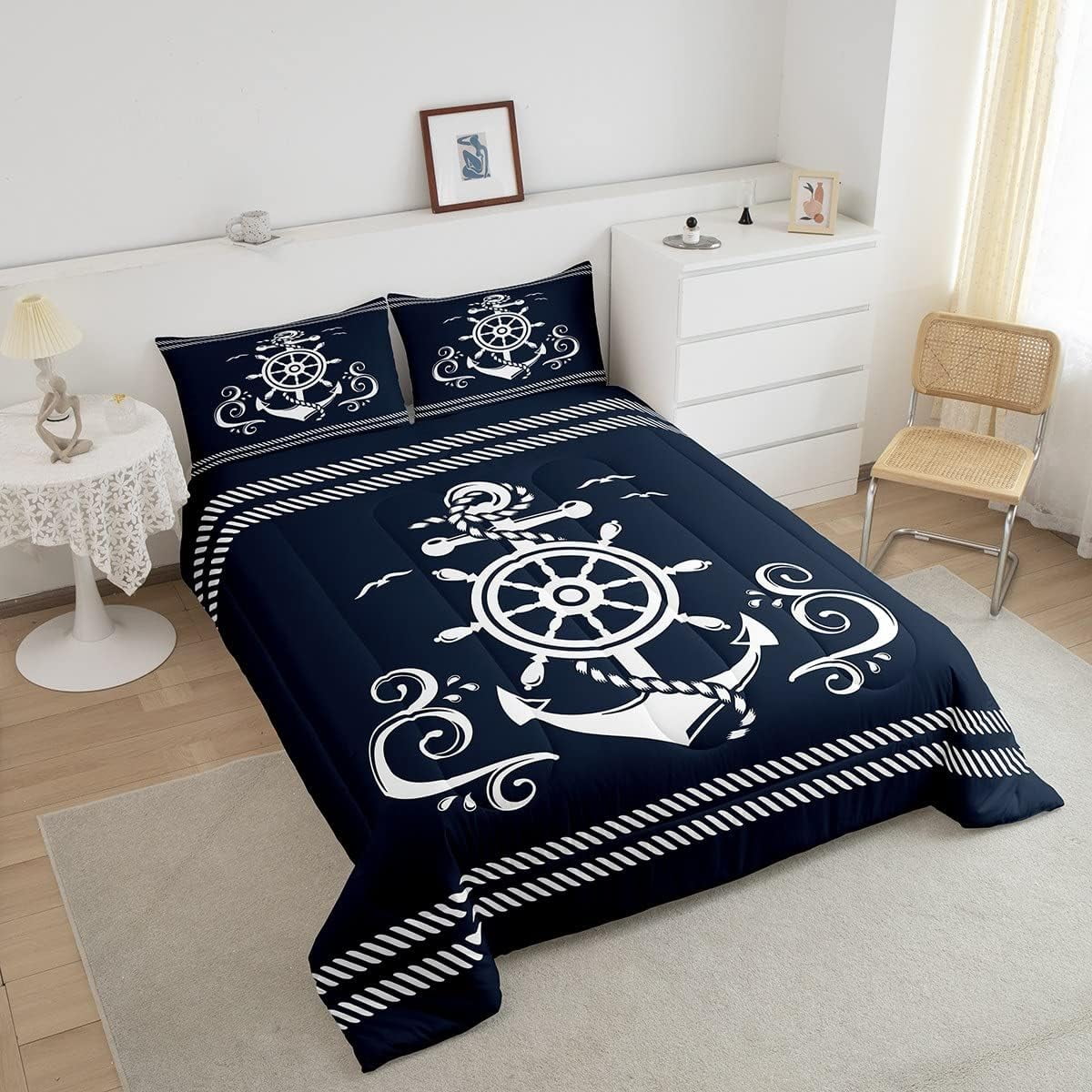 Erosebridal Nautical Anchor Bedding Set , Compass Adventure Comforter Set Coastal Compass Duvet Sets Ocean Sailboat Bedding Comforters Teens Adult Bedroom, Navy Blue(Queen Size)