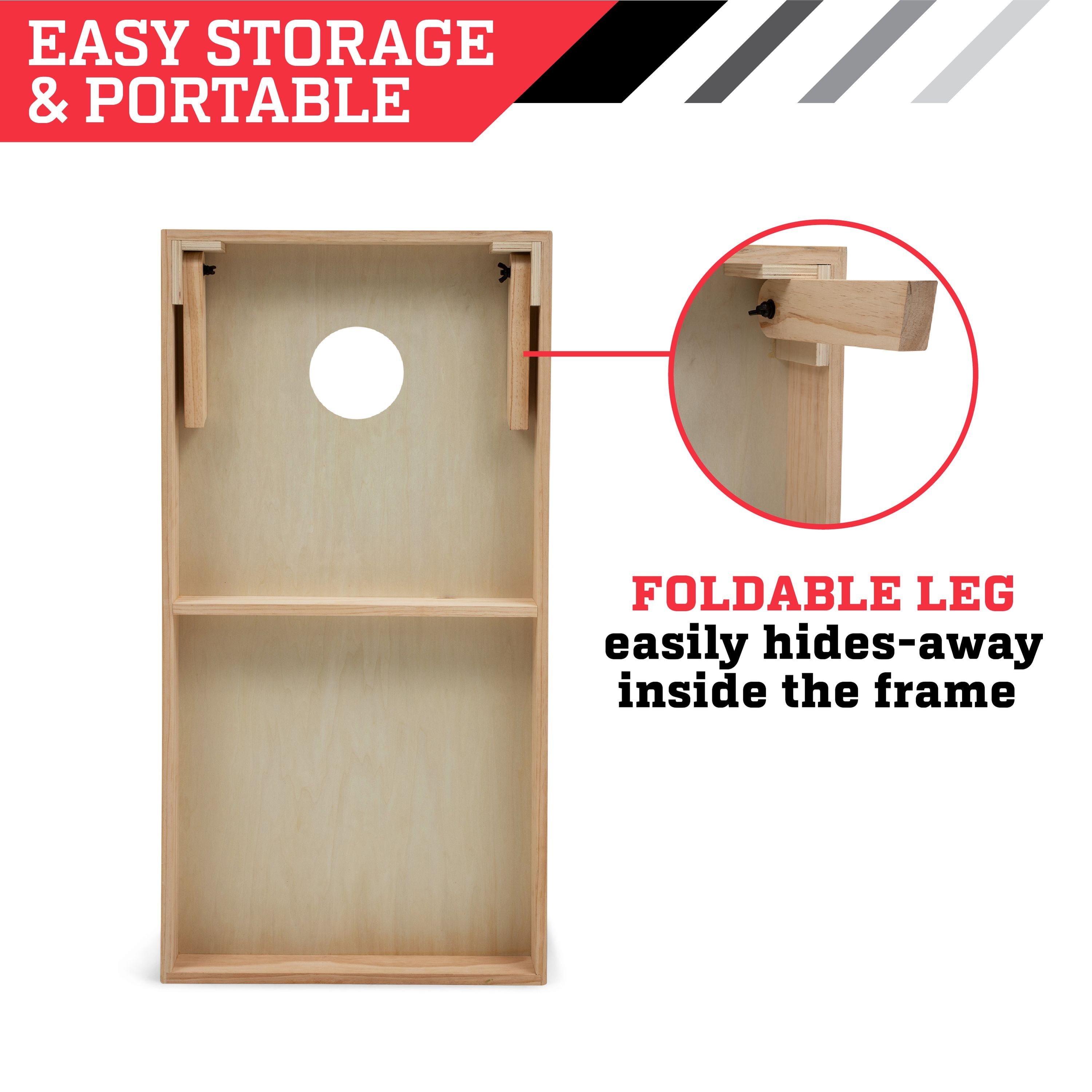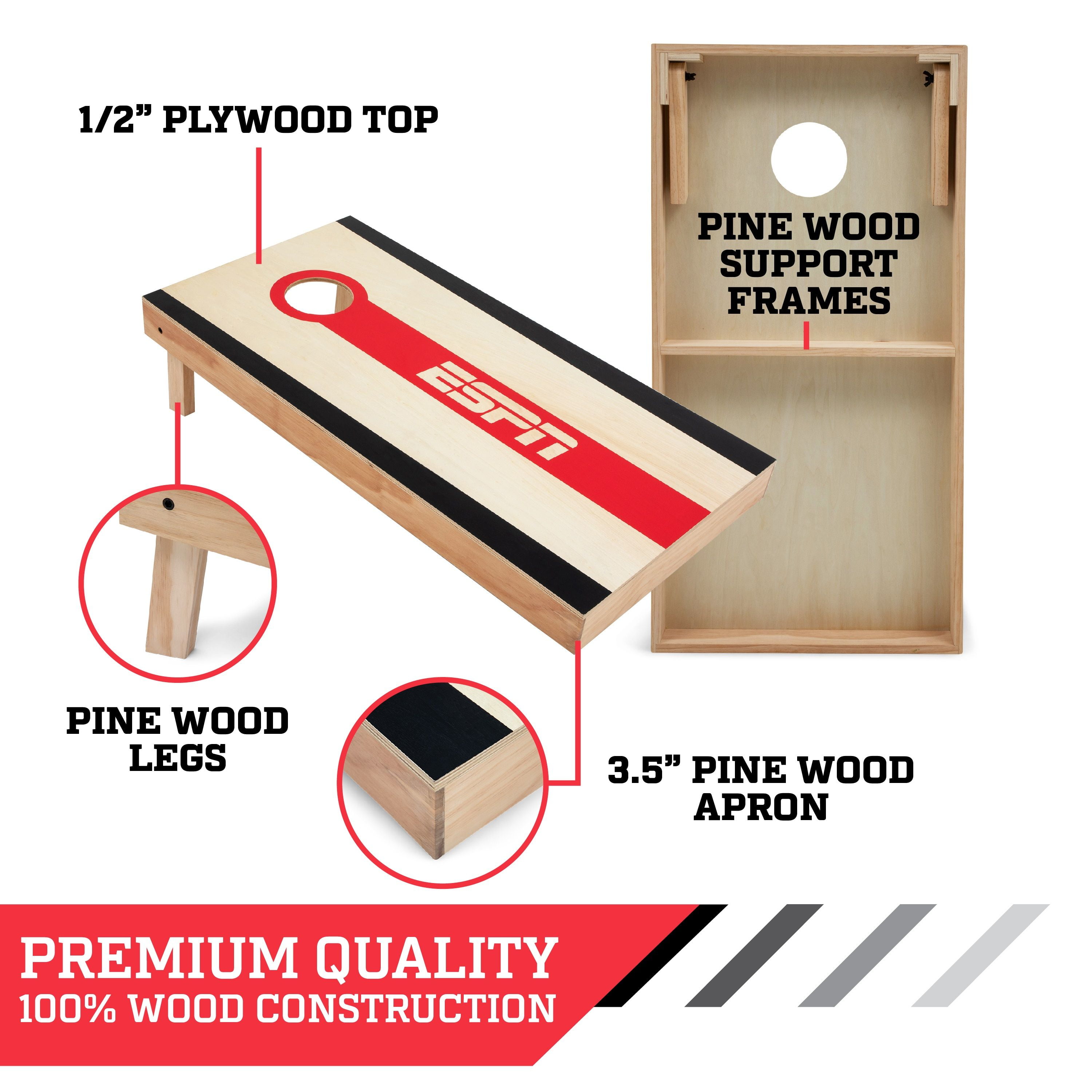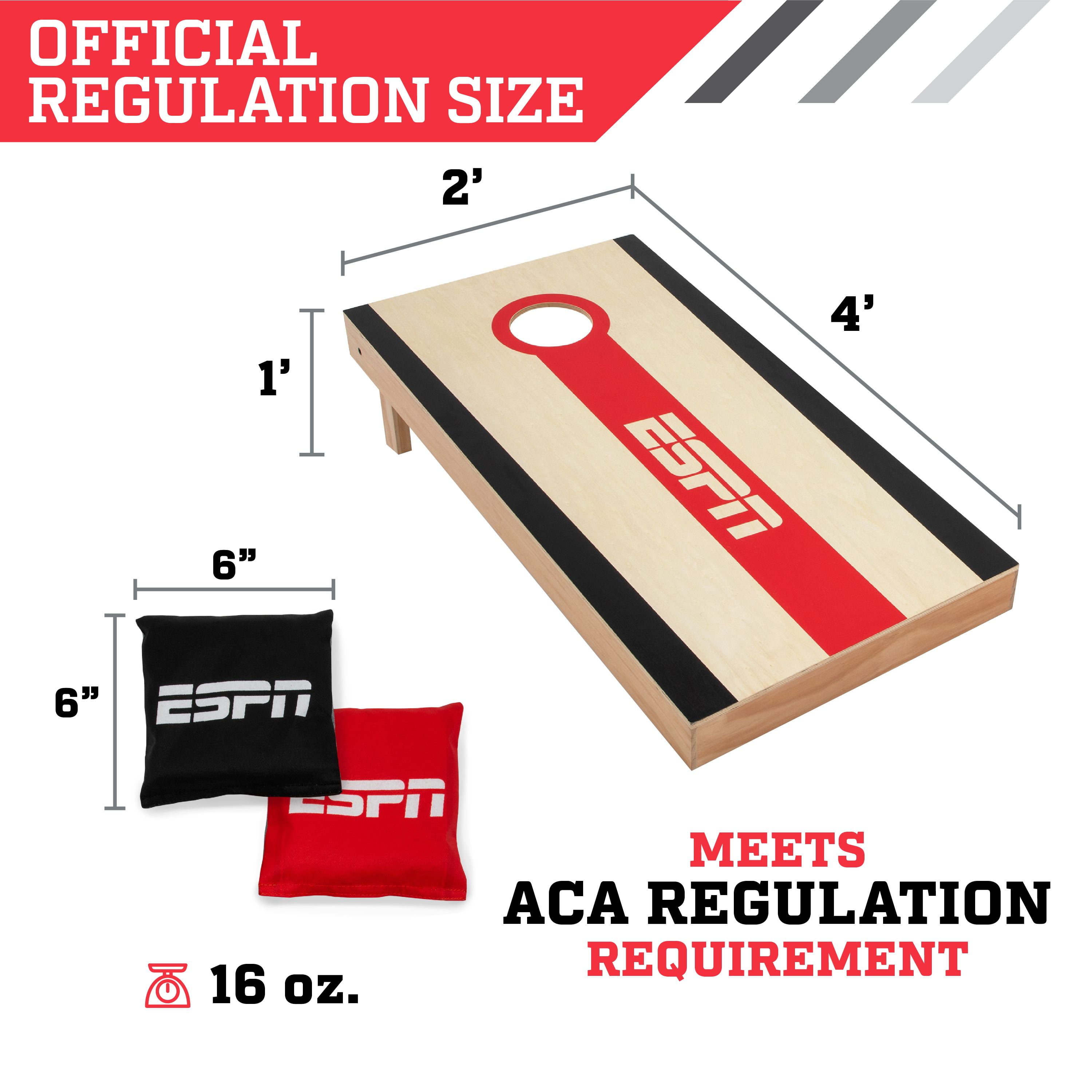 ESPN Regulation Size Premium Pine Wood Cornhole Bean Bag Toss Boards Set with 8 All-Weather Bean Bags: Official size tournament boards – True 4 x 2 x 1 ft. measurements. Meet ACA regulation requirements Tournament bean bags – Includes eight all-weather regulation bean bags, 6 x 6 inch with weight 16oz., double stitched seam on all 4 sides, meet ACA regulation requirements. Features dual sided slick-n-stick bags, offers two different outcomes when hitting the face of the board, bags filled with plastic pellets 3.5 inch apron, legs and frame supports are made from premium New Zealand pine wood. 6 inch target hole, meets ACA regulation requirement 30mm legs with 18mm support bar No assembly required