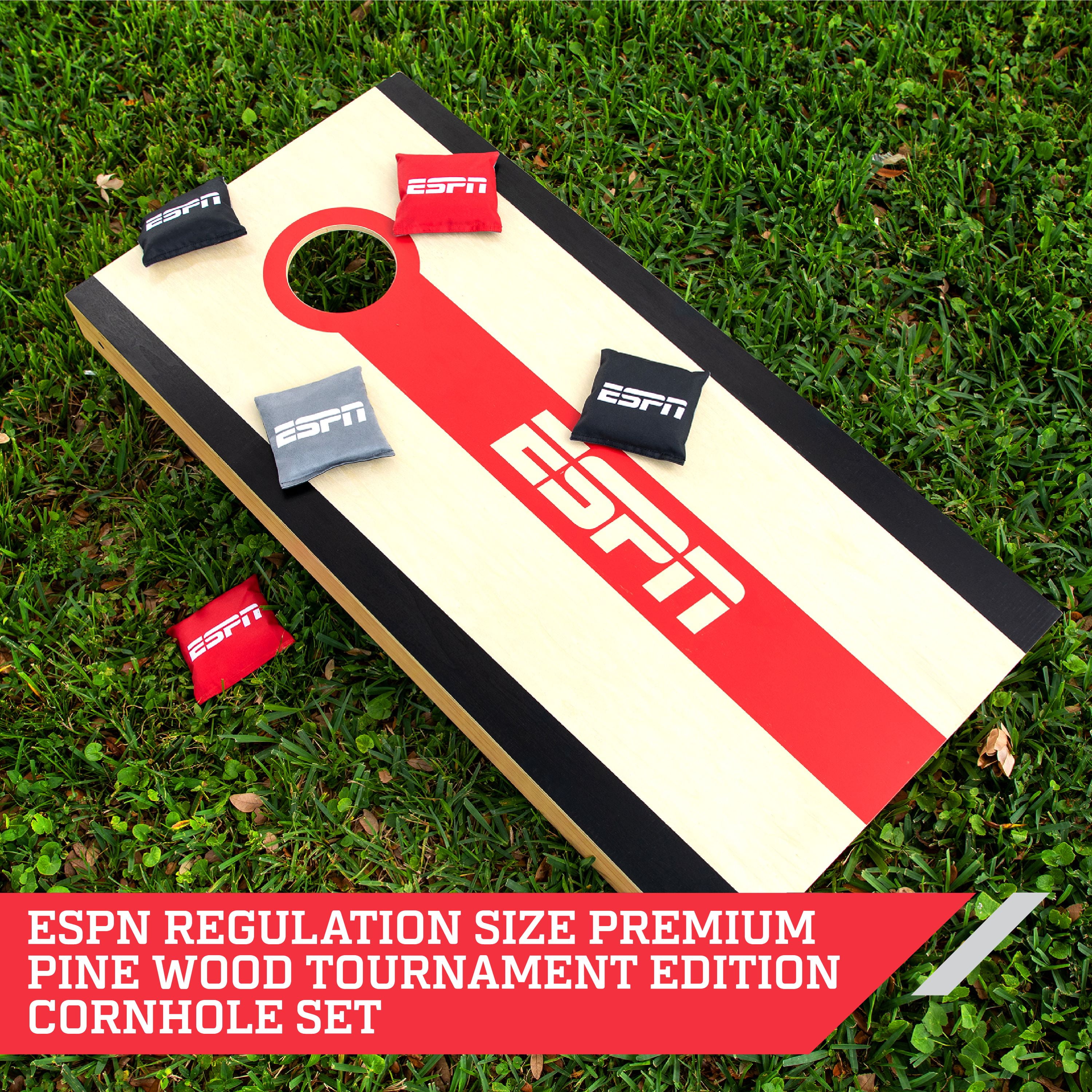 This ESPN Official size tournament cornhole bean bag toss boards meet ACA regulation requirements. Suited for professional players for daily practice or cornhole fans for lots of weekend fun. Hand crafted from solid New Zealand premium pine wood wood. Solid wood frame and leg construction support increased stability and bag performance. This set comes with two 4 x 2 ft. pre-assembled wooden cornhole boards and eight all weather two-sided slick & stick bean bags. The bags are regulation weight 16 oz. and size 6 inch. Guaranteed to impress you, your friends and family