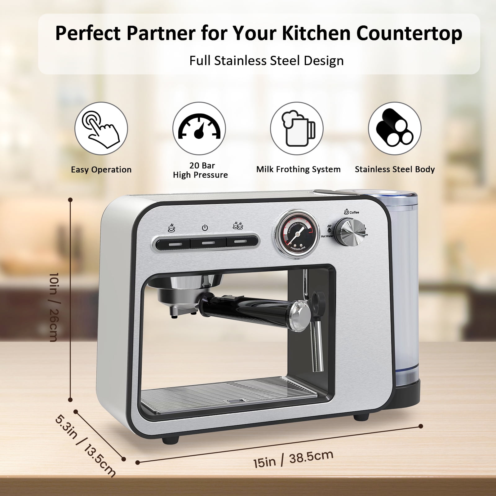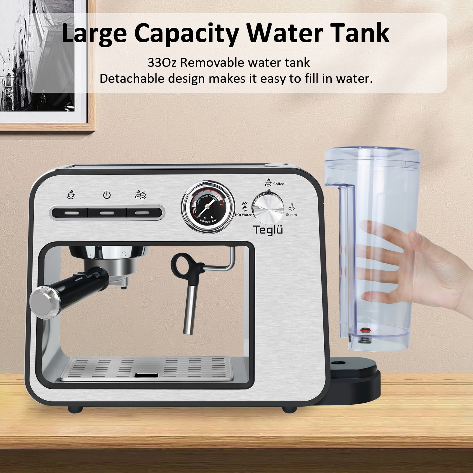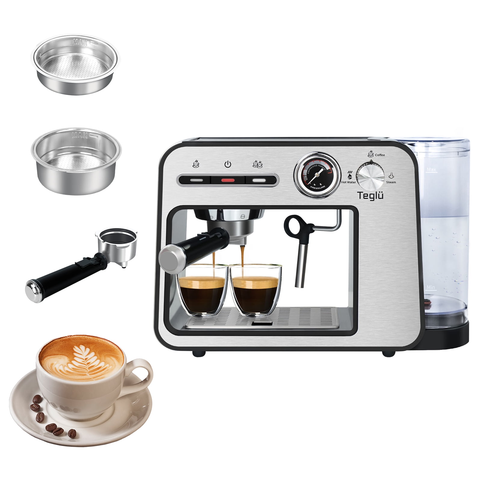 ♨️20 Bar Pump For Golden Extraction With Pressure Dial:Our espresso machine with 20 Bar pressure and 1450W power to extract a single(1.35oz/40ml) or double(2.7oz/80ml) espresso from fresh-ground beans for an authentic and dense cafe taste.The highly clear pressure dial can observe the range of pressure. ♨️Constant Double Temperature Control:With NTC temperature control system, espresso coffee machine with steamer supplies constant right temperature for brewing(197℉) and frothing(248℉). ♨️Easy To Clean:33oz/1L visible water reservoir BPA free features measurement markings for consistent 16 cups brewing.The removable drip tray allows you to use a taller cup max.4.7inch/12cm.The water tank, stainless steel drip tray, frothing nozzle, filter holder, brew head and frothing nozzle are all removable for a quick cleaning. ♨️Swiveling Sainless Steel Milk Frother:Powerful steam-brewing process heats milk to rich scoopable froth in seconds.Prepare rich & creamy cappuccinos, lates, or mokas like a barista at home with the latte & cappuccino coffee maker’s no-fuss milk frother. ♨️Cup-Warming Plate:Put cups on the top of espresso cappuccino machine to warm cups before brewing, make sure epresso in good temperature and taste. Best taste: 1 cup of 1.35oz/40ml, about 7g/ 1 spoon powder, 2 cups of 2.7oz/80ml,about 14g/ 2 spoons powder for the best concentration. ♨️What You Get:Accesories:coffee maker espresso, portafilter 54mm, filter 1-shot(suitable for ESE pod), filter 2-shot, measuring spoon with tamper, cleaning tool.Espresso latte machine, our 2-5 days fast delivery, worry-free 1 year warranty and life-time customer service. ♨️Note:1)Too coarse a grind, too little coffee, or insufficiently tamping the grounds before brewing can all lead to inadequate pressure for a proper brew;2)The amount of espresso extracted will vary depending on the grind size and amount and reprogramming may be needed when the size and amount are adjusted.
