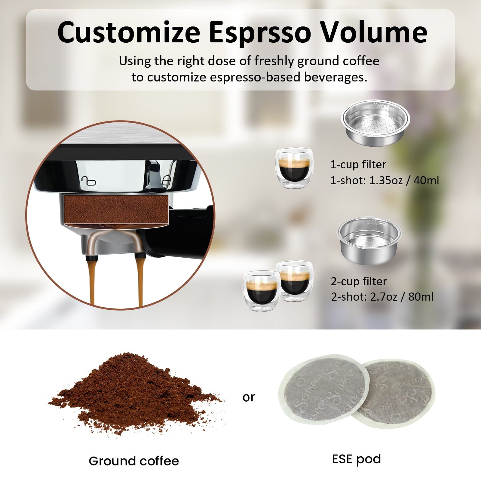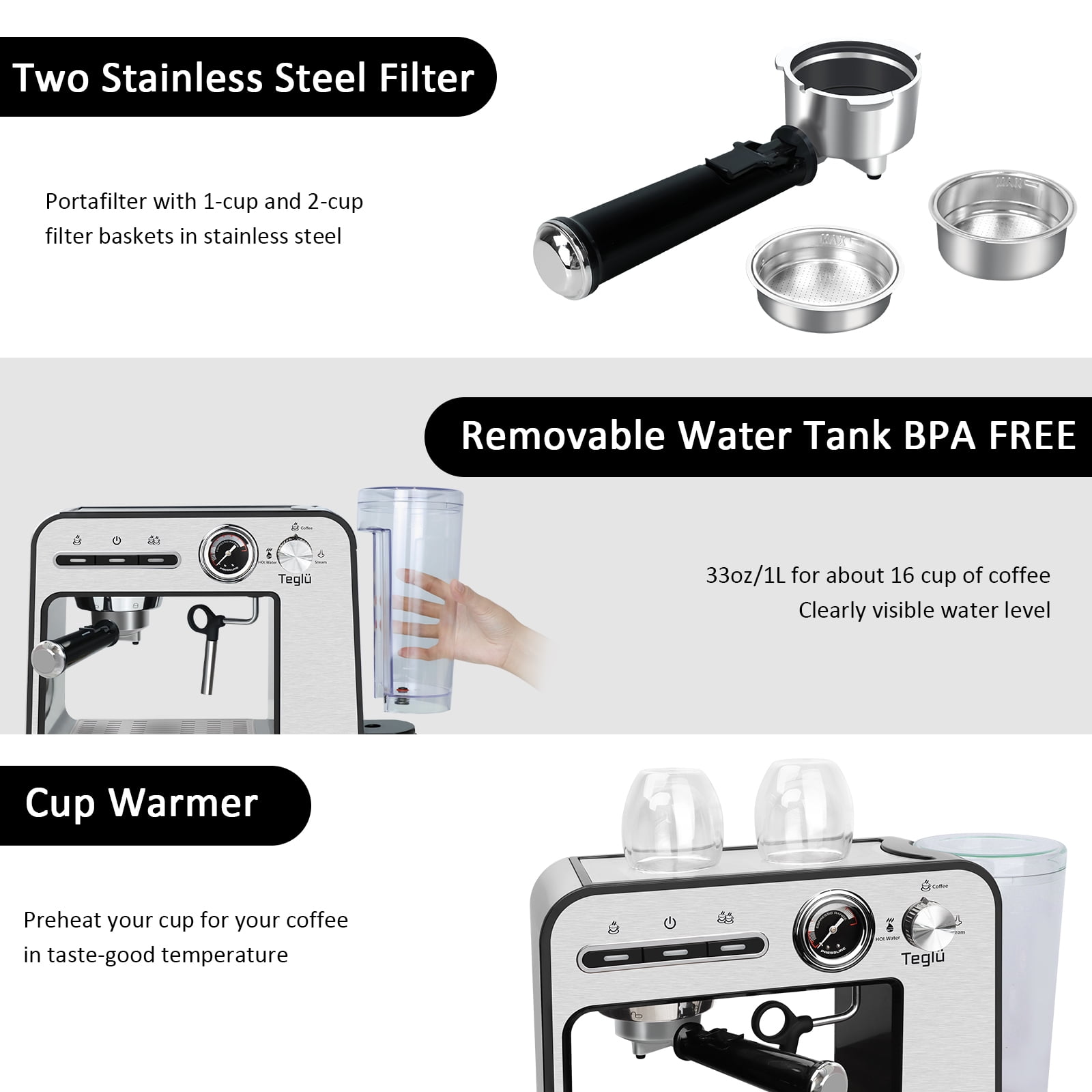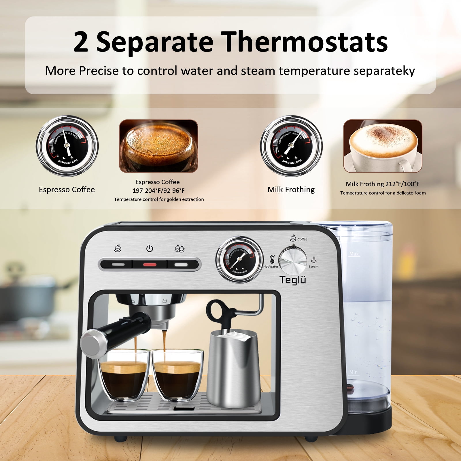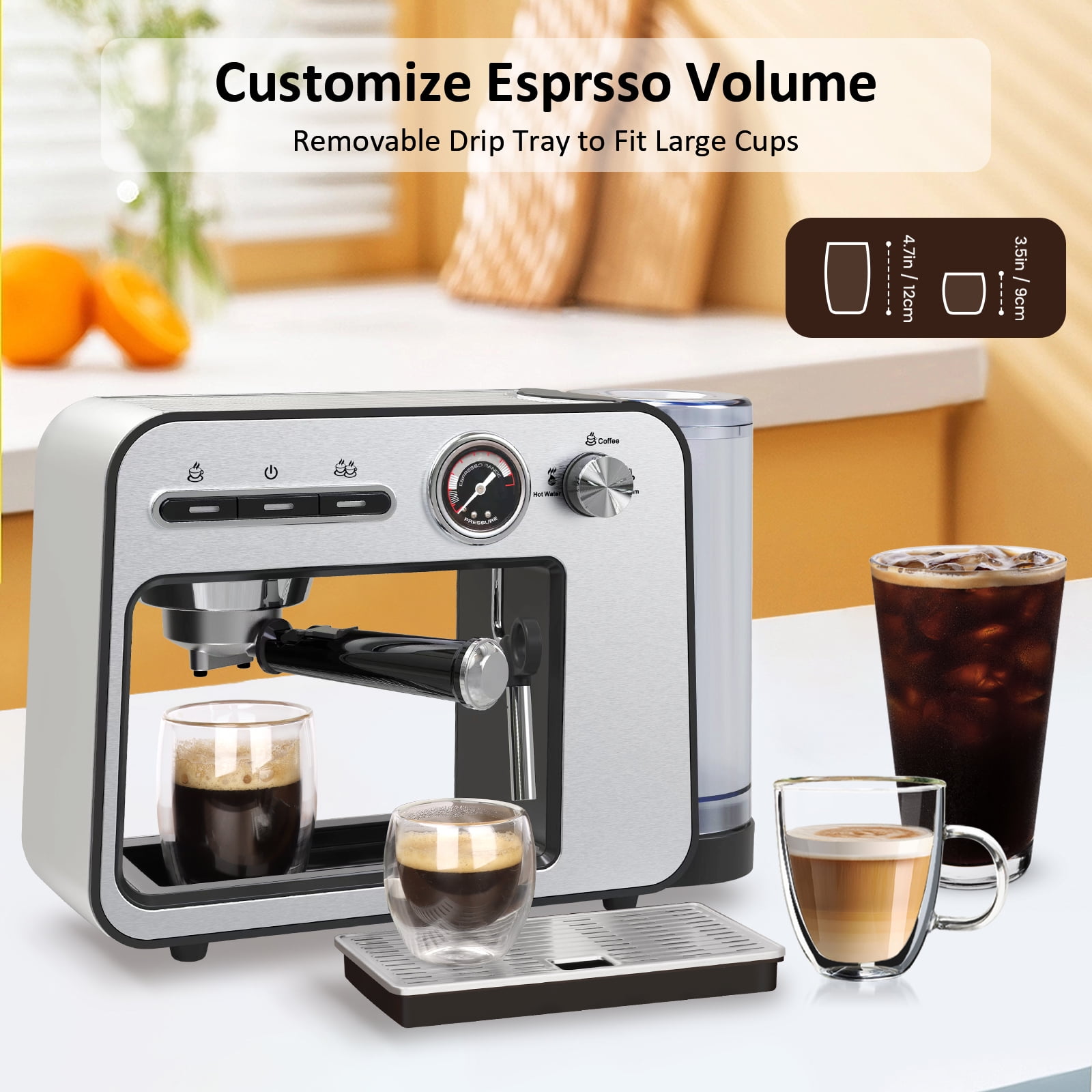 ♨️20 Bar Pump For Golden Extraction With Pressure Dial:Our espresso machine with 20 Bar pressure and 1450W power to extract a single(1.35oz/40ml) or double(2.7oz/80ml) espresso from fresh-ground beans for an authentic and dense cafe taste.The highly clear pressure dial can observe the range of pressure. ♨️Constant Double Temperature Control:With NTC temperature control system, espresso coffee machine with steamer supplies constant right temperature for brewing(197℉) and frothing(248℉). ♨️Easy To Clean:33oz/1L visible water reservoir BPA free features measurement markings for consistent 16 cups brewing.The removable drip tray allows you to use a taller cup max.4.7inch/12cm.The water tank, stainless steel drip tray, frothing nozzle, filter holder, brew head and frothing nozzle are all removable for a quick cleaning. ♨️Swiveling Sainless Steel Milk Frother:Powerful steam-brewing process heats milk to rich scoopable froth in seconds.Prepare rich & creamy cappuccinos, lates, or mokas like a barista at home with the latte & cappuccino coffee maker’s no-fuss milk frother. ♨️Cup-Warming Plate:Put cups on the top of espresso cappuccino machine to warm cups before brewing, make sure epresso in good temperature and taste. Best taste: 1 cup of 1.35oz/40ml, about 7g/ 1 spoon powder, 2 cups of 2.7oz/80ml,about 14g/ 2 spoons powder for the best concentration. ♨️What You Get:Accesories:coffee maker espresso, portafilter 54mm, filter 1-shot(suitable for ESE pod), filter 2-shot, measuring spoon with tamper, cleaning tool.Espresso latte machine, our 2-5 days fast delivery, worry-free 1 year warranty and life-time customer service. ♨️Note:1)Too coarse a grind, too little coffee, or insufficiently tamping the grounds before brewing can all lead to inadequate pressure for a proper brew;2)The amount of espresso extracted will vary depending on the grind size and amount and reprogramming may be needed when the size and amount are adjusted.