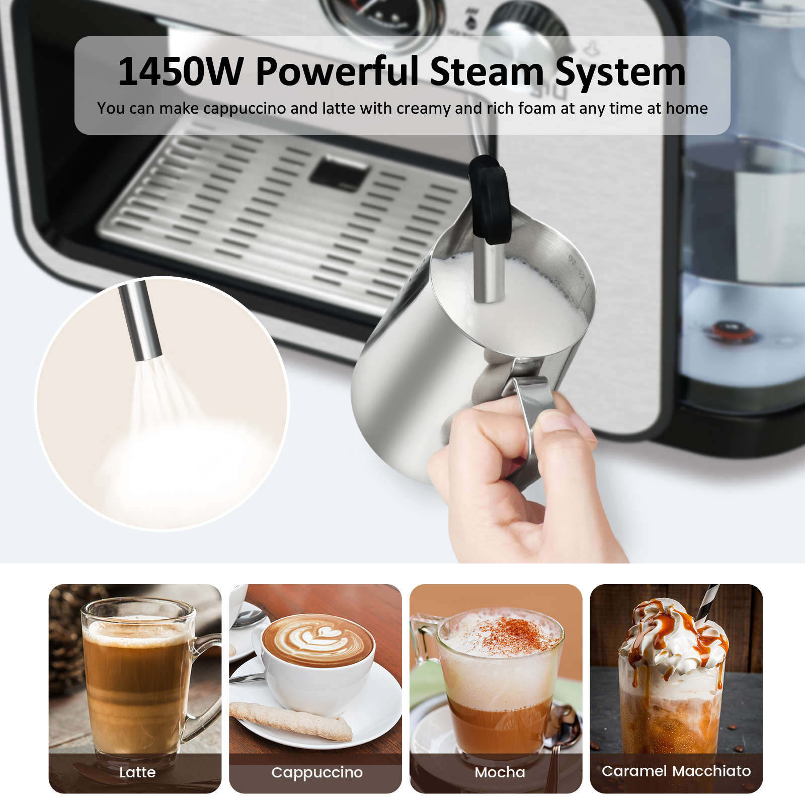 Espresso Machine 20 Bar with Milk Frother, Semi-Automatic Latte & Cappuccino Coffee Maker Duo-cup 33oz/1L Removable Water Tank for Home/Office, 1450W, Stainless Steel