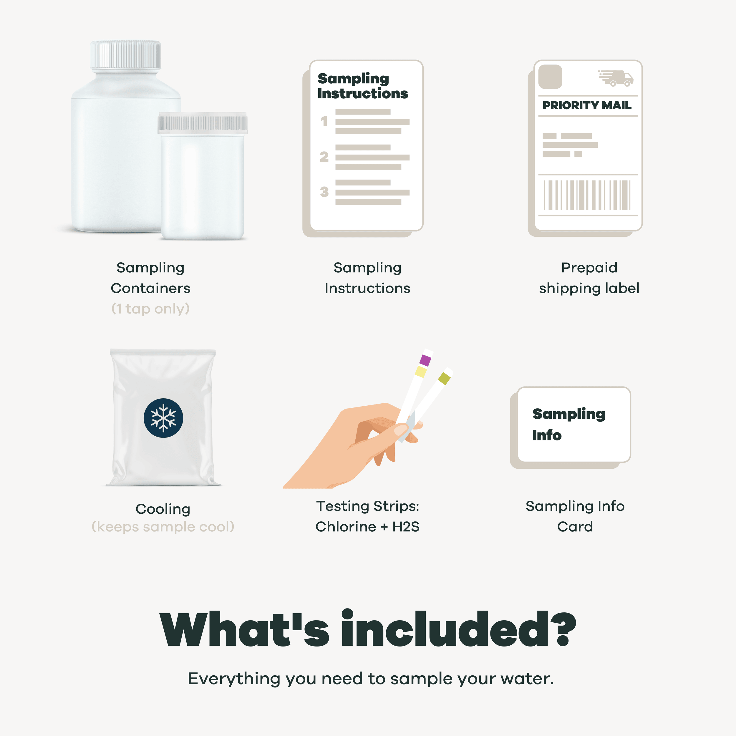 Package Contents: Sampling Instructions, Collection Bottles, Information Card(s), Pre-Paid Shipping Label, Return Container (if applicable).
