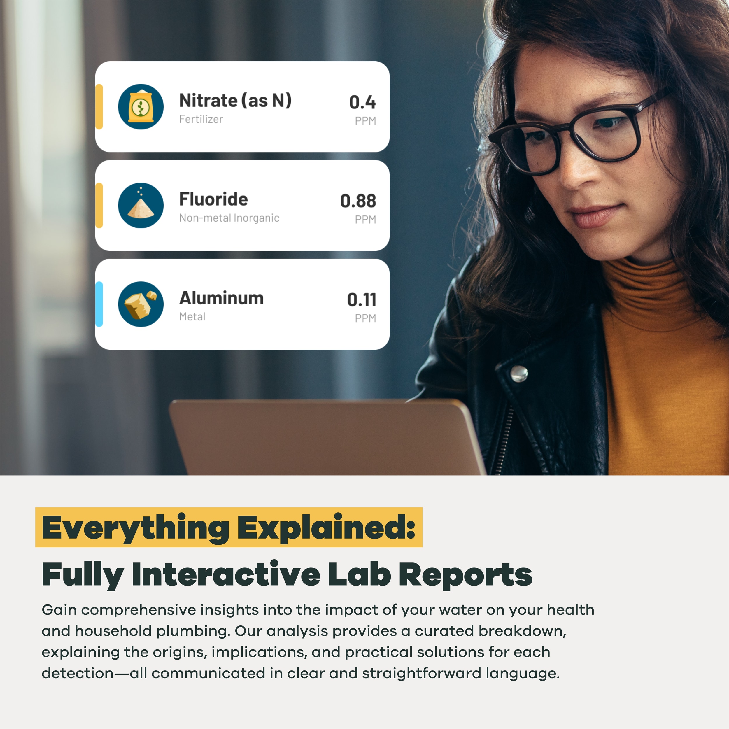 Certified laboratory water test for 54 common contaminants. EPA certified analysis includes testing for lead, arsenic, heavy metals, coliform and E. coli bacteria, nitrates, fluoride, hardness and more. Enjoy free prepaid shipping to the lab, easy sampling instructions, and everything you need to properly sample and test your water. Expert support from water chemists and engineers by chat, email, or phone is available. You’ll receive a comprehensive, digital Tap Score water quality lab report in 3-5 business days.