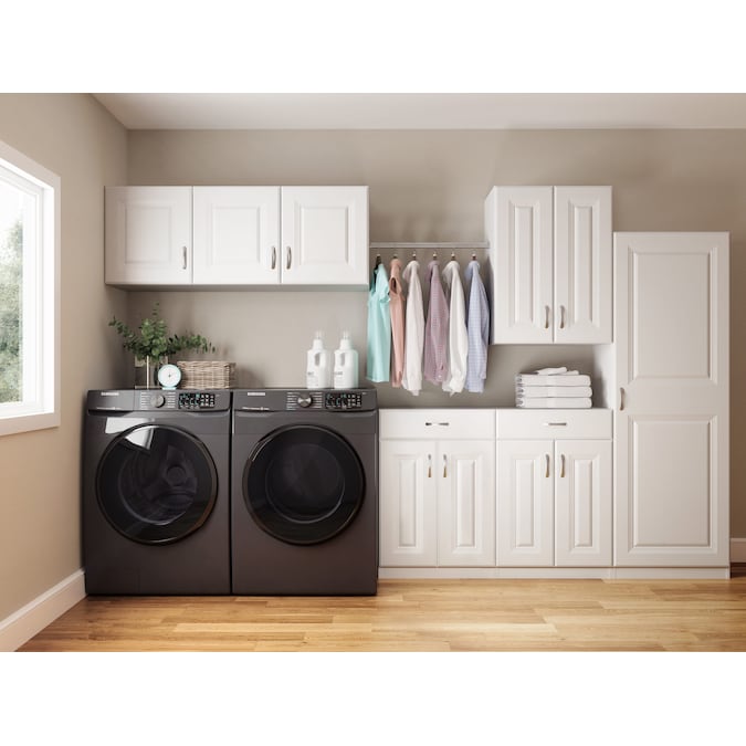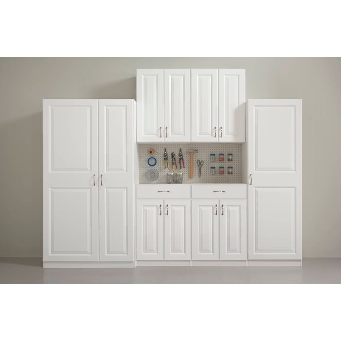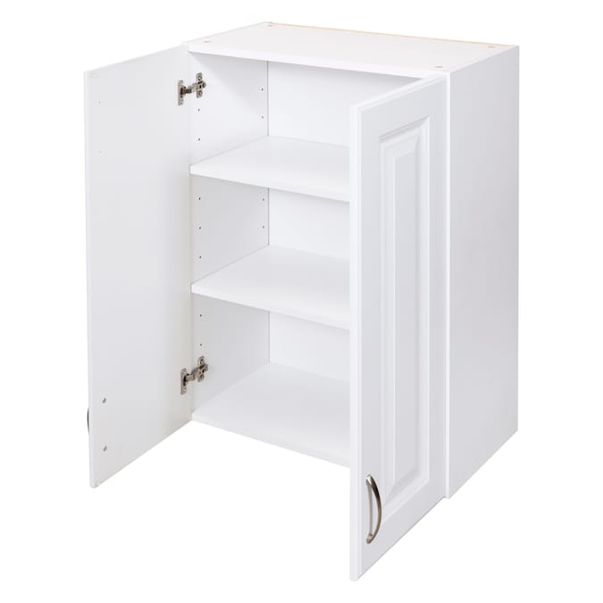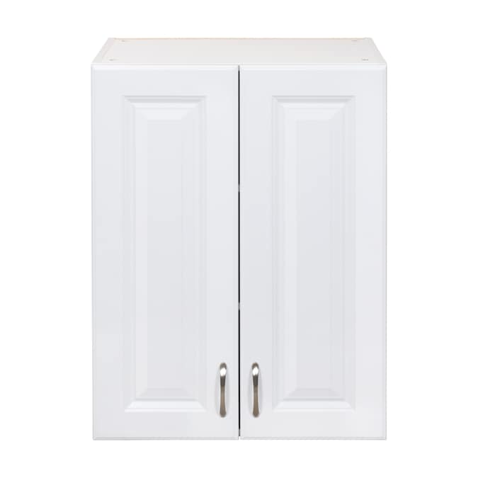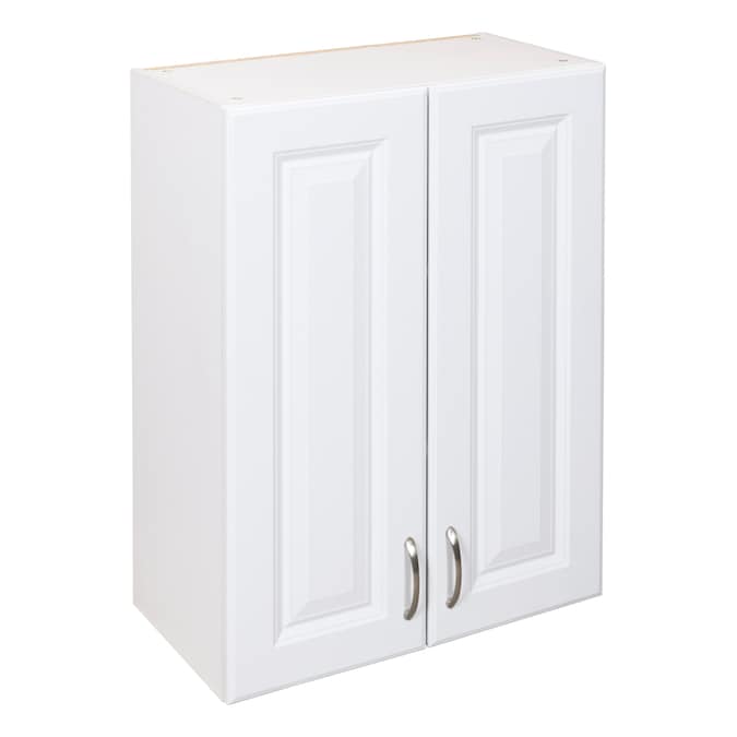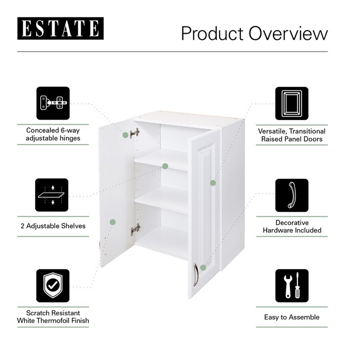 This 24 inch wall cabinet provides added storage in a transitional door style to complement any room. This wall cabinet features a raised panel door in a white thermo foil finish that is durable, scratch resistant, and easy to clean. This cabinet from the Estate collection is ideal for wall storage in your laundry room, bathroom and garage.
