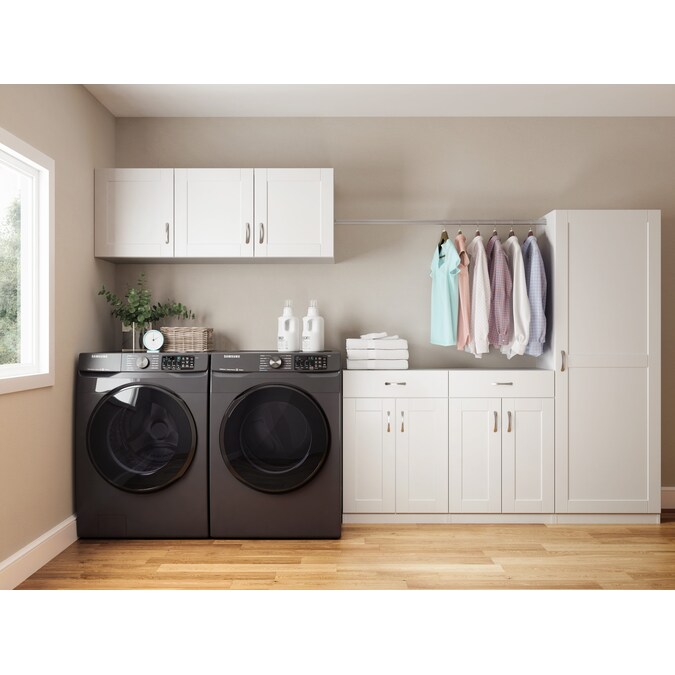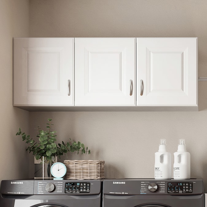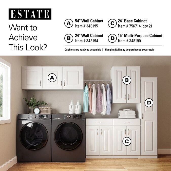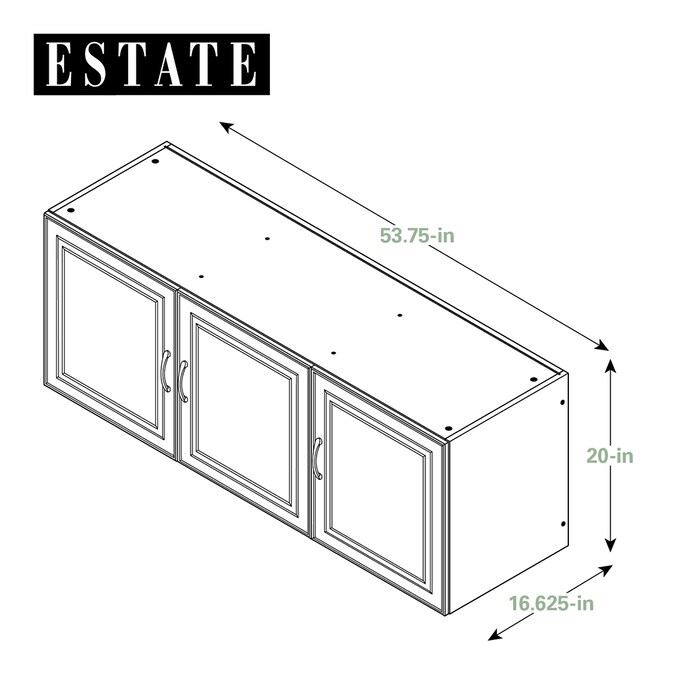 This 54 inch wall cabinet provides added storage in a transitional door style to complement any room. This wall cabinet features a raised panel door in a white thermo foil finish that is durable, scratch resistant, and easy to clean. This cabinet from the Estate collection is ideal for wall storage in your laundry room, garage, kitchen, and bathroom.