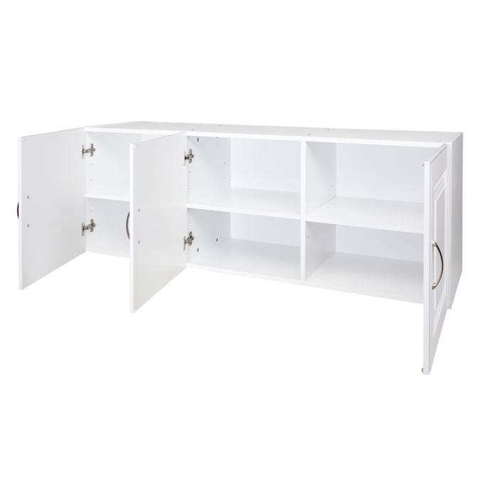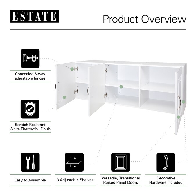 - Estate collection wall storage cabinet in a durable, scratch resistant white thermofoil finish provides versatile storage