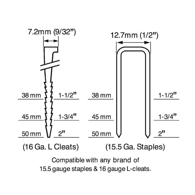 - Designed to use 16-Gauge L-cleats (1.5 in to 2 in) and 15.5-Gauge 1/2 In crown flooring staples (1.5 in to 2 in)