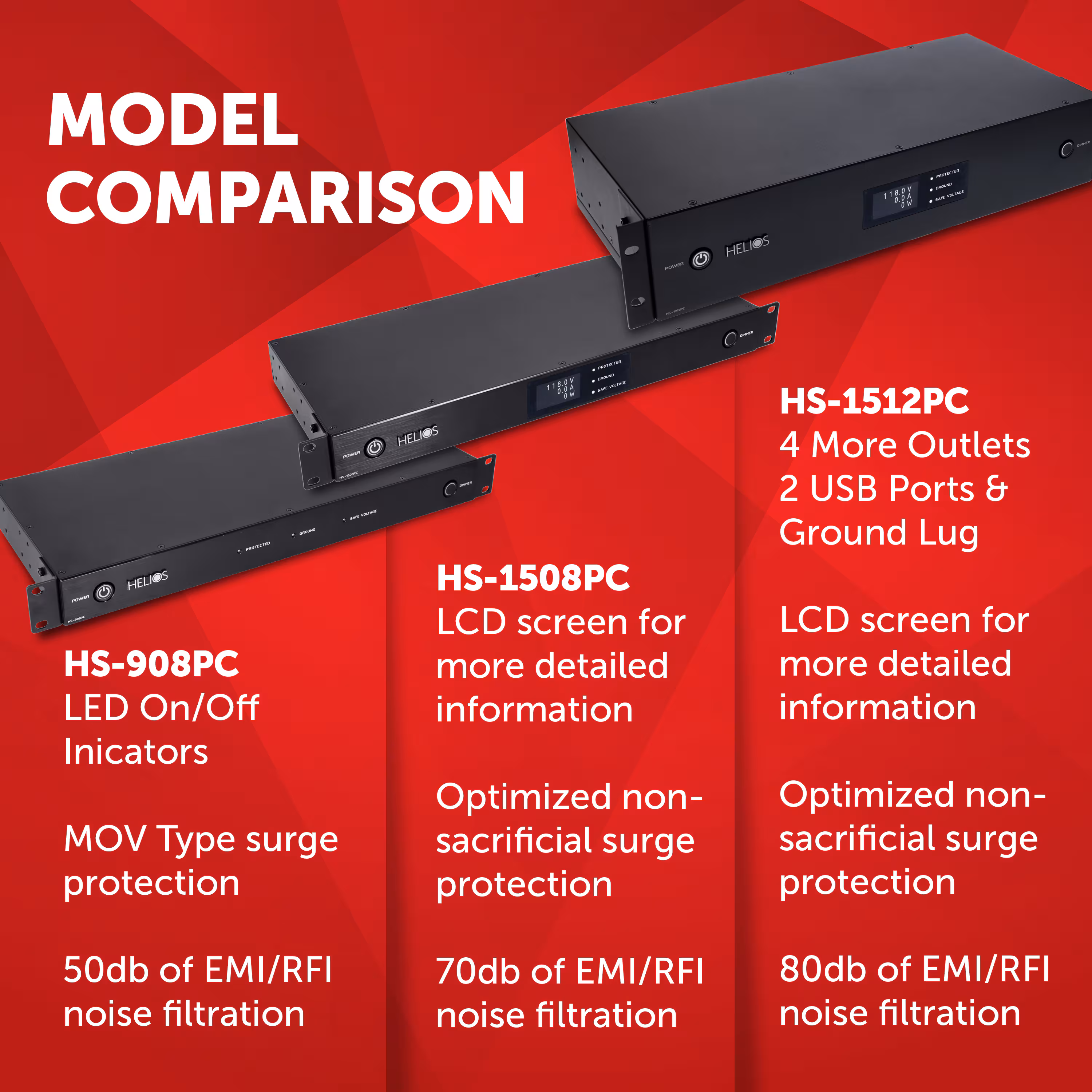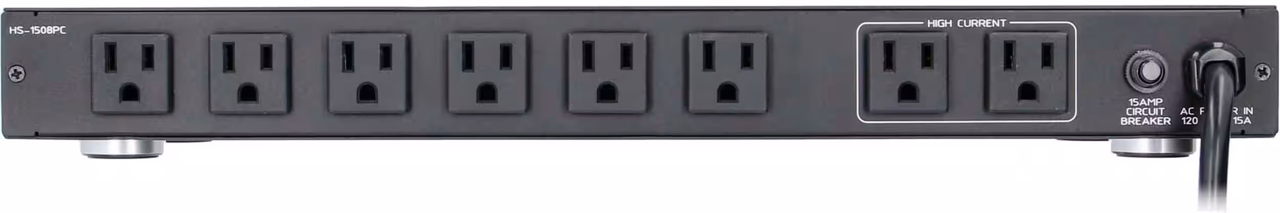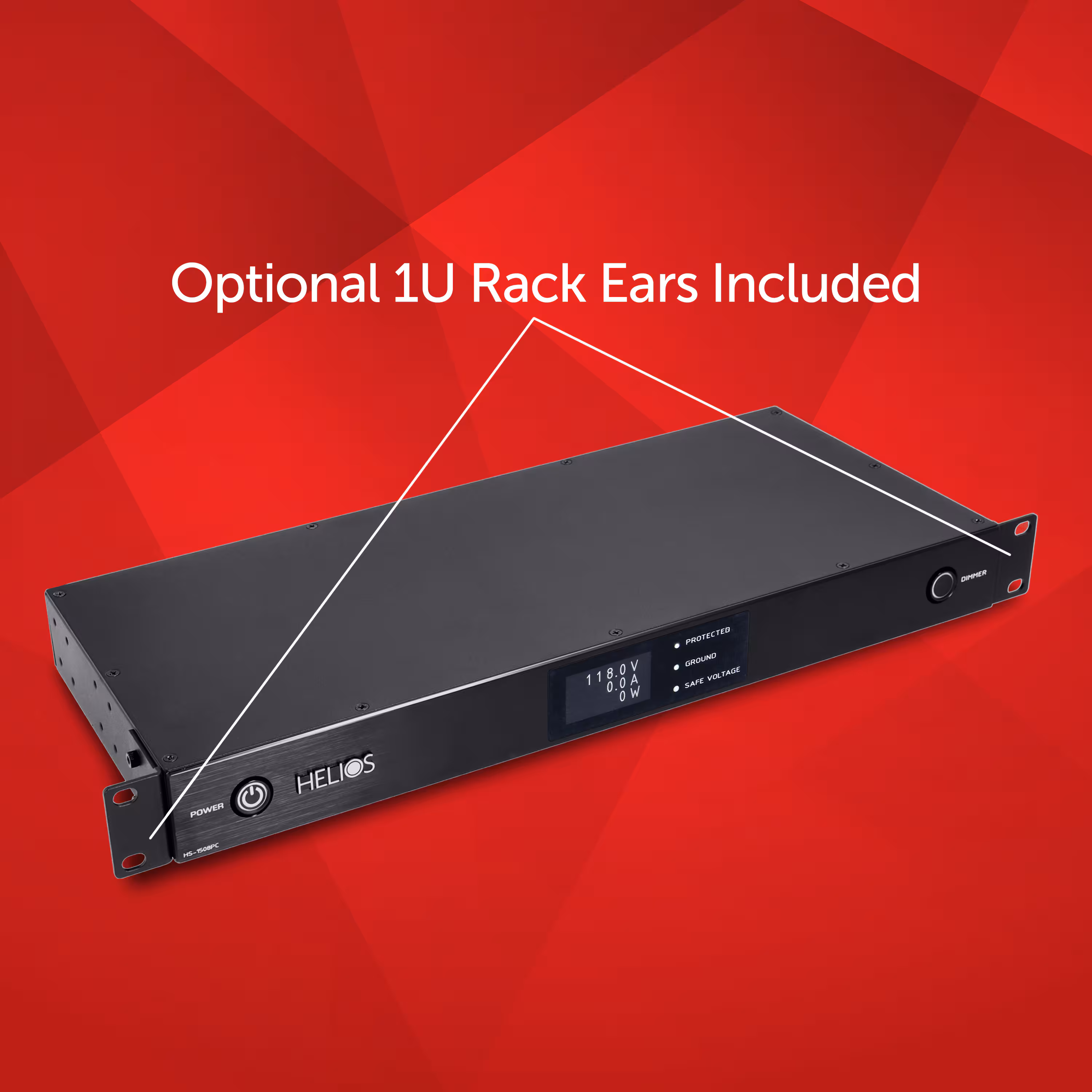 The HELIOS HS-1508PC surge protector redefines rack-mounted power with nonsacrificial surge suppression, eliminating performance degradation or sudden failures after a surge. This 1U powerhouse features eight switched outlets: six standard outlets and two high-current outlets for power-hungry gear. With 70dB EMI/RFI noise filtering, it delivers crystal clear audio and video signals, while the display and intuitive LED indicators keep you informed. Additionally, the right-angle power cord, removable rack ears, and rubber feet provide maximum installation flexibility.