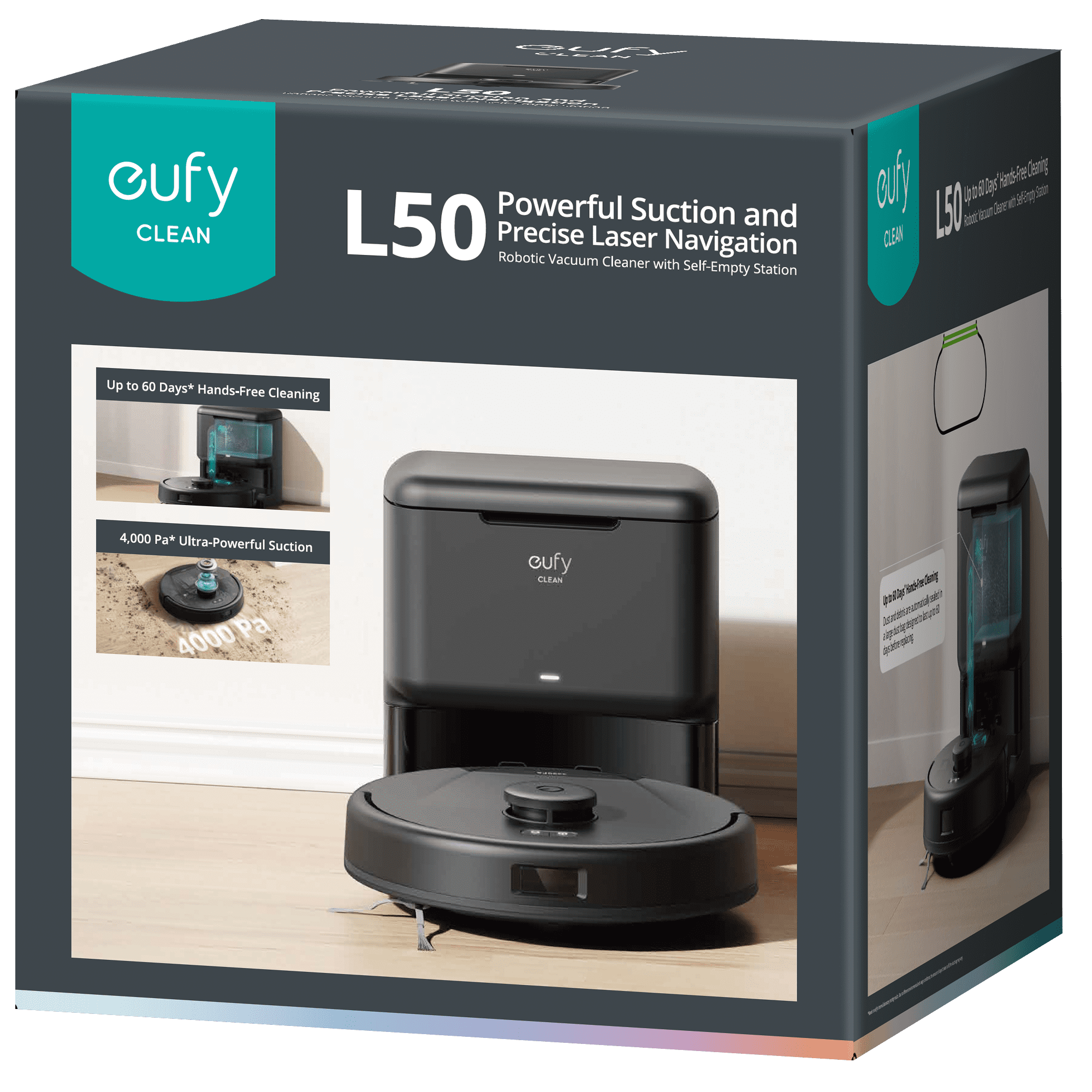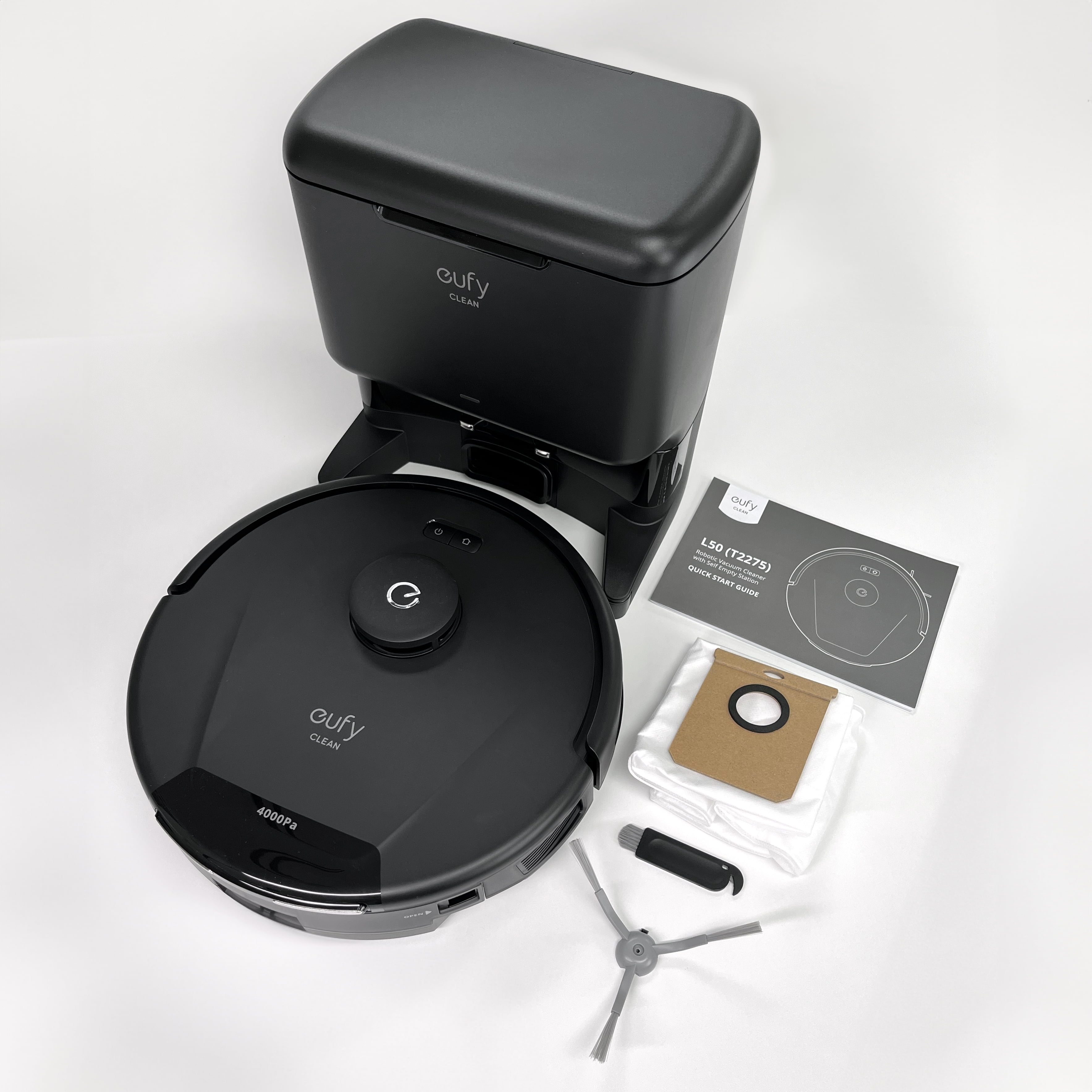 Up to 60 Days* Hands-Free Cleaning: Dust and debris are automatically sealed in a large dust bag designed to last up to 60 days before replacing 4,000 Pa Ultra-Powerful Suction: Up to 4,000 Pa of suction tackles everything from dust to crumbs for deeper cleaning Precise i-Path™ Laser Navigation: Precisely map your home with advanced LiDAR, which detects objects to effortlessly clean around them Customizable AI. Map™ 2.0: Customize your cleaning experience by selecting rooms to clean, No-Go Zones, and multi-floor mapping Boost-IQ™ Technology: Automatically increase suction power for different surfaces for maximum cleaning efficiency Fast Mapping: In fast mapping mode, L50 SES can scan and build a map of 2,000 ft² in just 15 min that can be easily customized with the eufy Clean app Child Lock: Keeps curious children and pets safe by preventing them from accidentally turning on and activating L50 SES What’s In The Box: 1 x eufy RoboVac L50 SES | T2275Z11, 5.51 lb 1 x Charging Base and Self Empty Station w/Power Adapter 1 x Side Brush 1 x Cleaning Tool 1 x Owner’s Manual