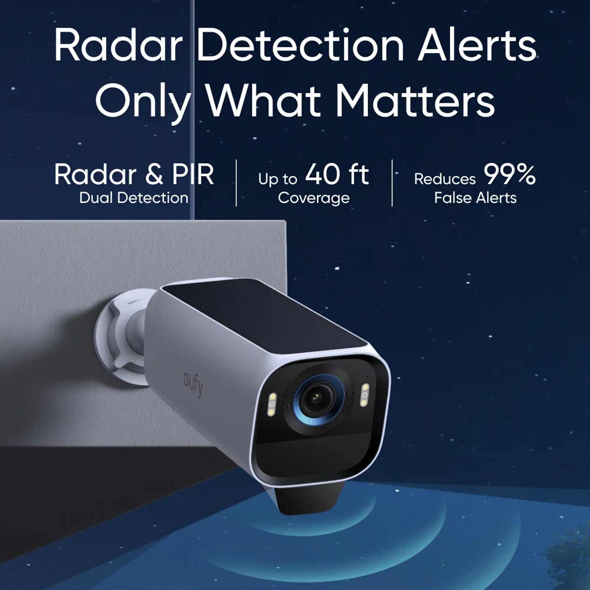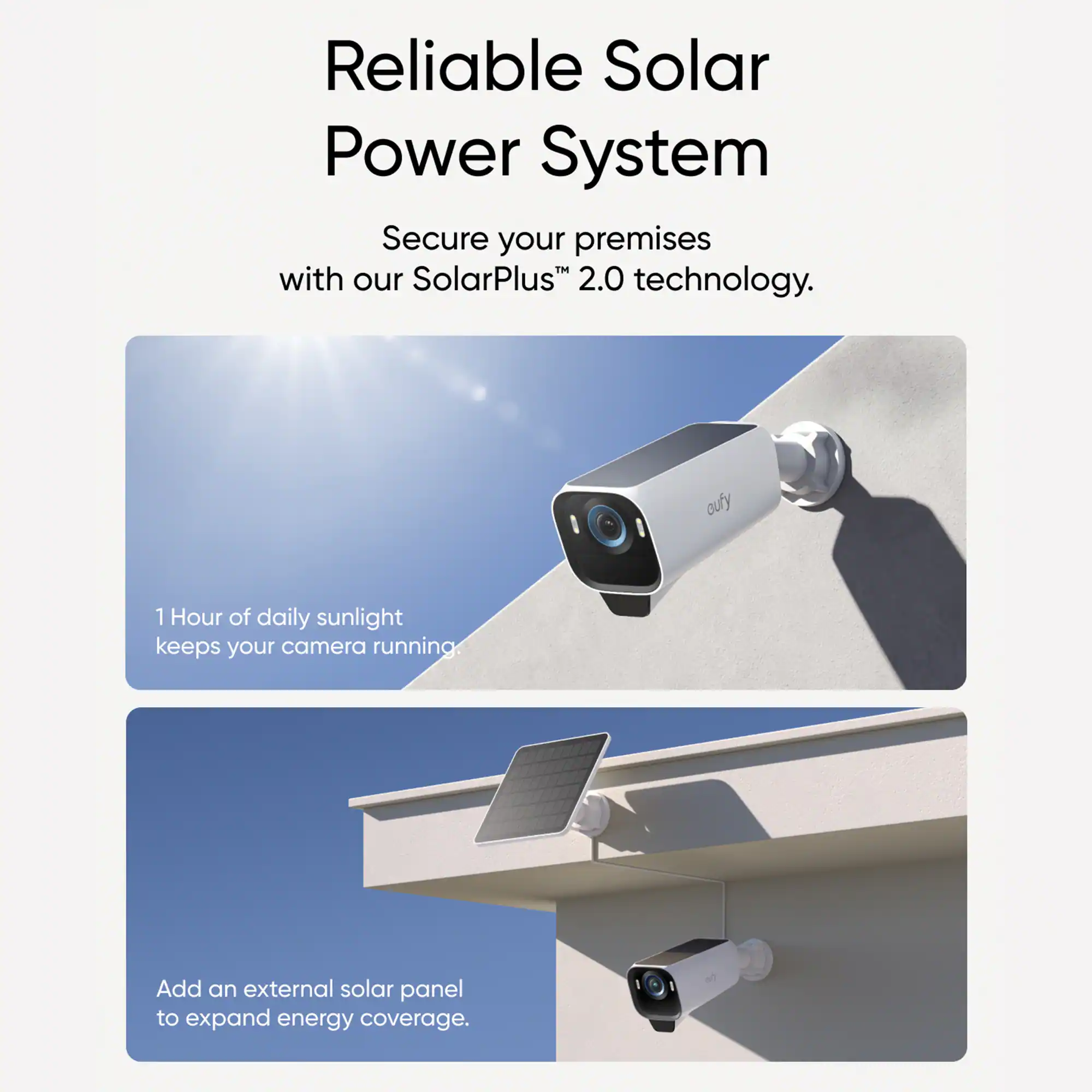 Experience revolutionary home protection with eufyCam S3 Pro 2-Camera Kit. This revolutionary home security solution provides unparalleled surveillance with pro-level technologies and user-friendly features. View exceptionally detailed video footage in 4K UHD clarity. Delivering day-like image quality even in ultra-low light evening conditions without the need for a spotlight thanks to exclusive MaxColor Vision™ technology. View crystal-clear faces and license plates up to 30 ft (9 m) away even in minimal ambient light as AI-powered image processors deliver vivid colors, high dynamic range, and sharp details. Choose from four unique night vision modes to suit any lighting condition: Human Vision Mode, MaxColor Vision™ Mode: See in full color in ultra-low light conditions, Adaptive Spotlight Mode: View clear, colorful images at night, and Infrared Night Vision Mode: Delivers crisp black-and-white visuals. Enjoy up to 365 days of battery life with integrated solar panels featuring SolarPlus™ 2.0 technology. Requiring just 1 hour of daily sunlight to stay fully charged, the refined solar panel ensures partial shade won’t hinder the ability to initiate charging of the camera and internal 13000mAh rechargeable battery for continuous, reliable power. Expand your power options with the included external solar panel. Minimize false alerts with dual motion detection that combines radar and passive infrared (PIR) technology. Enjoy added peace of mind with precise notifications for human and vehicle movements, ensuring you never miss important events. The motion-activated Adaptive Spotlight adjusts lighting for optimal footage quality and energy efficiency. The camera provides 16GB of built-in local storage* and no monthly subscription fees. The eufy app allows you to set customizable detection zones, enjoy 24/7 smart snapshots that capture periodic images for efficient surveillance, and communicate in real-time with delivery drivers or visitors, The camera’s dual-mic array and AI-driven noise reduction technology, captures voices up to 26 ft (8 m) away.