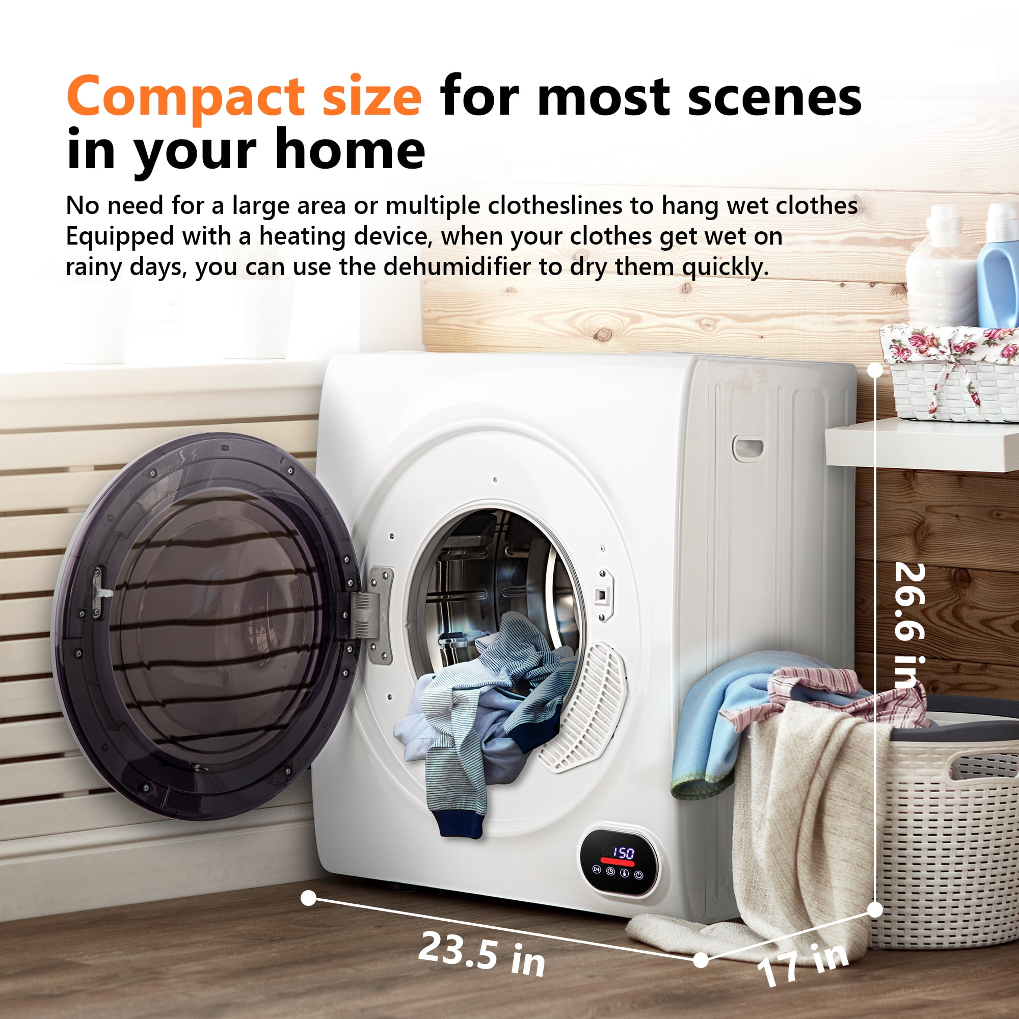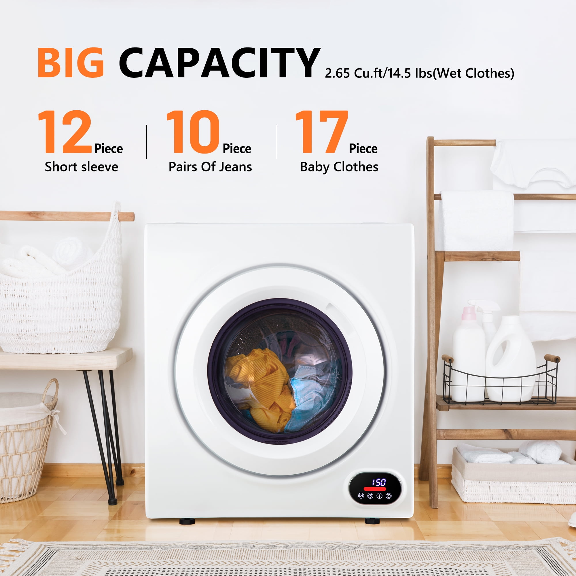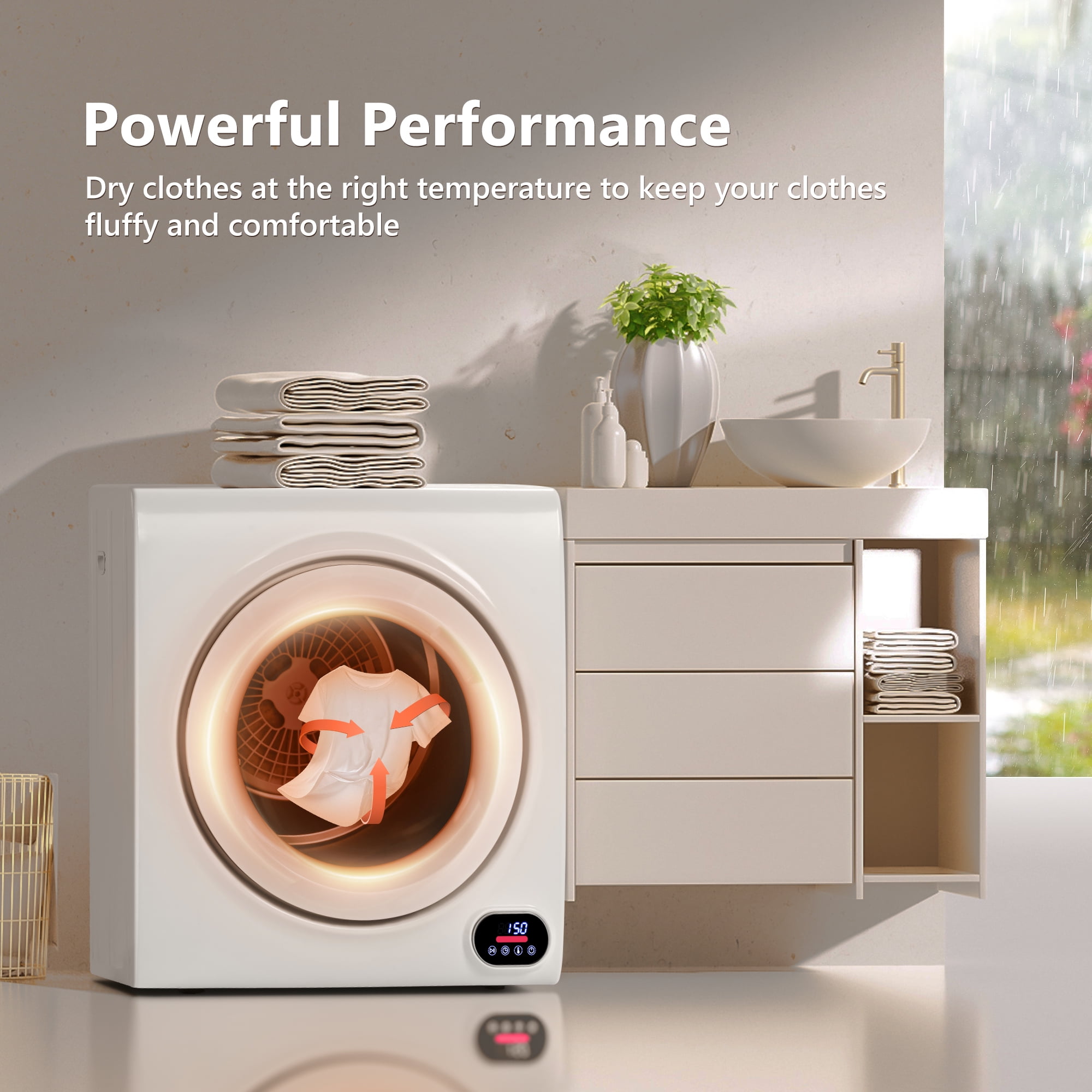 Exceptional Drying Performance: Meet our compact clothes dryer, crafted to deliver flawless drying results. Equipped with a robust 1400W motor and a generous 2.64 cu. ft. capacity, it ensures impeccable drying every time. Customizable Drying: Effortlessly dry up to 14.5 lbs of wet clothes and 9 lbs of dry clothes. Choose from Powerful, Smart, Environmental Protection, or General modes to cater to your specific fabric and drying needs. Swift and Luxurious Drying: Enjoy rapid drying with a maximum temperature of 140℉, eliminating damp and clumpy garments. Revel in the luxury of quick, fluffy drying, leaving your clothes ready for anything. Convenience Meets Innovation: Featuring an automatic stop function and a transparent window, our mini dryer is both practical and innovative. Easily monitor the drying process and keep lint at bay with a removable, washable lint filter. Compact and Efficient: Our portable dryer is a space-saving powerhouse, perfect for apartments, homes, and dorm rooms. It conserves energy and saves you time, backed by a 1-year warranty and ETL/DOE certifications for added assurance. 1-Year Warranty: Enjoy hassle-free laundry with our mini dryer, which includes user-friendly controls and essential accessories. Safety certifications provide added peace of mind, and a 1-year warranty is included for your convenience.
