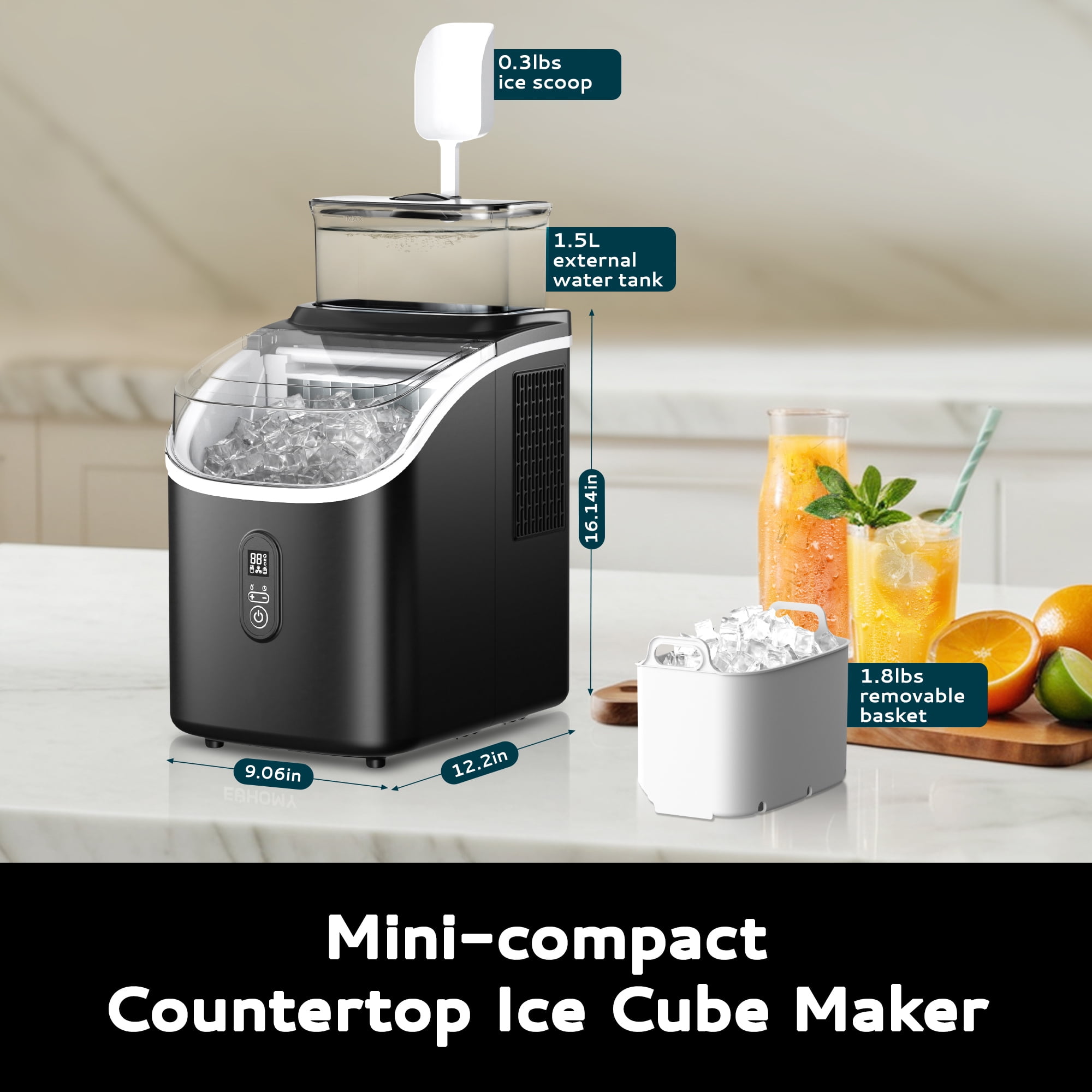Rapid Ice Making: This compact and charming countertop ice maker produces 16 high-quality, crystal-clear ice cubes in just 13 minutes. Elevate your chill with refreshing drinks! Abundant Ice Supply: With a daily capacity of up to 34.5 pounds, you’ll never run out of ice. Whether it’s for a party or a lively family gathering, this portable ice maker meets all your chilling needs. 2.0L Detachable Water Tank: Equipped with a spacious 2.0L water tank, our small ice maker ensures a continuous supply of ice. Its detachable design also serves as a storage container and is easy to maintain and clean. ! Timed Ice Making: Enjoy convenience with our portable ice maker’s 24-hour timer. Set it to make ice overnight so you can have fresh ice ready in the morning, perfect for enjoying refreshing drinks right away. Quiet and Durable: Adding a touch of cool to your life! With a sturdy, durable design and minimal operating noise, this ice maker features a cute LCD display. Let this stylish appliance become a charming addition to your kitchen!