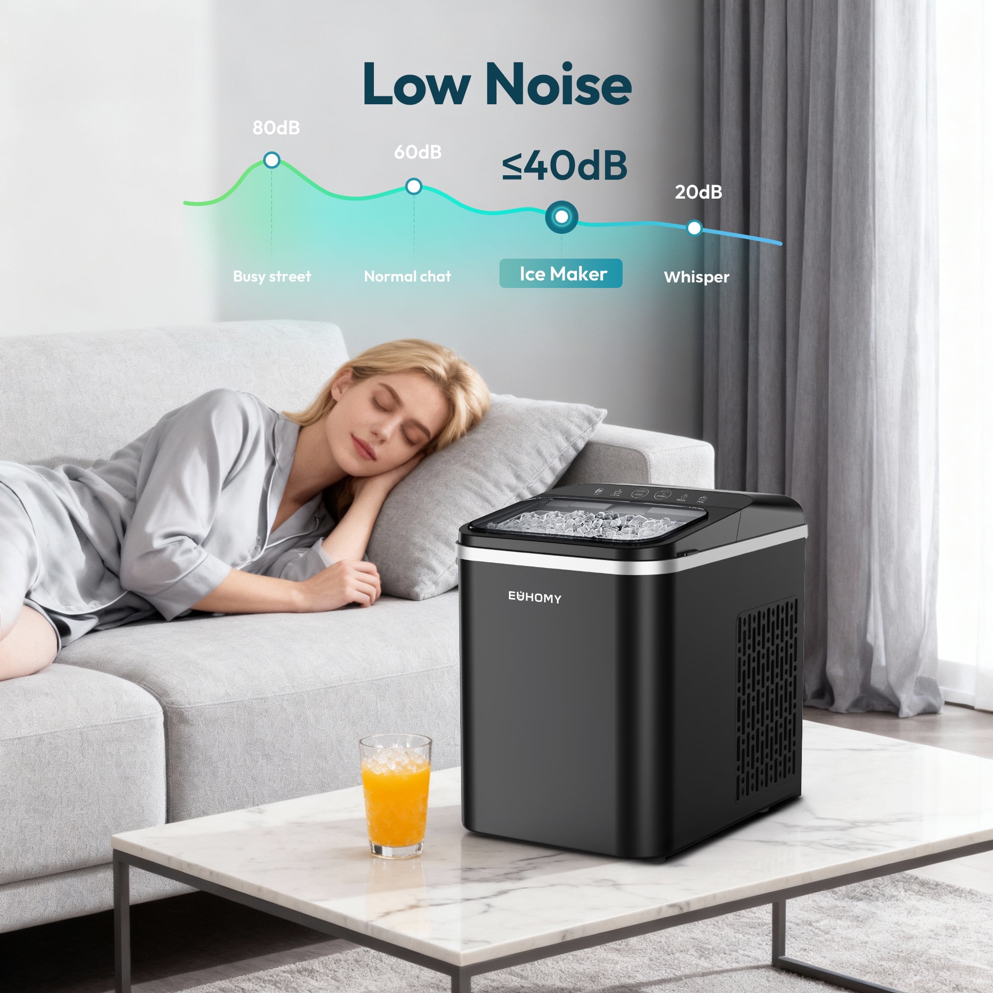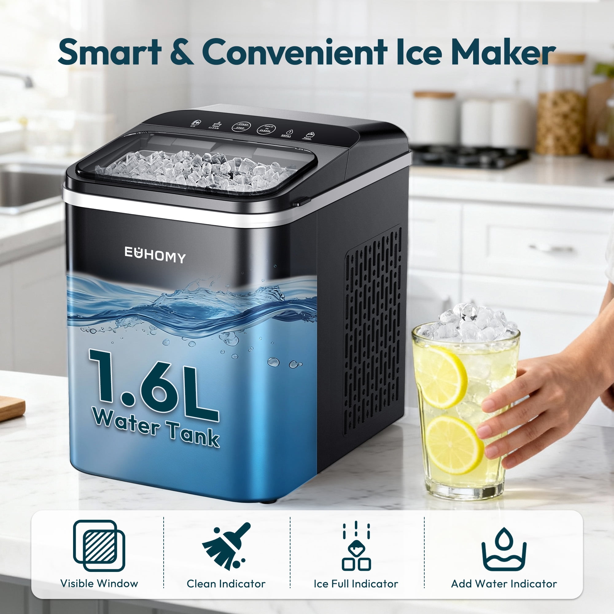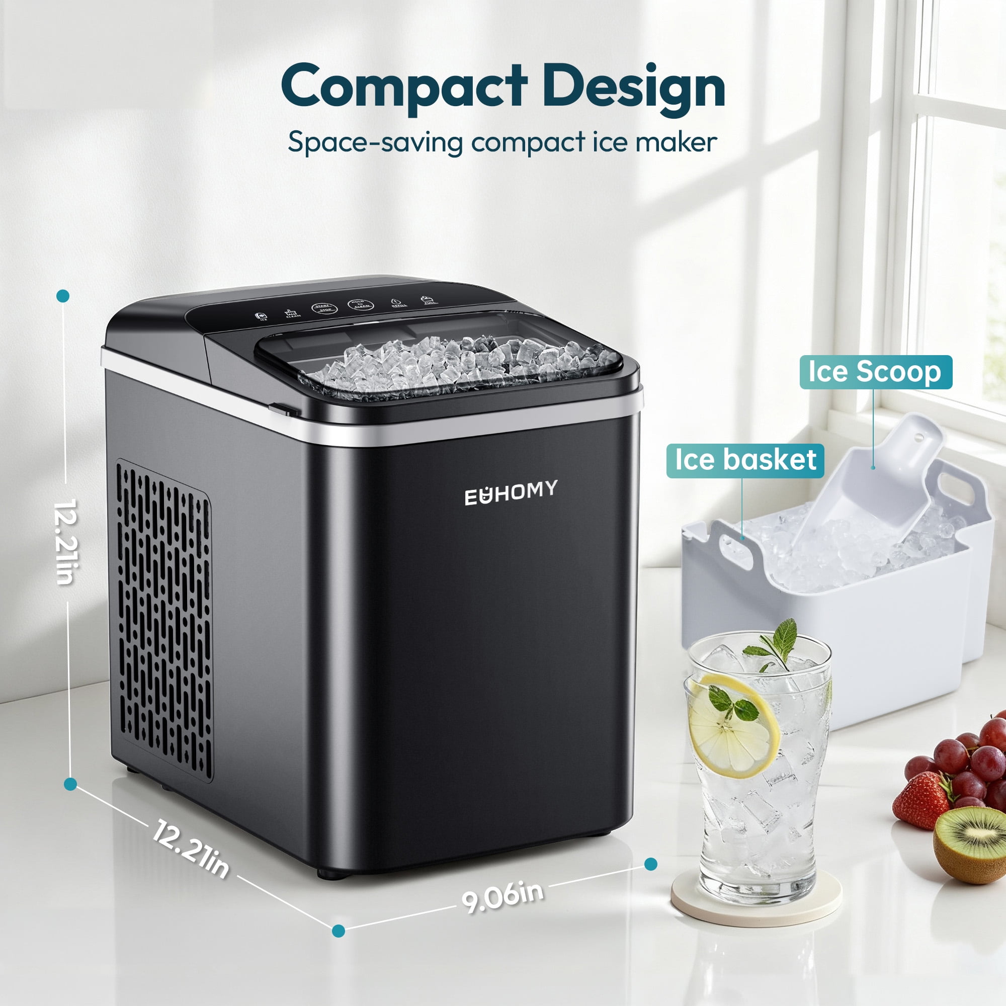 Tired of constantly running out of ice during gatherings or spending a fortune on bagged ice that clutters your freezer? The Euhomy Ice Maker is your game – changer. This sleek, countertop nugget ice maker is designed to meet the needs of ice – loving families and party hosts. This sleek nugget ice maker countertop produces up to 33 lbs of ice in a day, with your first batch ready in just 10 minutes. The Euhomy Ice Maker features a user – friendly LED control touch panel that makes operation a breeze. Simply plug it into any 120V grounded outlet, fill the 1.6L water tank, and enjoy! The 0.5kg ice basket capacity ensures you have plenty of ice on hand, while indicators for water shortage and ice fullness keep you informed. This nugget ice machine operates efficiently within a temperature range of 10 – 40℃, making it perfect for any home environment. Whether you’re enjoying cocktails, sodas, or just a refreshing glass of water, the Euhomy Ice Maker is your ultimate sidekick. Upgrade your home today and say goodbye to the hassle of buying bagged ice. Let your Euhomy Ice Maker bring the perfect blend of efficiency, style, and convenience! Up to 33lbs ice in 24H, fast ice making in 10 mins Compact size, perfect for home and small office use. Works under 40dB. High – capacity water tank and ice basket. Spiral extrusion continuous ice – making structure for efficient ice production. Transparent window on the lid for easy monitoring. 2 – key 4 – light function indicator for easy operation. Auto Self-cleaning function ETL certified for safety assurance. Specification Voltage/Frequency: 120V/60Hz Operating cycle: 10mins Ice shape: Nugget Ice capacity: 33lbs/24h Water tank: 1.6L(0.42gal) Ice basket capacity: 1.1lbs Color: Black Material: Plastic Product size:12.21*9.06*12.21in(D×W×H) Net weight: 19.81lbs Refrigerant/Refrigerant amount: R600a/0.74 Oz(21g) Package included: 1x Ice maker 1x Ice Scoop 1x Ice Basket 1x User manual