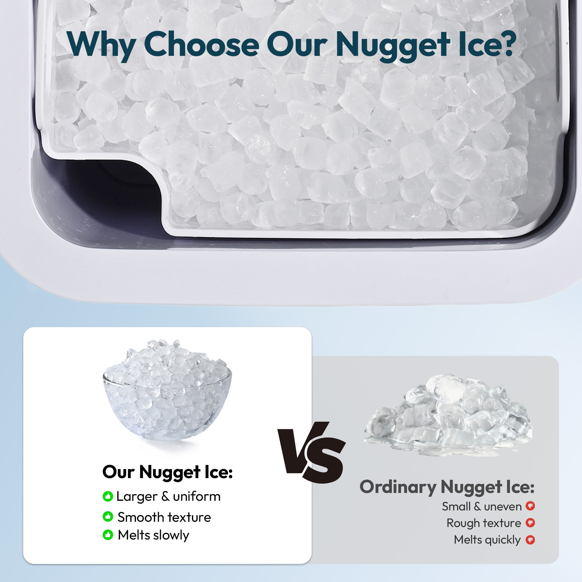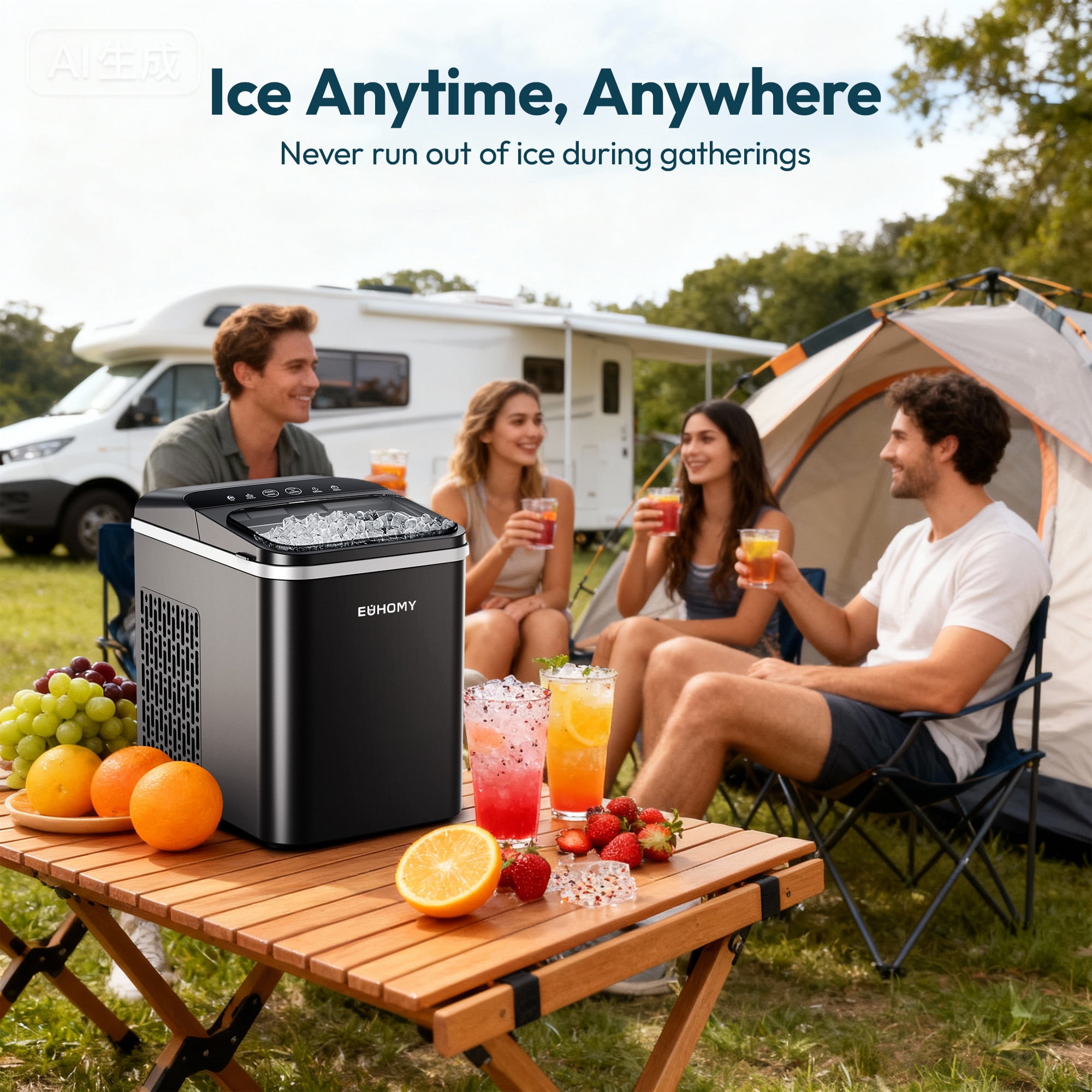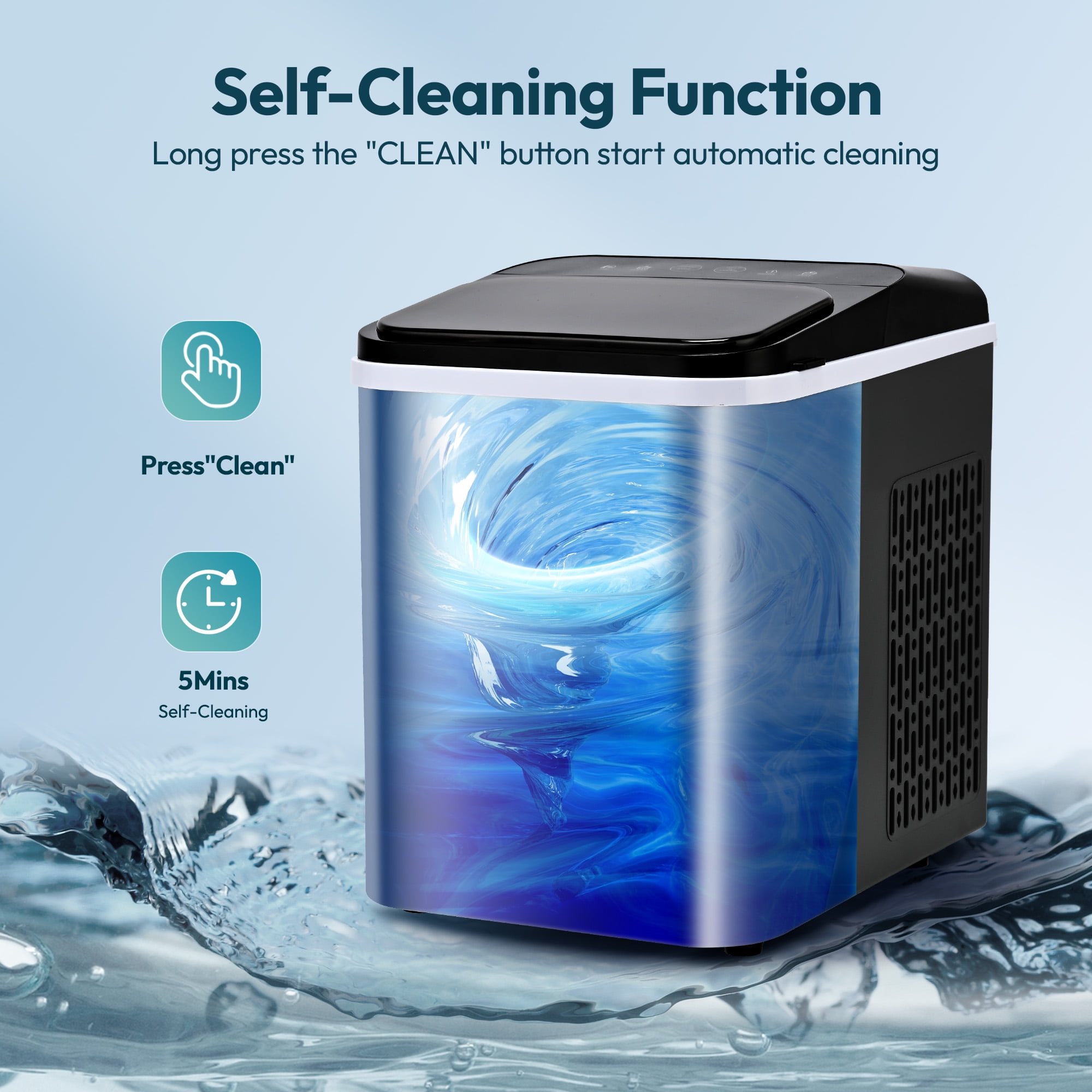[Quick & Chewable Ice Production] Our ice maker is designed to produce delicious, chewable ice cubes in just a few minutes. With a daily output of up to 33 lbs of ice, it ensures you have enough ice for any occasion. [Portable & Space-Saving Design] This countertop ice maker is compact and lightweight, making it easy to place on your kitchen counter, bar, or outdoor patio. Its portable nature allows you to move it around effortlessly, whether for a party, camping trip, or other events where ice is needed. [User-Friendly & Low Maintenance] The intuitive control panel makes operation simple: just add water, plug it in, and press the power button. The self-cleaning function ensures the ice remains fresh and free of contaminants, with indicator lights for “ICE FULL” and “REFILL” keeping you informed. [Quiet & Energy-Efficient Operation] Enjoy a noise-free experience with this ice maker, which operates quietly, making it perfect for home use. It also features energy-saving modes, reducing power consumption and making it an economical and environmentally friendly choice. [Versatile Use for Home & Parties] Ideal for entertaining, this ice maker ensures you never run out of ice during gatherings, family events, or warm days. It’s also great for everyday use in homes, providing a continuous supply of fresh chewable ice for drinks, smoothies, or keeping food cold. [Self-Cleaning Function] With just a press of a button, the self-cleaning function keeps the ice maker clean and hygienic. It reduces manual cleaning efforts and ensures fresh, contaminant-free ice, perfect for maintaining both health and taste.