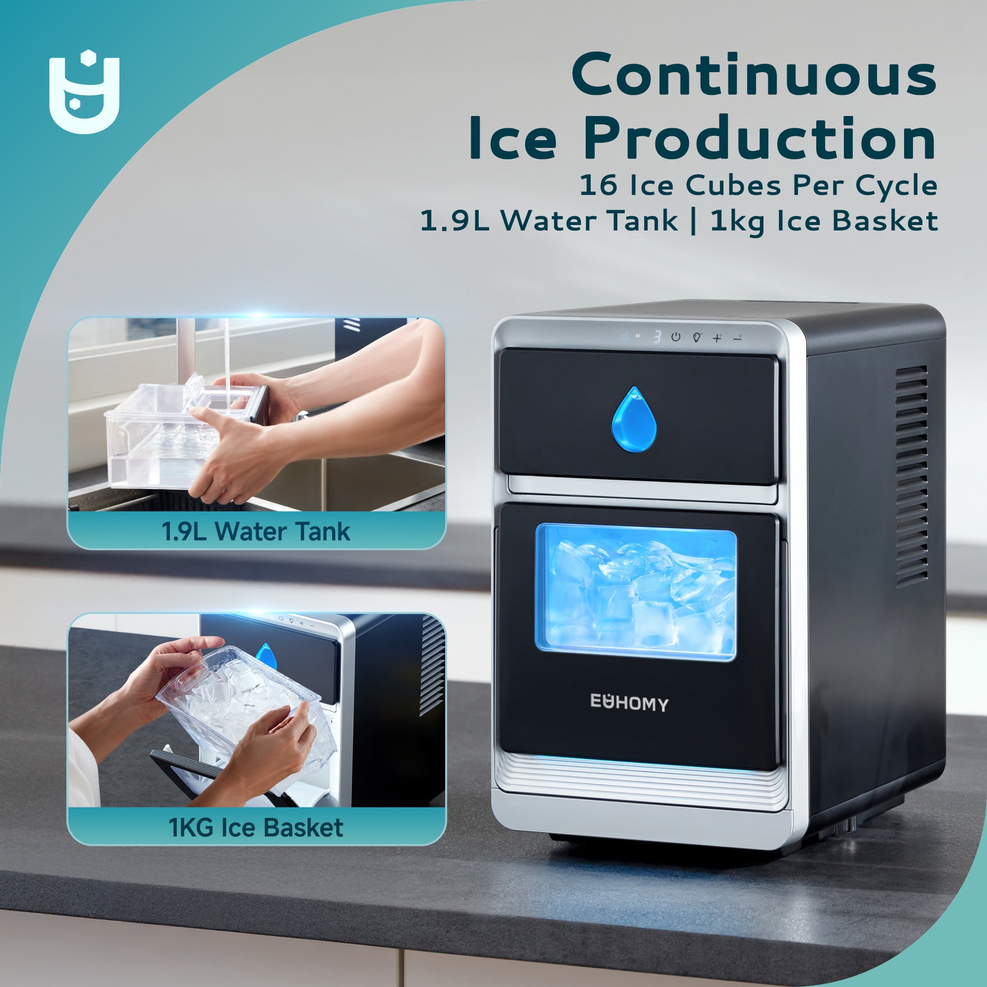 Introducing the EUHOMY 28lbs Crescent Ice Maker, engineered for dependable ice production in any home or office environment. With the ability to generate 16 crescent-shaped ice cubes every 15 minutes and up to 22 lbs in 24 hours, it’s a compact powerhouse tailored for daily use. The adjustable thickness function, smart timer, and auto-cleaning mode offer personalized convenience and peace of mind. Its 2L water tank and 2.2 lbs bin capacity allow for extended operation without constant attention. Blending sleek design and user-friendly features, EUHOMY continues its legacy of making modern living easier and more efficient through purposeful innovation.