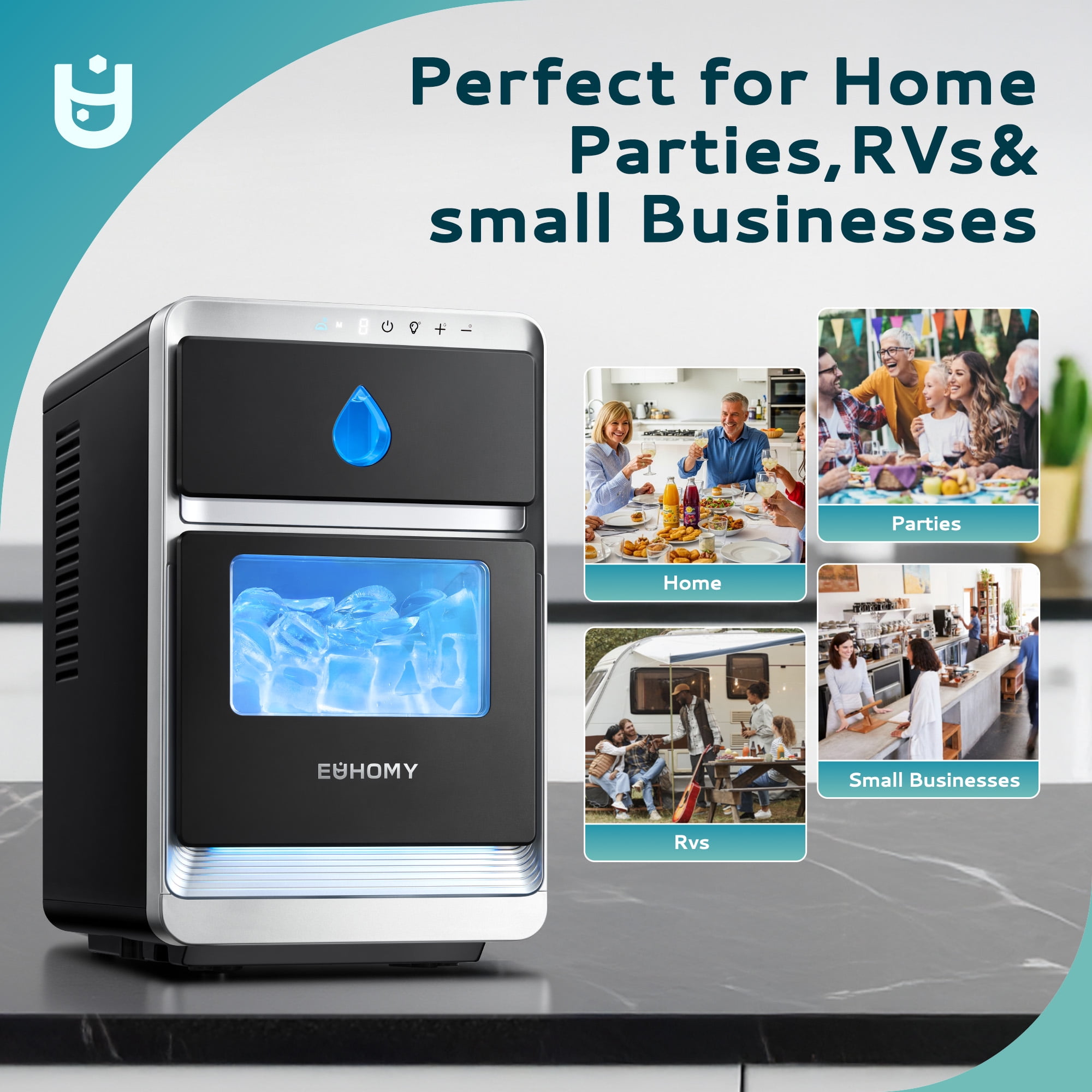 QUICK DAILY ICE – Designed for high efficiency, the EUHOMY Crescent Ice Maker produces up to 30 lbs of ice per day, with 16 pieces ready in just 12 minutes. Perfect for busy households or small offices, this machine ensures you always have ice on demand—no delays, no shortages. SLOW-MELTING ICE – Unlike bullet or nugget ice, EUHOMY’s crescent-shaped cubes melt up to 30 minutes slower, keeping your drinks colder for longer without dilution. Ideal for cocktails, sodas, or iced coffee, it delivers bar-quality results at home. COMPACT YET CAPACIOUS – Equipped with a 2L water reservoir and a 2.2 lbs ice storage bin, this unit offers a practical balance of size and storage. Its space-conscious design fits neatly on countertops in kitchens, break rooms, RVs, or anywhere ice is needed without sacrificing performance. CUSTOM ICE THICKNESS – Take control with adjustable ice thickness settings, letting you create ice that suits every need—from fast-chilling beverages to longer-lasting ice for food preservation. The intuitive timer function allows for scheduled ice cycles, perfect for routine convenience. HYGIENIC SELF-CLEANING – The built-in self-cleaning system maintains freshness and minimizes manual cleaning effort. This feature ensures clean, odor-free ice production, promoting a healthier environment and extending the machine’s lifespan. INTUITIVE STATUS INDICATORS – Stay informed with three simple indicator lights that clearly show when the water is low, the bin is full, or it’s time to clean. No more second guessing—just reliable updates that help you manage your ice supply with ease.