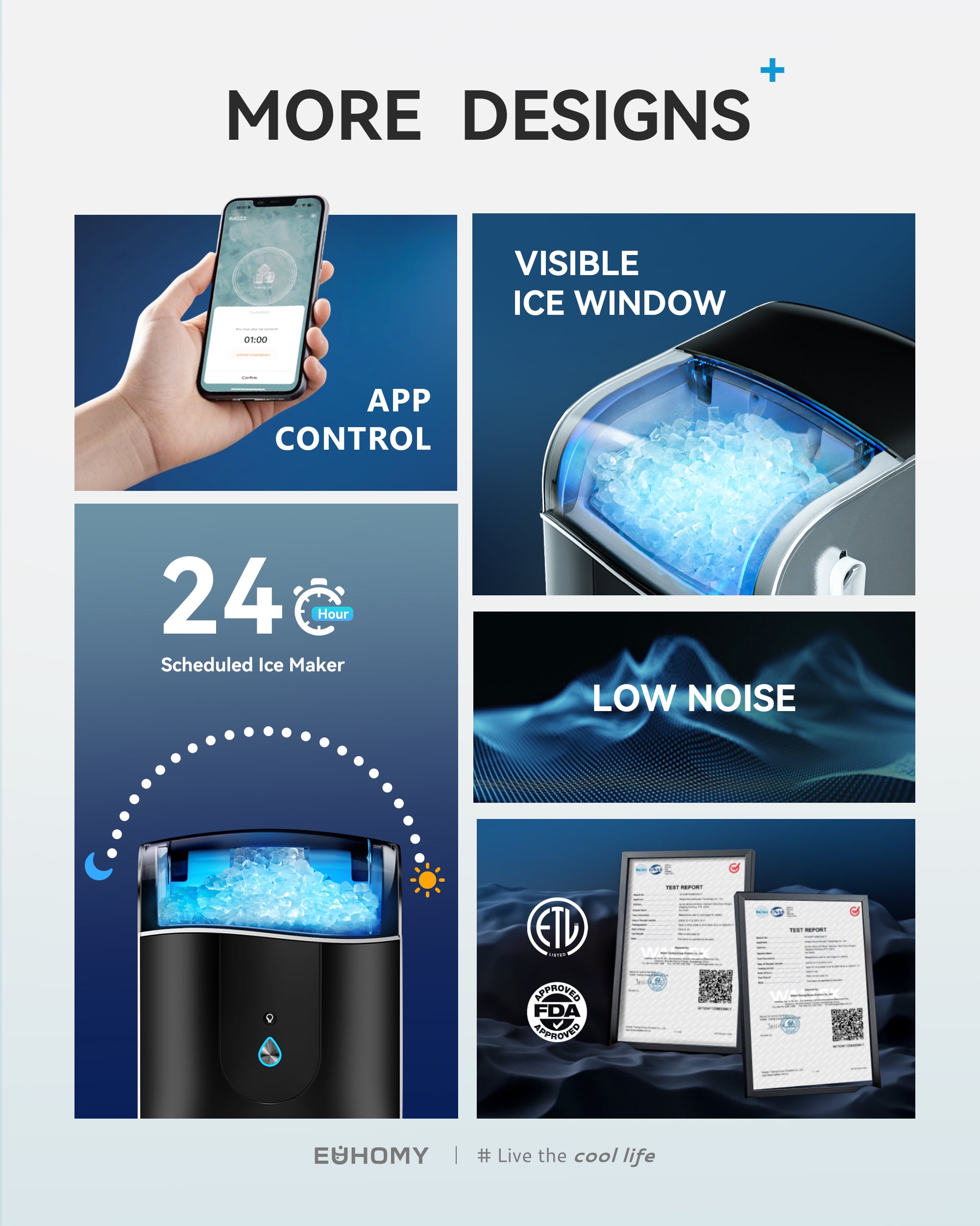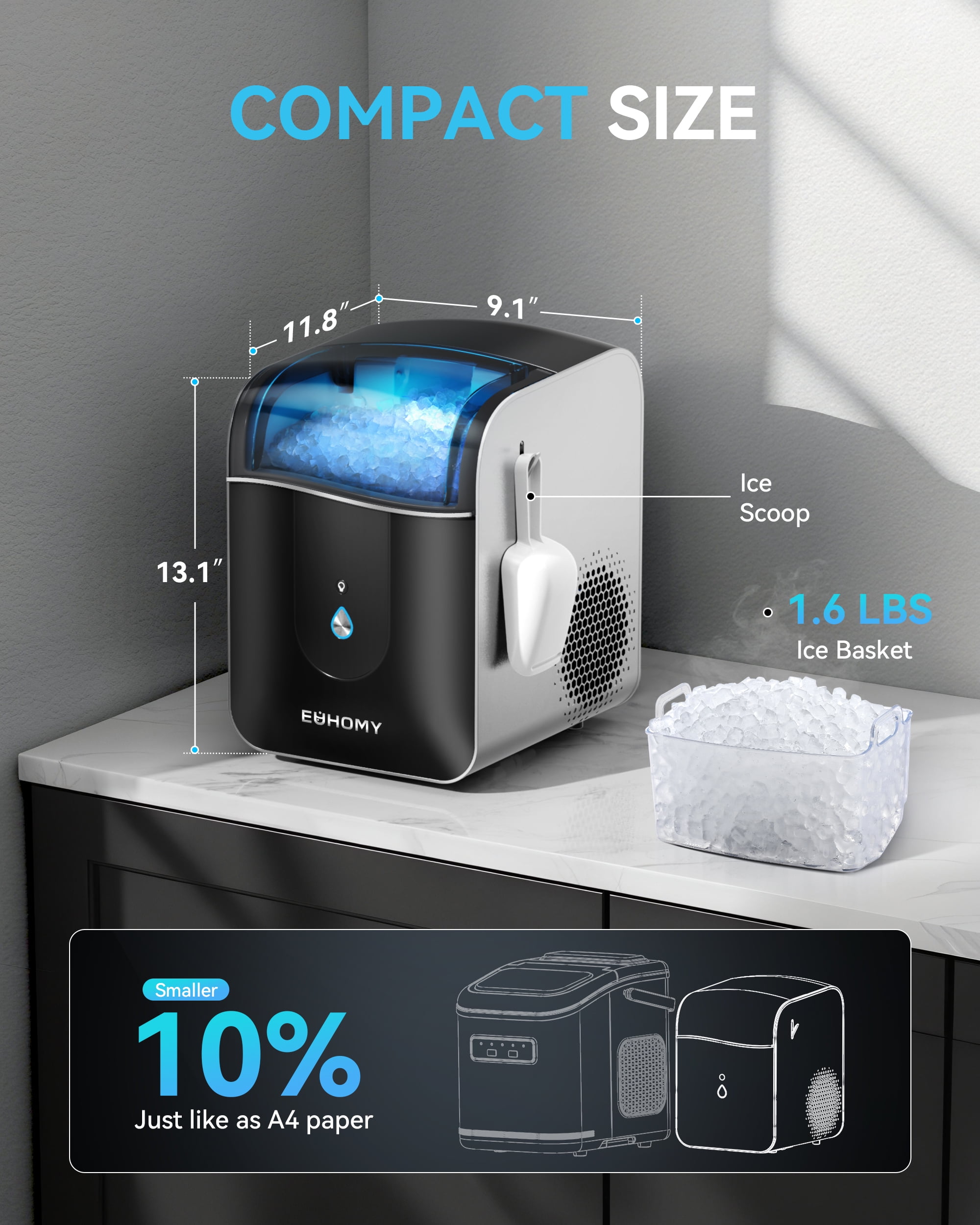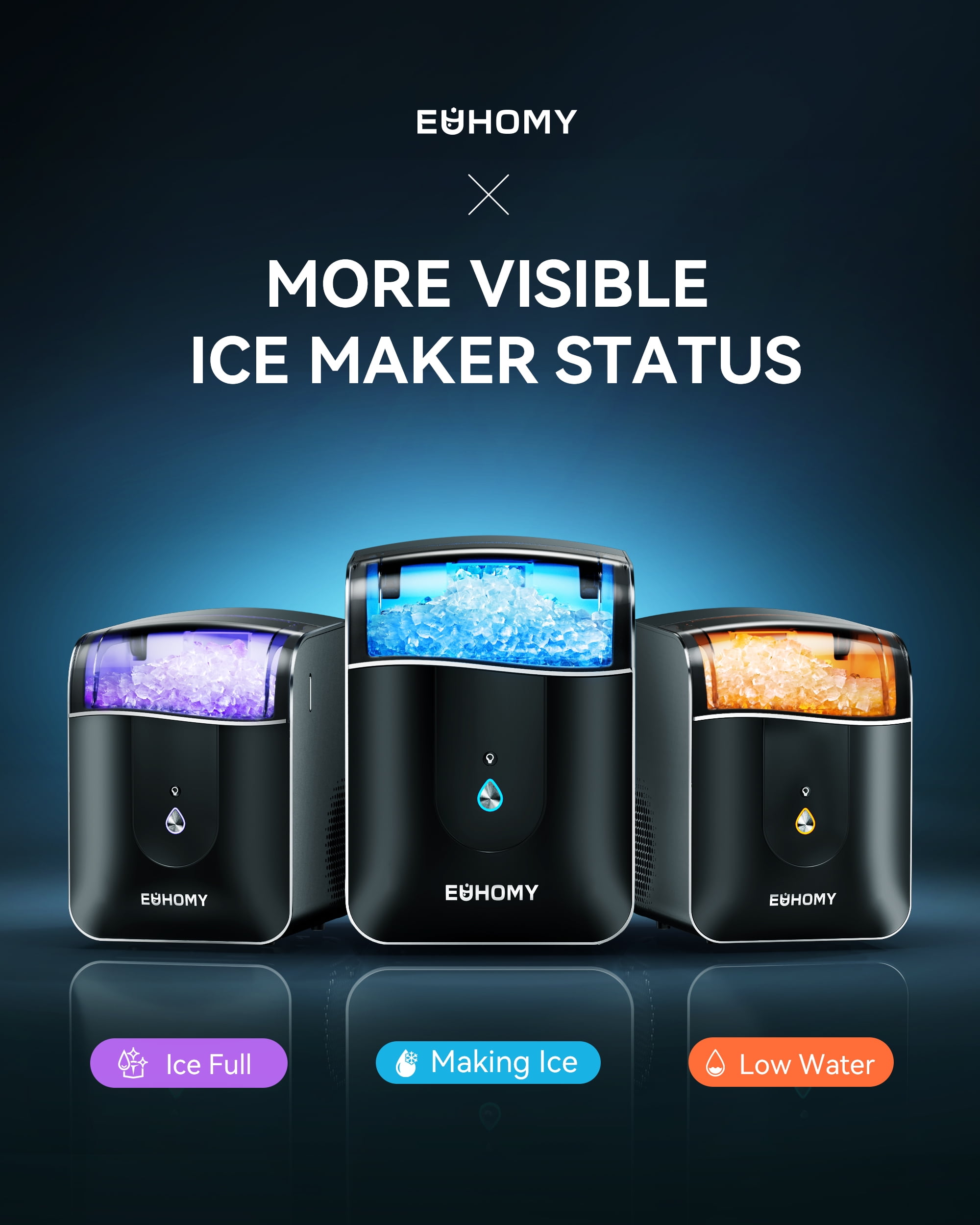 The EUHOMY 40lbs Nugget Ice Maker with APP Control delivers fast, chewable nugget ice in just 15 minutes and up to 40 pounds per day. Featuring smart app and touch control, self-cleaning, a 1.1L water reservoir, and a 6lbs bin, it’s the perfect solution for homes, offices, RVs, and more. The compact black design fits seamlessly on countertops, while its quiet performance and hygiene-focused features make it an everyday essential. Backed by EUHOMY’s reputation for quality and innovation, this ice machine elevates your ice-making experience.