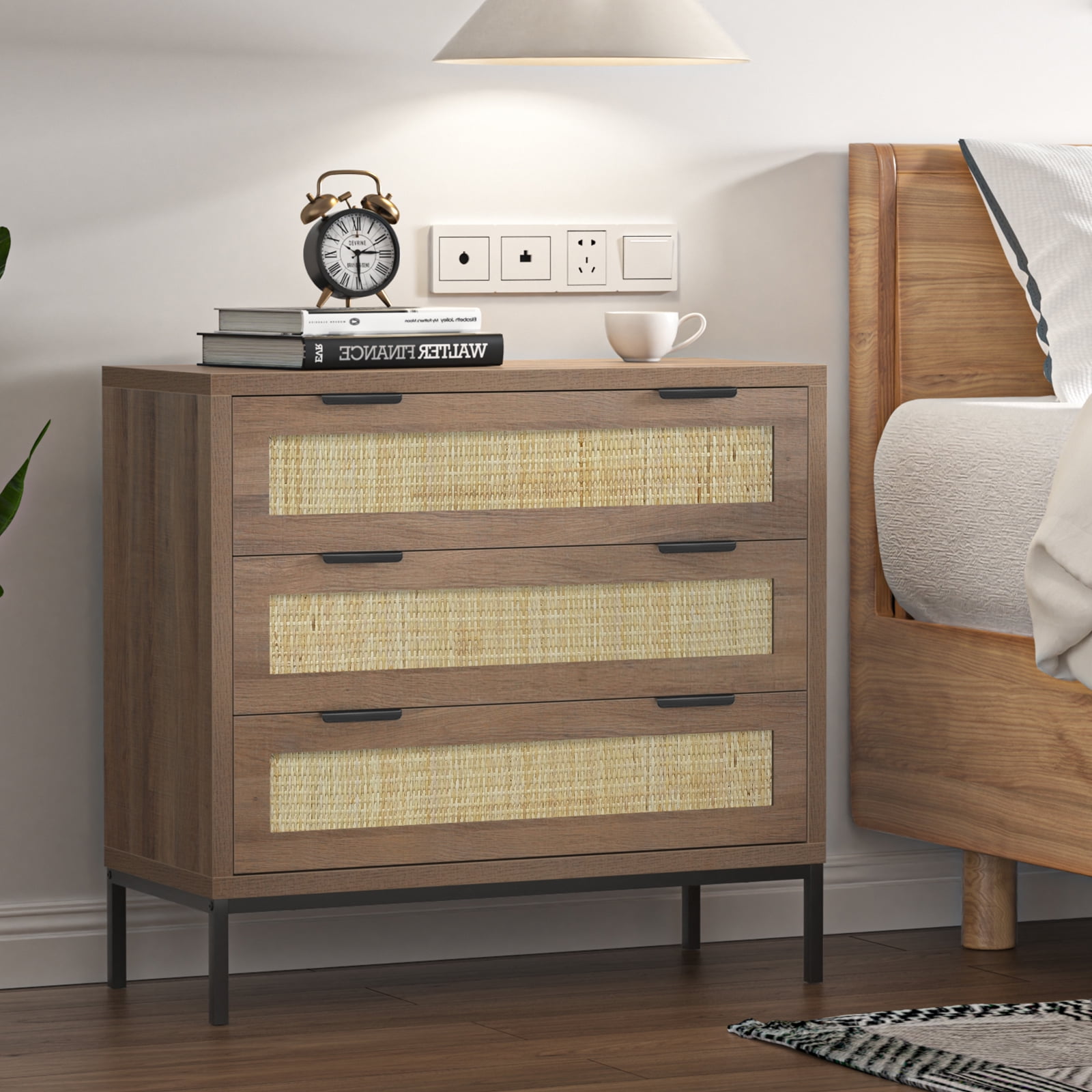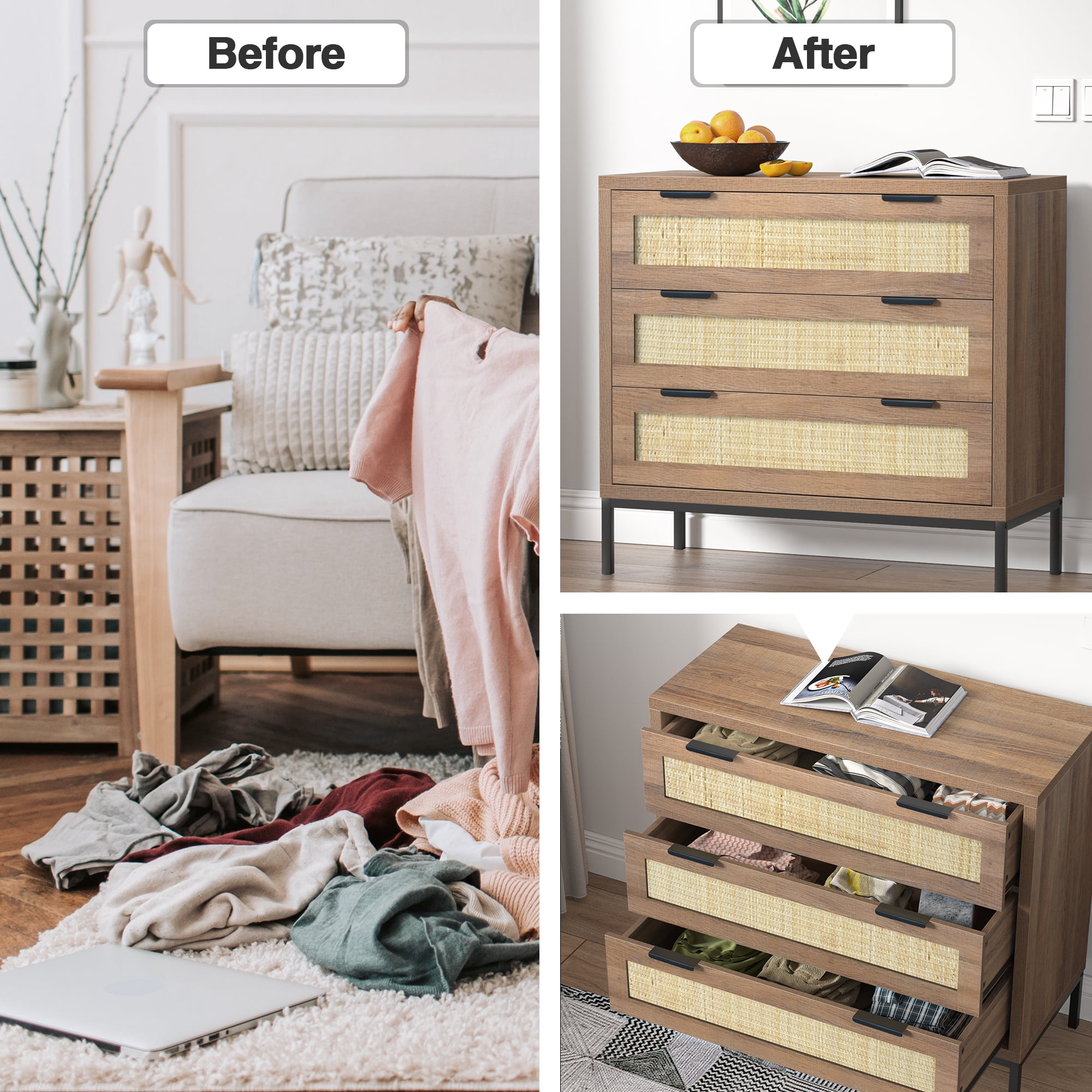 Add a perfect size of Eumyviv Mid-Century 3-Drawer Dresser Chest for your home! Feature 3 drawer design that is the perfect storage compartment for organizing all of your clothing and linens in the bedroom. It combines elegant styling with abundant organized storage inside and out. Whether you need drawer space or display space, this collection can offer you both. Ingenious profile matches well with any cozy, intimate room setting. Made from high-grade PB material, it keeps stability for a long life span. Don’t hesitate to BE IMPRESSED WITH IT! Rustic and practical design High-quality PB and natural rattan material 3-drawer dresser with ample storage Stable and durable Ideal for bedroom, living room, and hallway Assembly required with detailed instructions Note: For any damages, defects, or missing parts, please contact us for the first time. We will get back to you within 24 hours. Rest assured that we will give you a satisfactory solution.