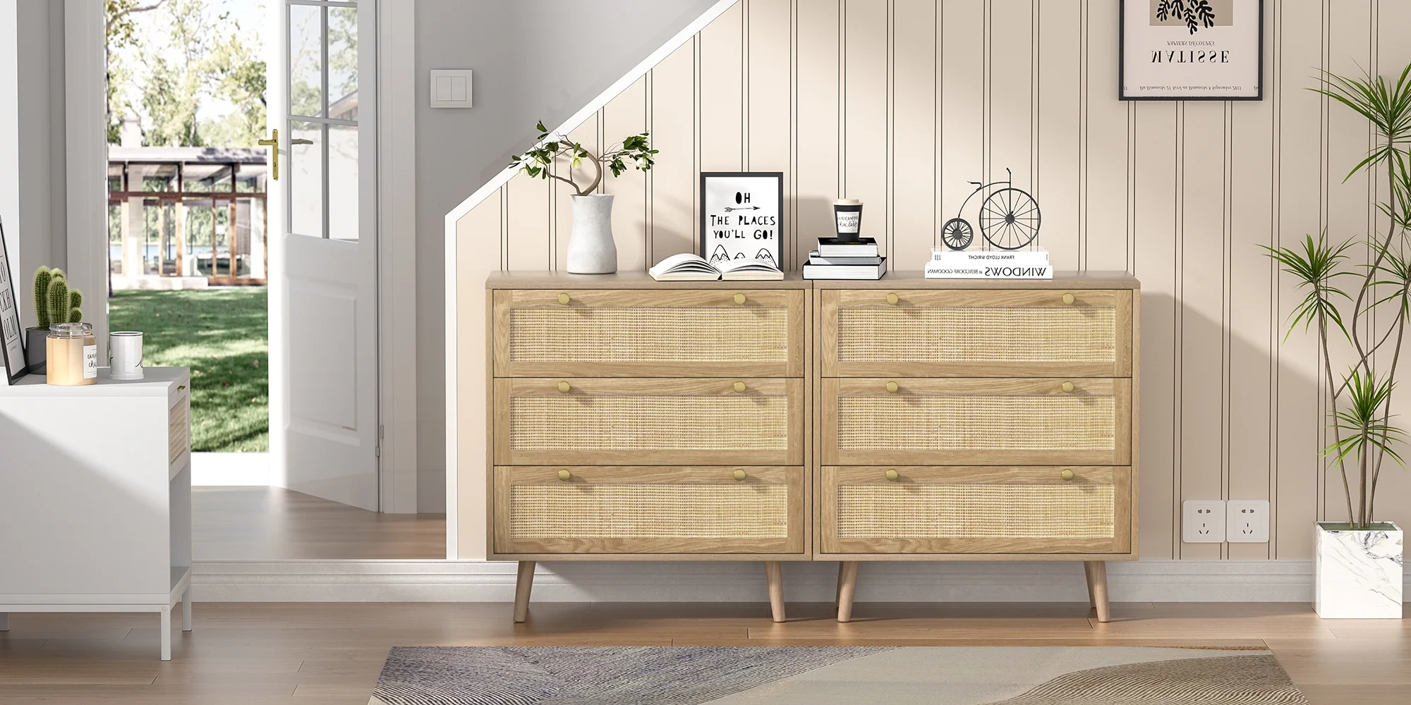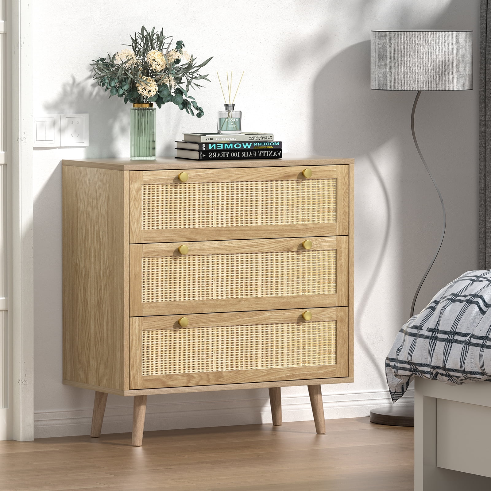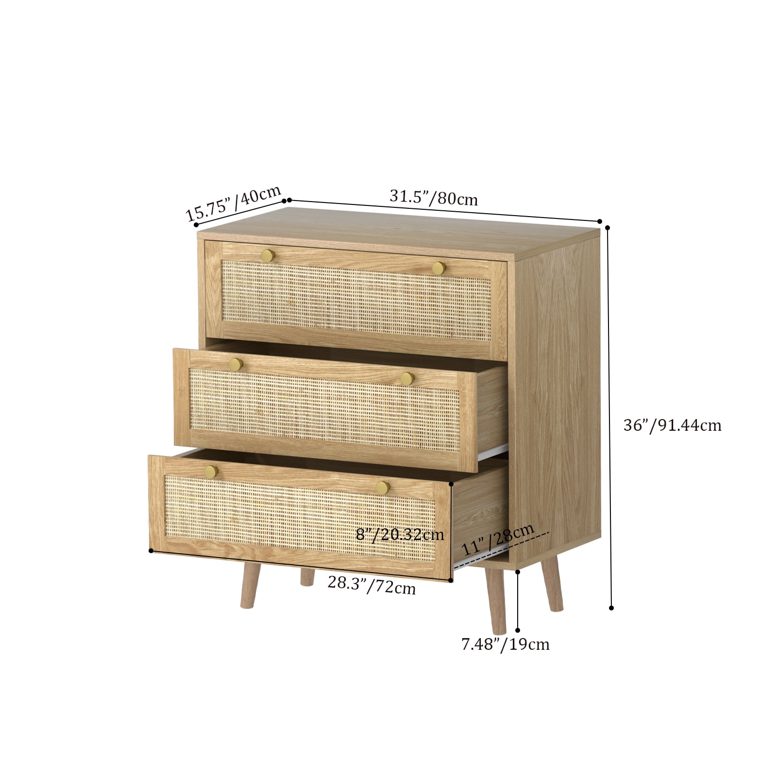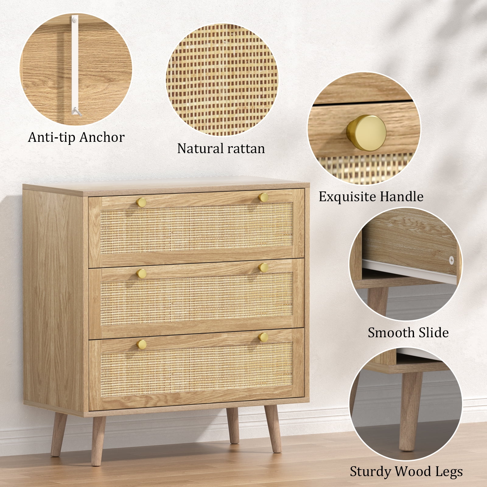 Add a perfect size of Eumyviv 3-Drawers Dressers Chest for your home! Feature 3 drawer with oak rattan design that is the perfect storage compartment for organizing all of your clothing and linens in the bedroom. It combines elegant styling with abundant organized storage inside and out. Whether you need drawer space or display space, this collection can offer you both. Ingenious profile matches well with any cozy, intimate room setting. Made from high-grade PB material, it keeps stability for a long life span. Create a better life with Eumyviv! Wooden farmhouse accent chest with natural rattan. Combines modern and Bohemian element makes your home look more stylish. Overall dimension of this 3-drawer chest is 31.5” W x 15.7” D x 35.4” H. Three large smooth-gliding drawers designed with a wide display top give you ample space to meet your storage and organizing needs. Gold knob handles and natural rattans keep the piece feeling fresh. Tapered solid wood legs can make the chest of drawers stands stably on the floor. Featuring a compact size and sleek appearance, this storage chest also can be used as a nursery dresser, bedroom dresser or even as a tall nightstand or end table. There is an anti dumping device on the back of the chest to ensure the safety of kids or pets. Name: 3 Drawer Dresser Style: Vintage Cabinet Color: Oak Cabinet Material: PB+ Rattan Number of Drawers: 3 Assembly: Assembly Required Number of packages:1 Packing list: 3 Drawer Dresser x 1