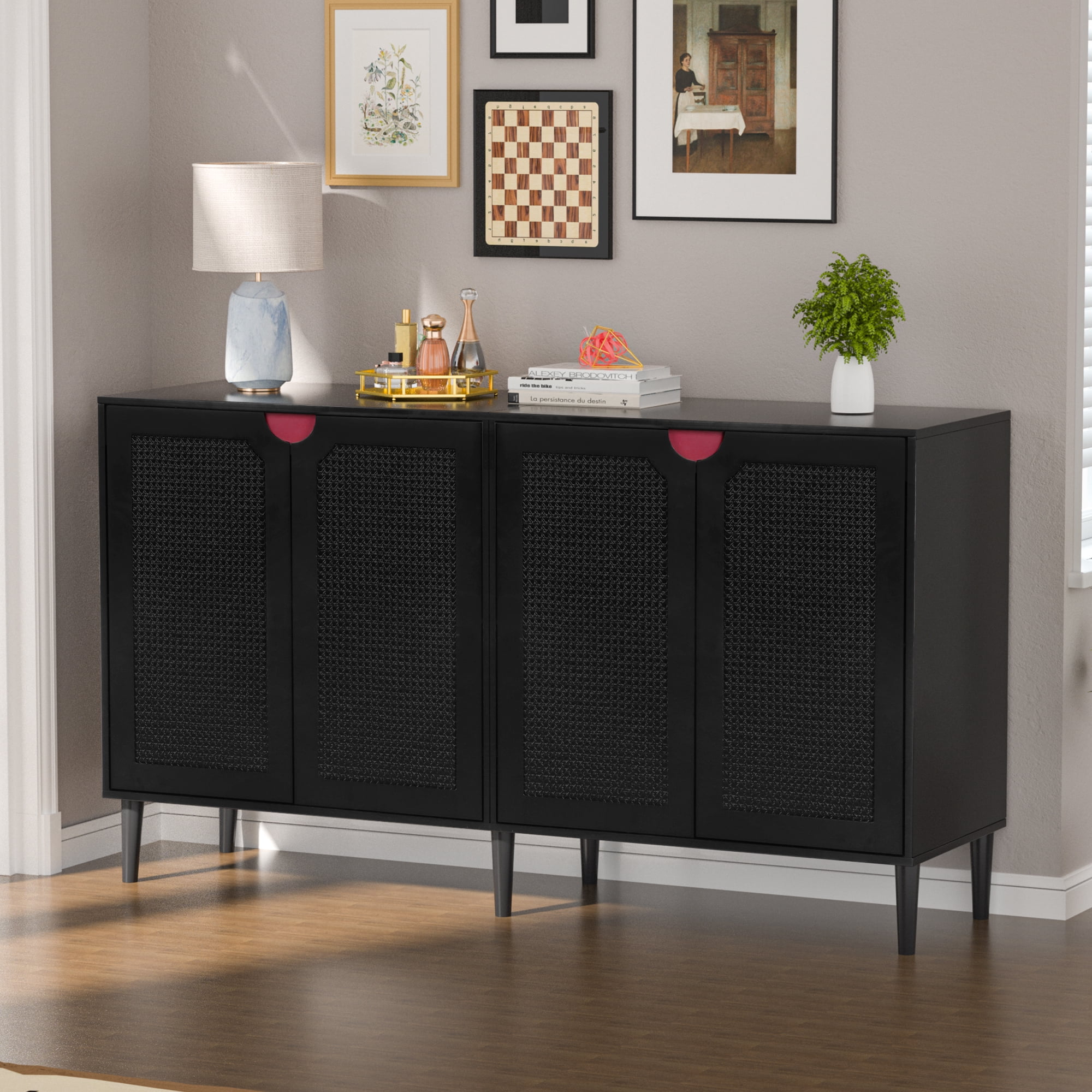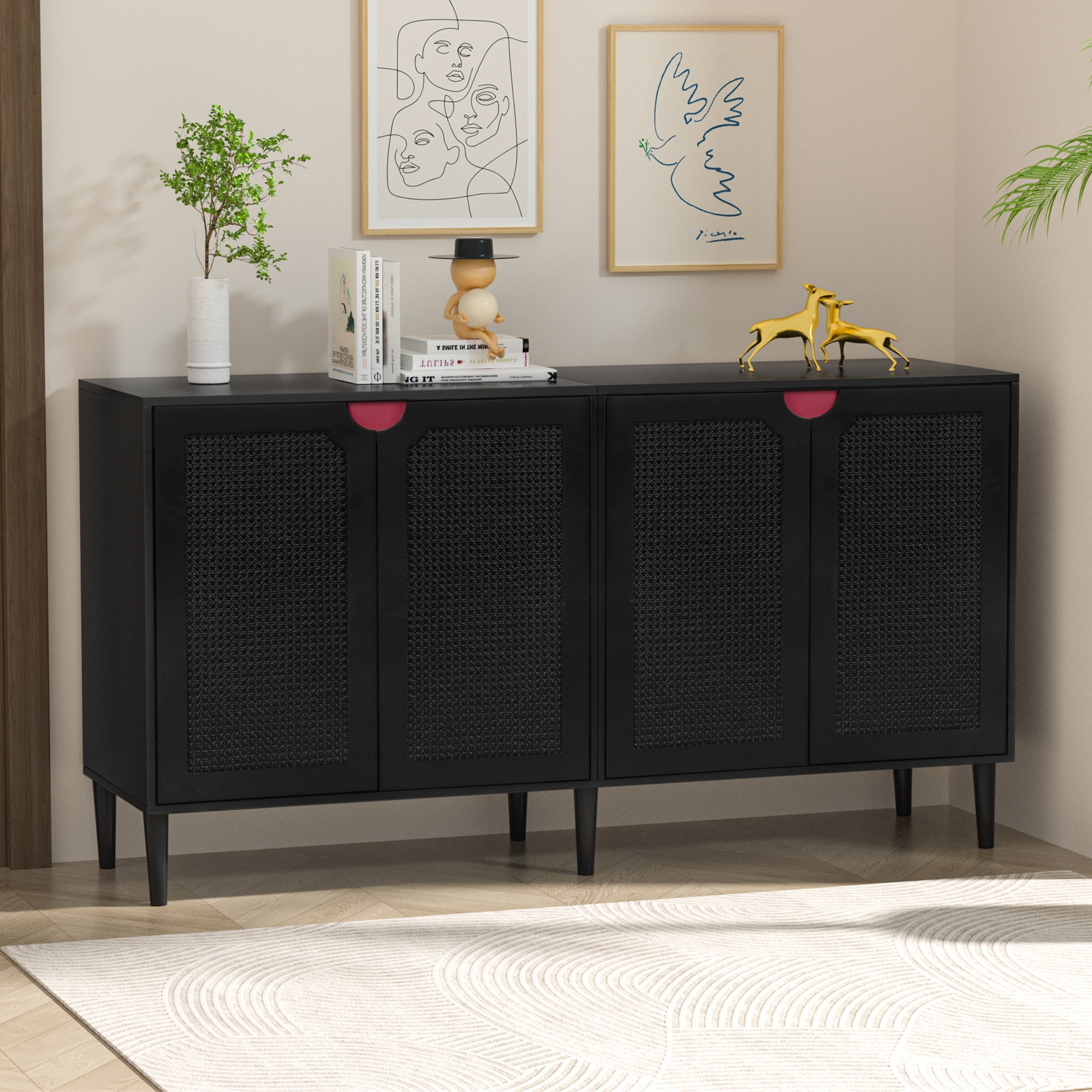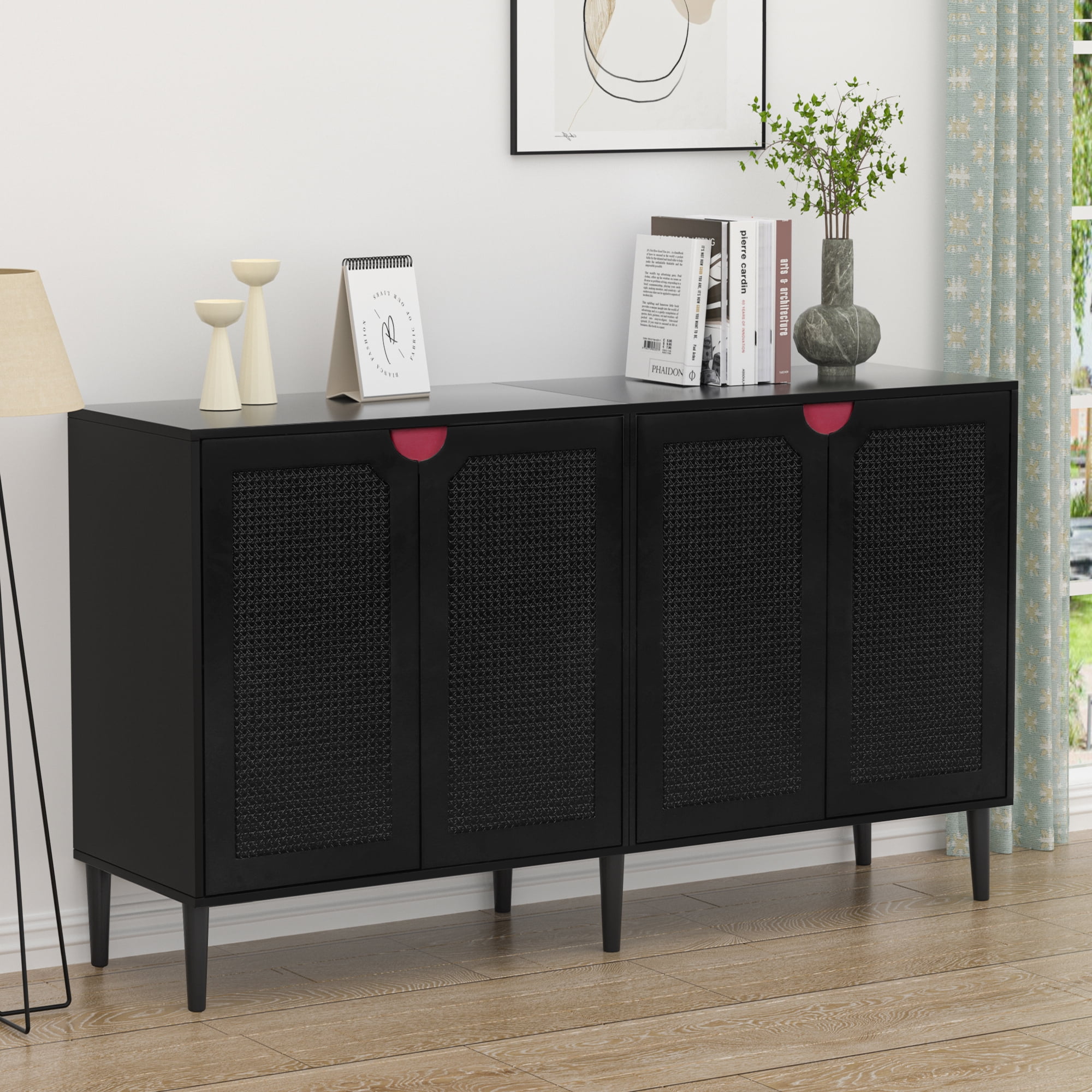 Eumyviv Mid Century Storage Cabinet, Rattan Buffet Sideboard with 4 Doors for Kitchen Living Room Bedroom Hallway, Black H0108